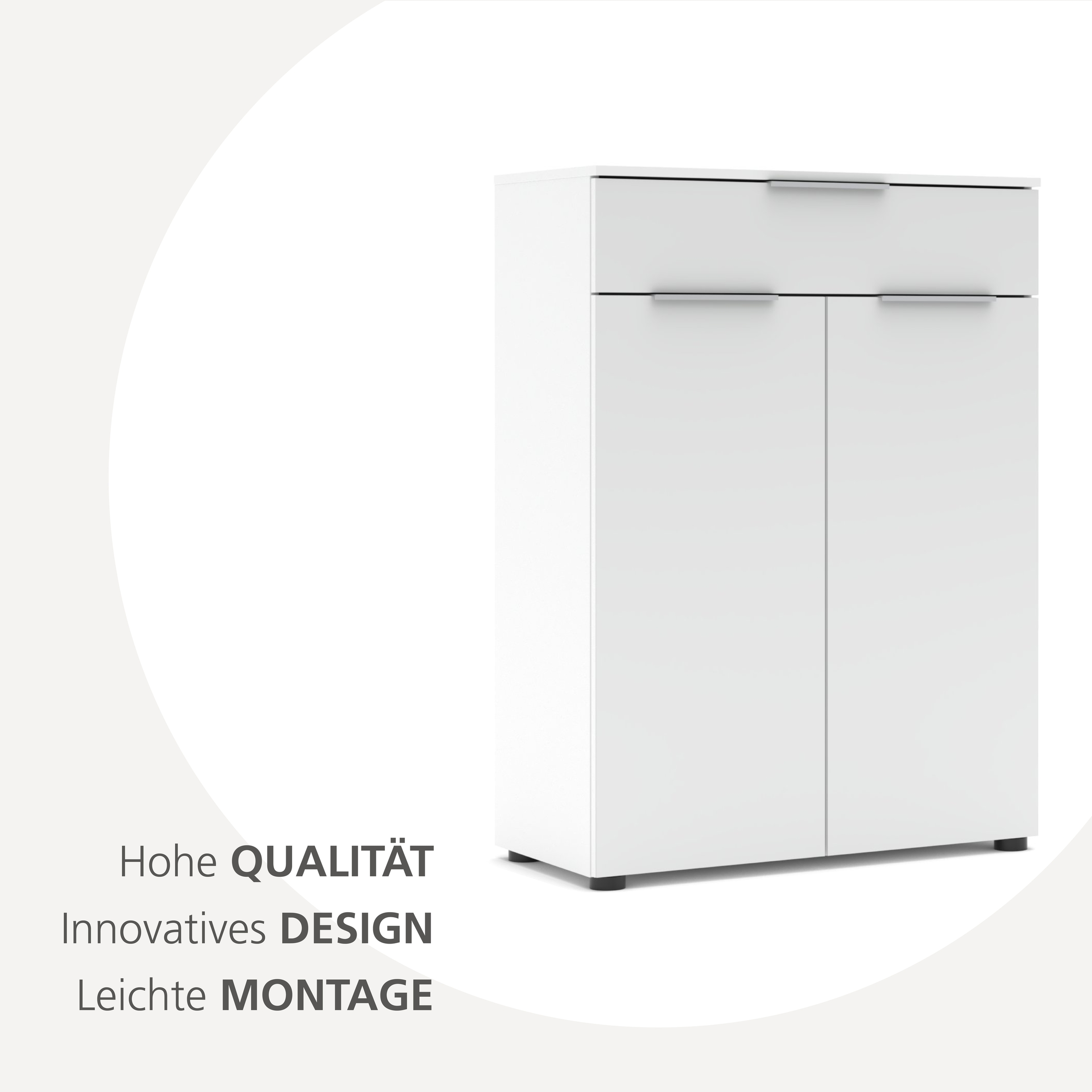 Neben den sechs offenen Fächern verfügt Santorin über eine praktische Schublade mit Softclose-Funktion und Selbsteinzug. Diese ermöglicht ein sanftes und geräuscharmes Schließen und eignet sich ideal zur Aufbewahrung kleinerer Büroutensilien wie Schreibmaterial oder Dokumente. Die glänzenden Metallgriffe in Chrom setzen dezente, elegante Akzente und runden das Gesamtbild harmonisch ab.