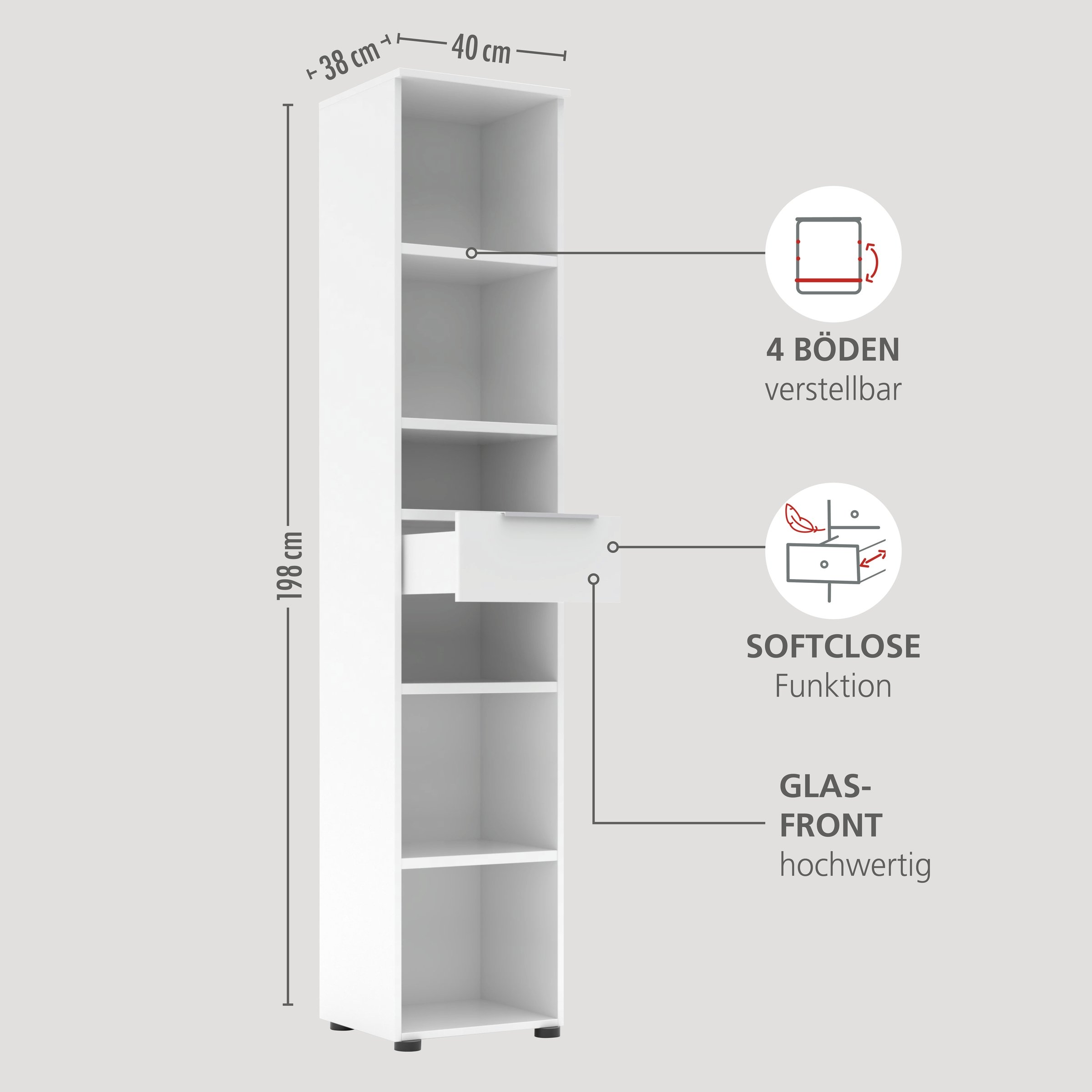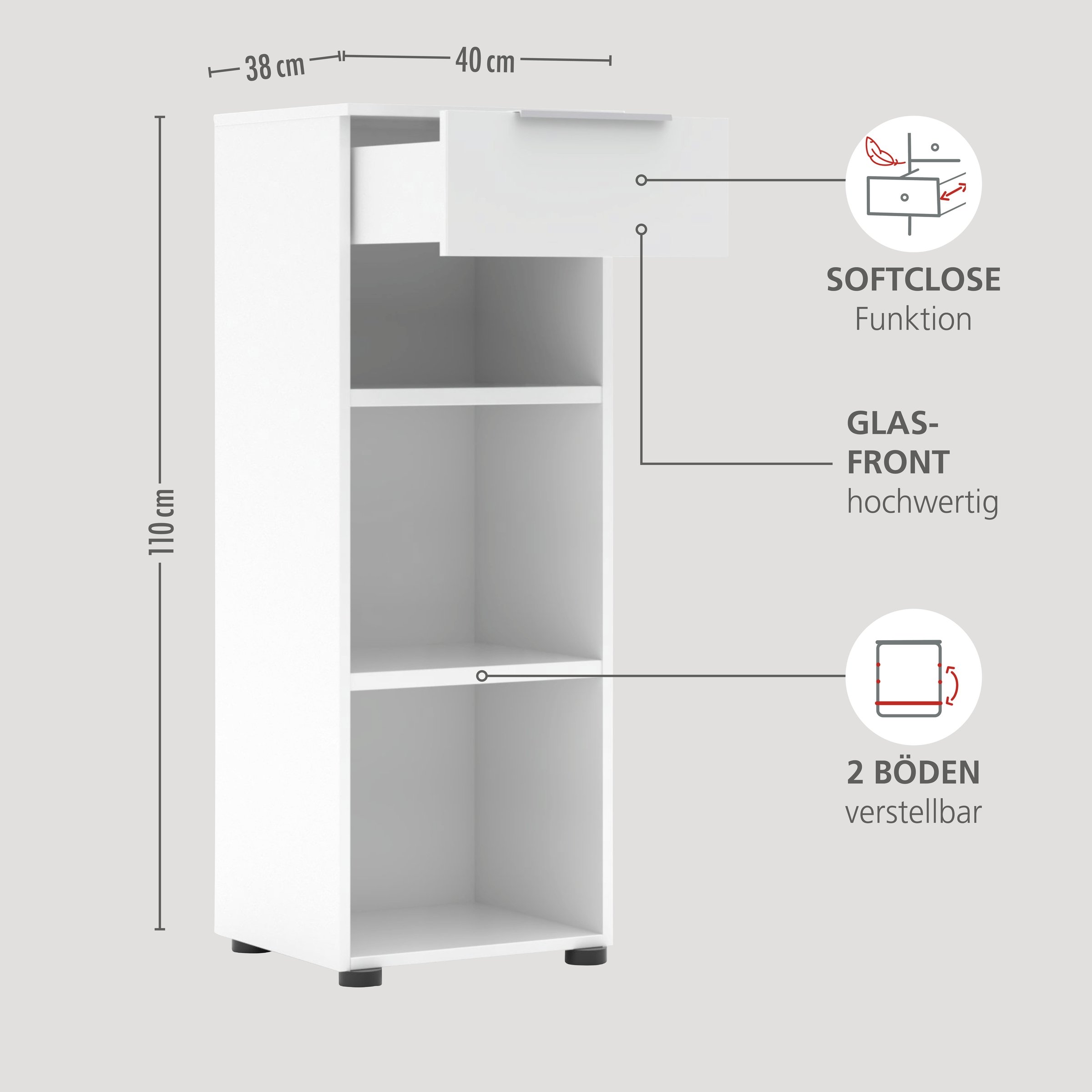 Die Softclose-Funktion der Tür sorgt für einen geräuschlosen und komfortablen Gebrauch im Alltag. Die helle Farbgebung in Weiß und die Glasfront verleihen dem Schrank eine zeitlose Optik, die sich harmonisch in verschiedene Einrichtungskonzepte einfügt.