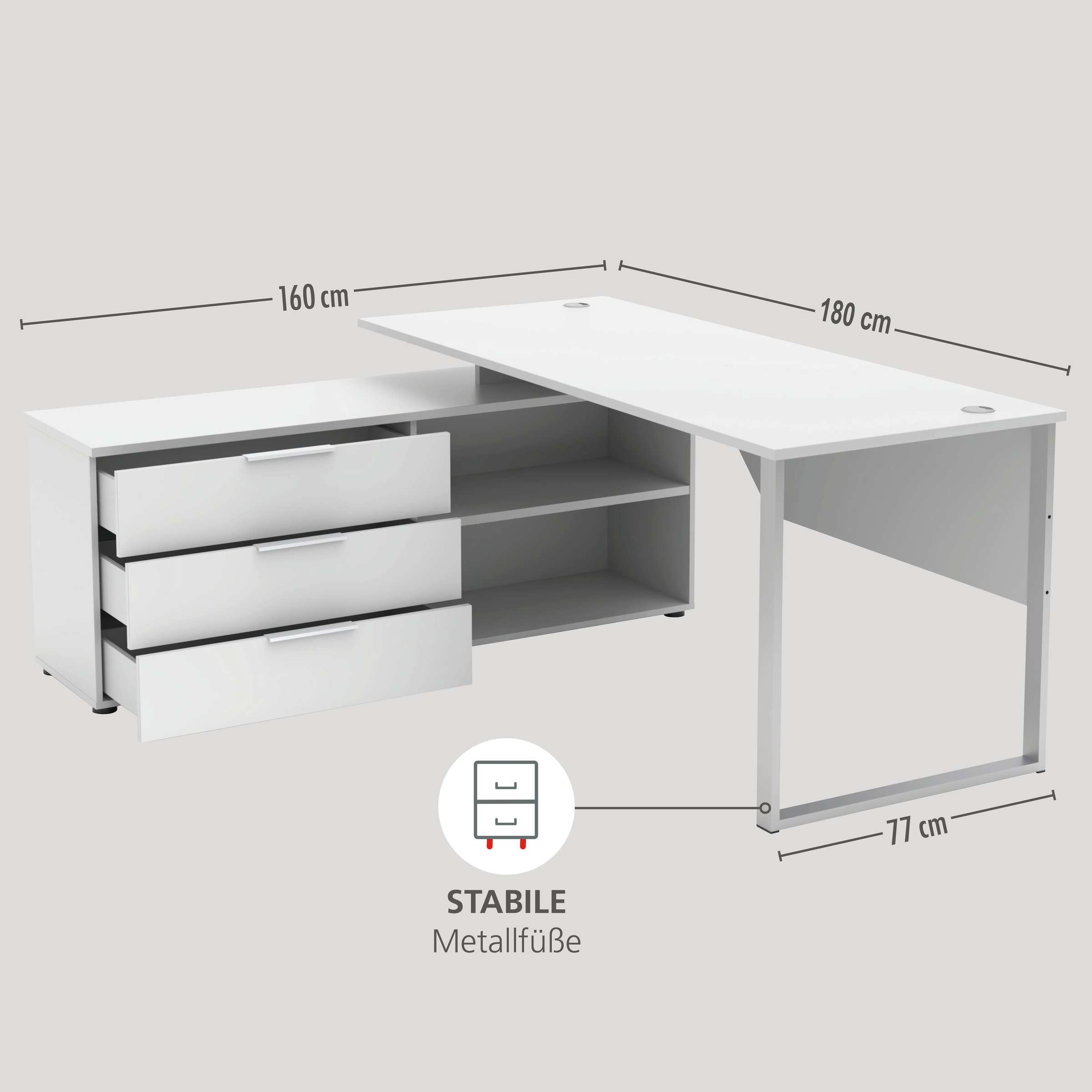 [cWert] => Großzügige Maße von 170/77/73 cm (B/H/T) bieten viel Arbeitsfläche für Homeoffice, Büro oder Jugendzimmer und ermöglichen komfortables, strukturiertes Arbeiten mit ausreichend Platz.;Moderne Optik in Weiß mit silberfarbenen Metallfüßen – ideal kombinierbar mit verschiedenen Einrichtungsstilen von minimalistisch bis zeitgemäß und funktional gestaltet.;Robuste beschichtete Spanplatte aus Holzwerkstoffen mit widerstandsfähiger Melaminbeschichtung – pflegeleicht, strapazierfähig und für den täglichen Gebrauch geeignet.;Integrierte 2 Kabeldurchlässe in der Tischplatte sorgen für eine ordentliche Kabelführung und unterstützen einen aufgeräumten Arbeitsplatz ohne sichtbaren Kabelsalat.;Lieferung erfolgt zerlegt in 2 Packstücken inklusive Aufbauanleitung – einfache Selbstmontage für einen schnellen und unkomplizierten Aufbau im Wunschraum.
