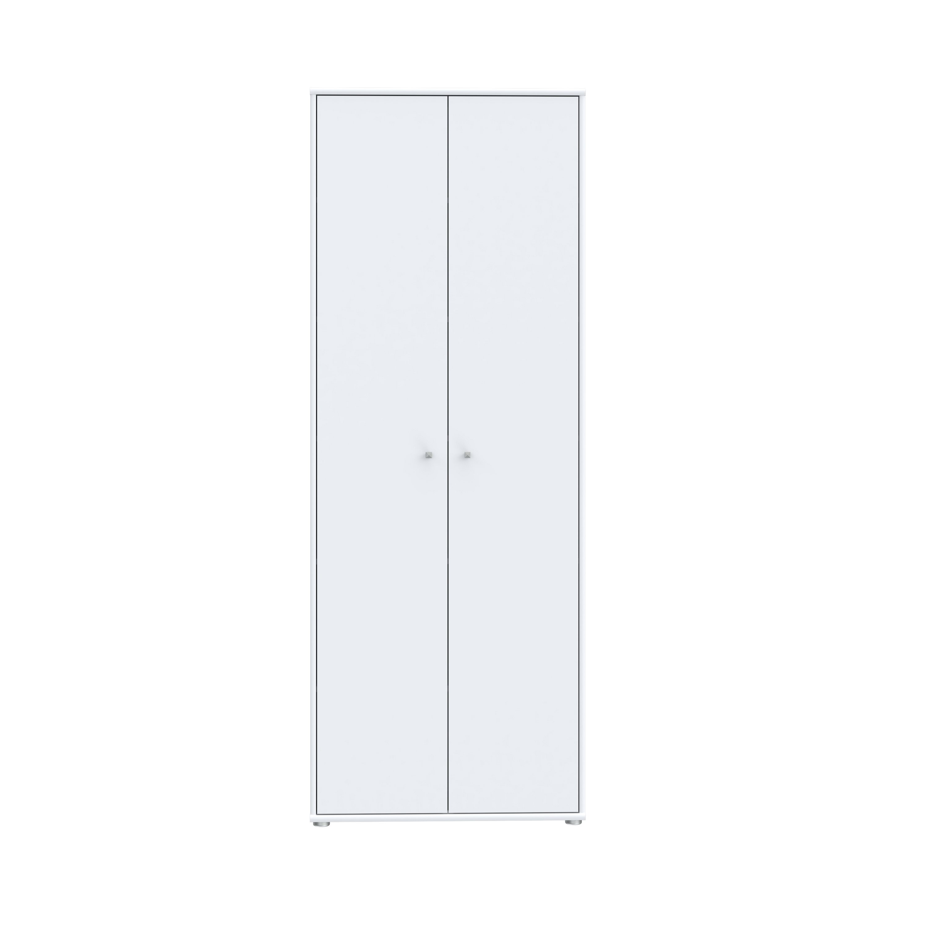 Gefertigt aus Spanplatte mit weißen Fronten und Korpus sowie Griffen im Alu-Look verbindet der Aktenschrank pflegeleichte Oberflächen mit einem modernen Erscheinungsbild. Mit Maßen von ca. 73,7 x 197,5 x 34,8 cm (B/H/T) nutzt er die Raumhöhe optimal und benötigt dabei nur wenig Grundfläche.
