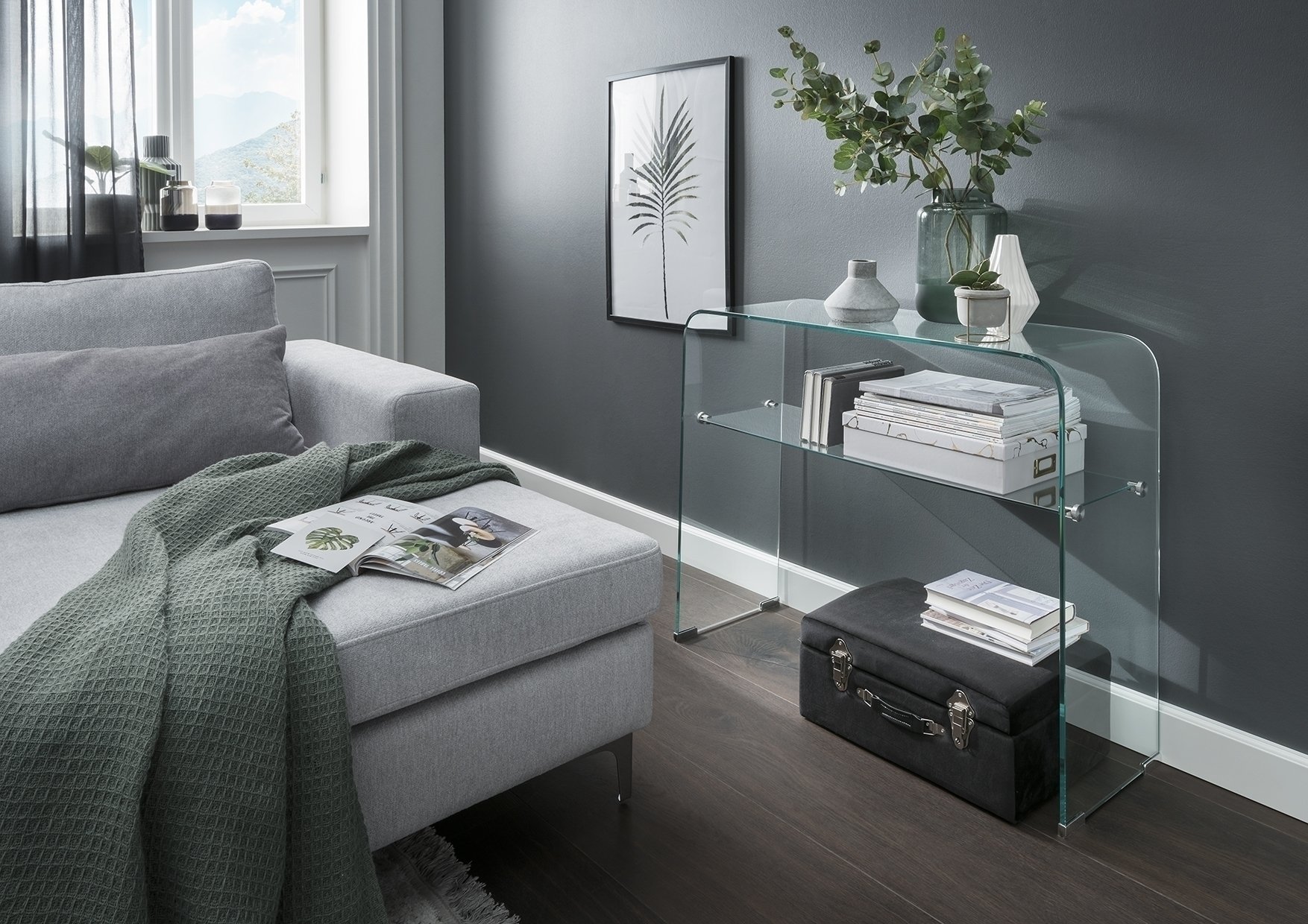 Gefertigt aus hochwertigem Klarglas wirkt die Anrichte besonders leicht und modern. Das formgebogene Glasregal setzt einen stilvollen Akzent und schafft zusätzliche Ablagefläche, ohne den Raum optisch zu überladen.