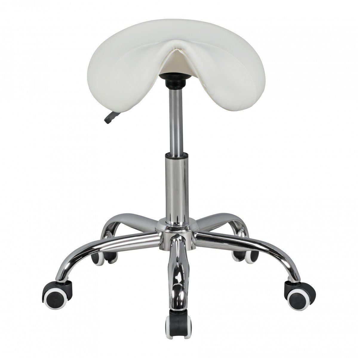 Dieser Sattelhocker mit Rollen ist ein praktischer Arbeitshocker für alle, die flexibel sitzen und sich dabei frei bewegen möchten. Die in Sattelform gestaltete Sitzfläche aus weißem Kunstleder sorgt für eine bequeme Sitzposition und bietet viel Bewegungsfreiheit für die Beine.