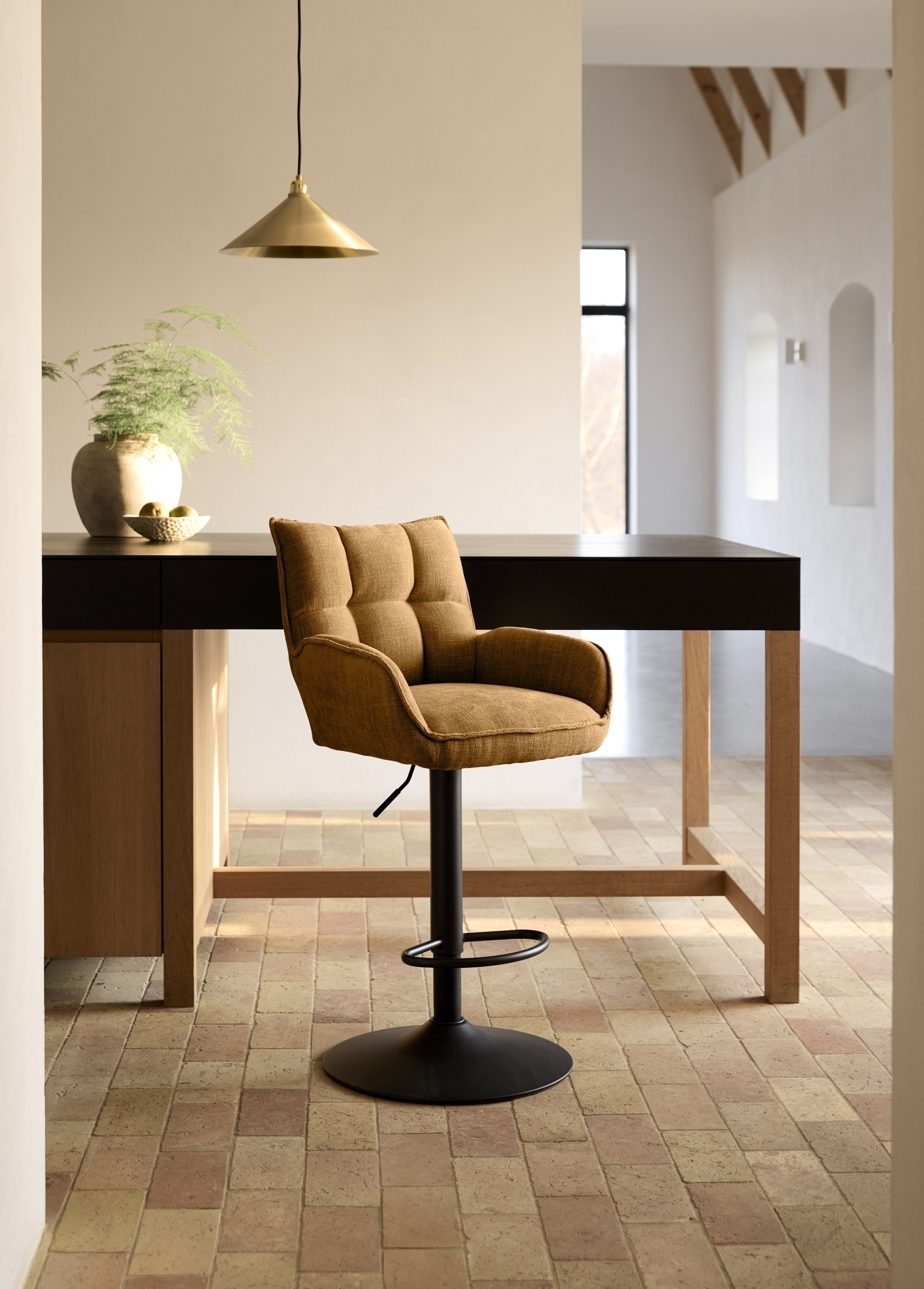 [BulletPoints] => Maße: Der Barhocker Avola hat eine Höhe von 113,5 cm, eine Sitzhöhe von bis zu 82 cm und eine Sitzbreite von 38 cm. Er eignet sich somit perfekt für hohe Theken und Bars.;Der Bezug des Barhockers ist aus 100% Polyester in Chenille-Optik und bietet einen leichten antiken Effekt. Er ist robust und pflegeleicht, ideal für den täglichen Gebrauch.;Mit einem stabilen Trompeten-Gestell aus Stahl in Schwarz bietet der Avola Barhocker optimale Stabilität und eine maximale Belastbarkeit von 110 kg.;Die Armlehnen des Avola Barhockers sind schräg nach vorne abfallend und mit einer Höhe von 10 cm bieten sie zusätzlichen Komfort ohne den Sitzbereich zu überladen.;Der Barhocker wird im zerlegten Zustand geliefert und lässt sich einfach montieren. So wird der Versand erleichtert und der Aufbau ist schnell und unkompliziert.