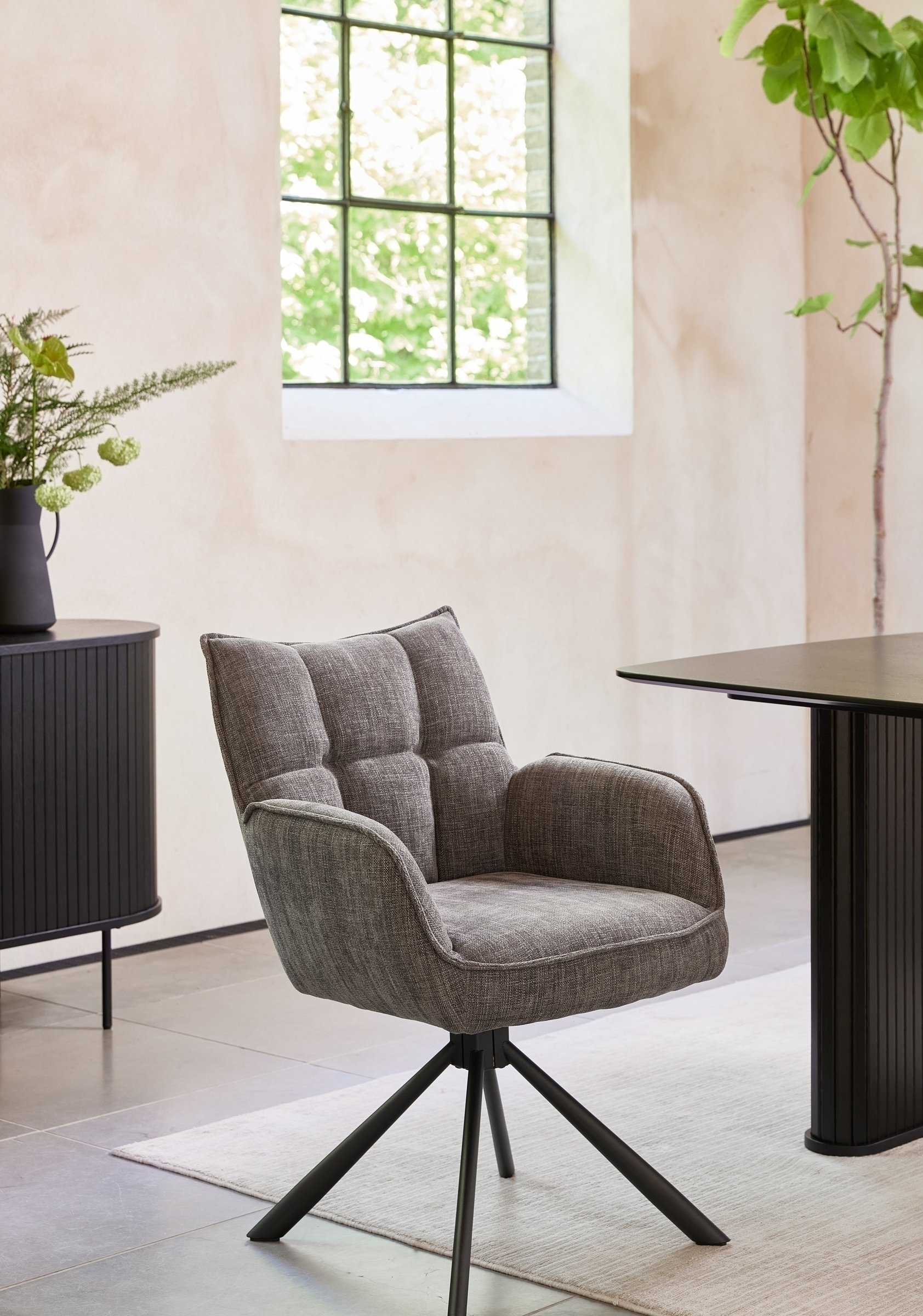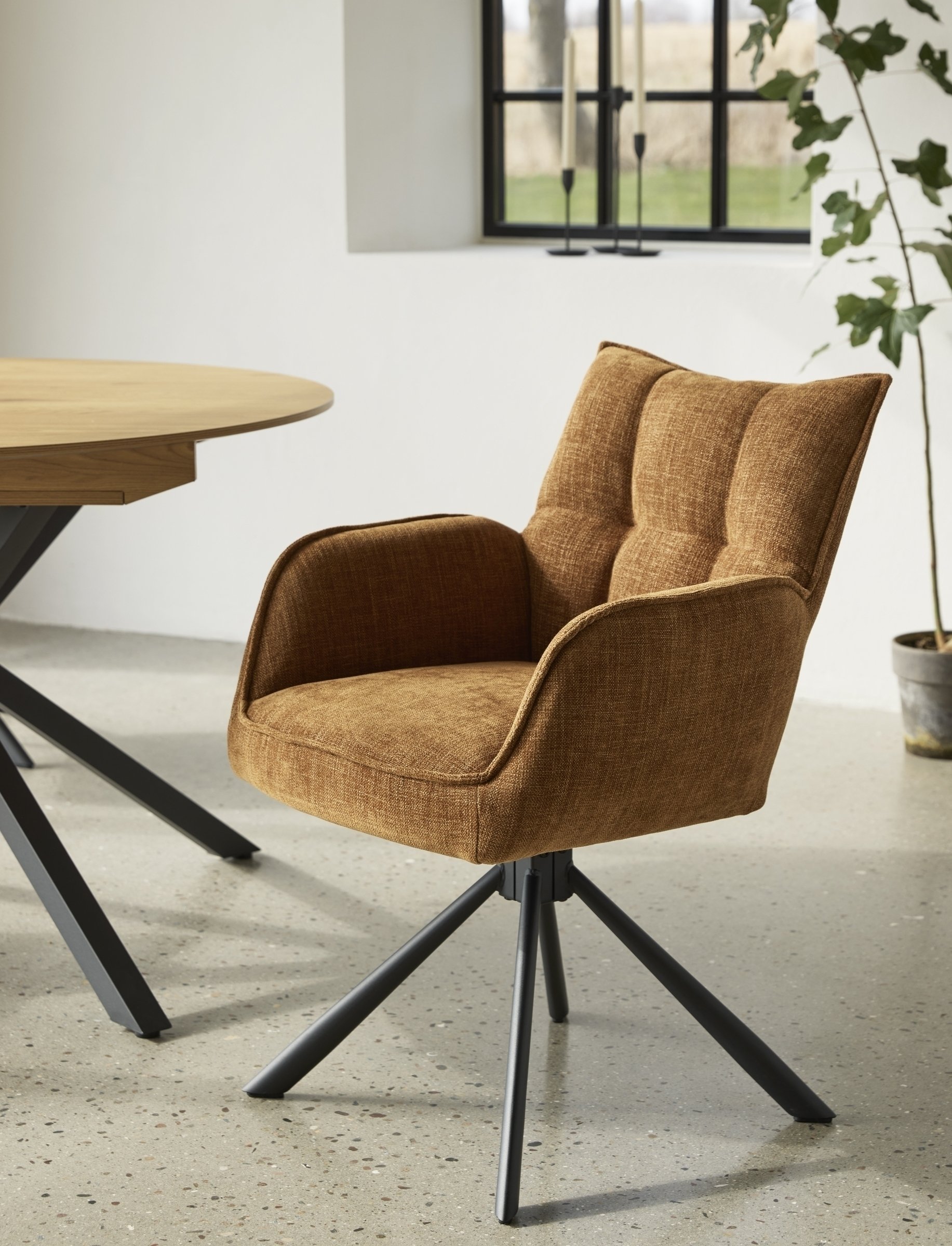 Die markante Waffelsteppung im Rücken und der hochwertige Bezug in Chenille-Optik mit leichtem Antik-Effekt machen Marilla zu einem Blickfang mit hohem Komfortfaktor. Die 360° drehbare Sitzschale mit Auto-Return-Funktion erleichtert den Alltag, da sich der Stuhl nach dem Aufstehen automatisch in seine Ausgangsposition zurückdreht.
