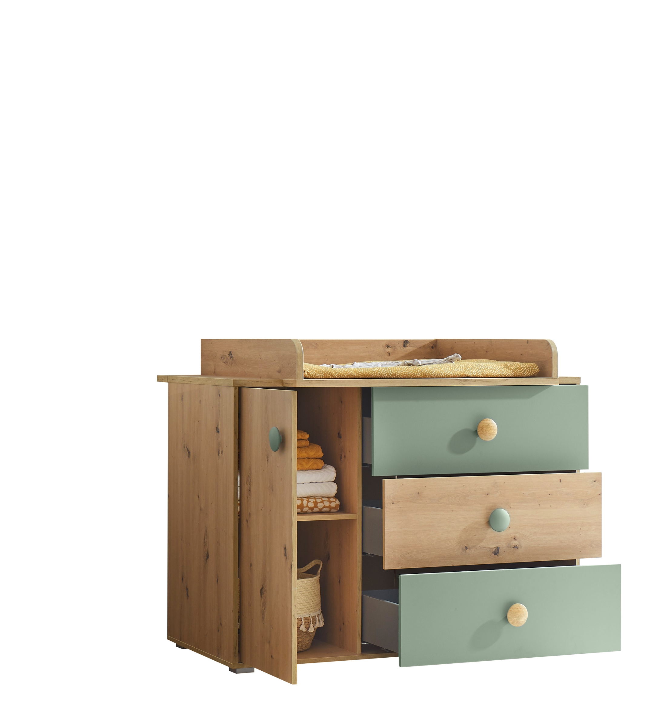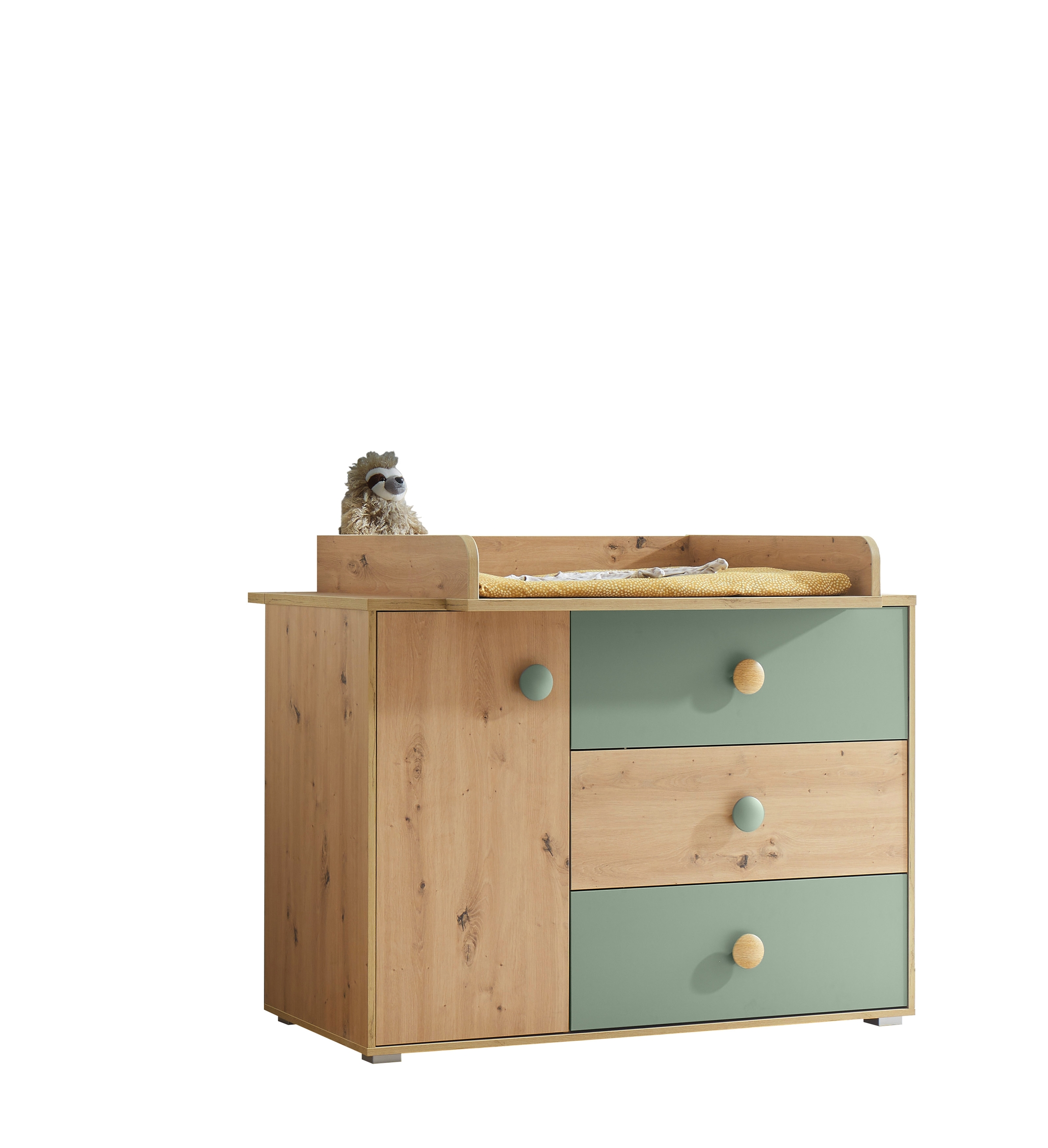 [Bullet-Point 3] => Modernes Design: Die Kombination aus Artisan Eiche Dekor & Salbei verleiht der Kommode einen natürlichen Look, der sich harmonisch in jedes Babyzimmer einfügt.