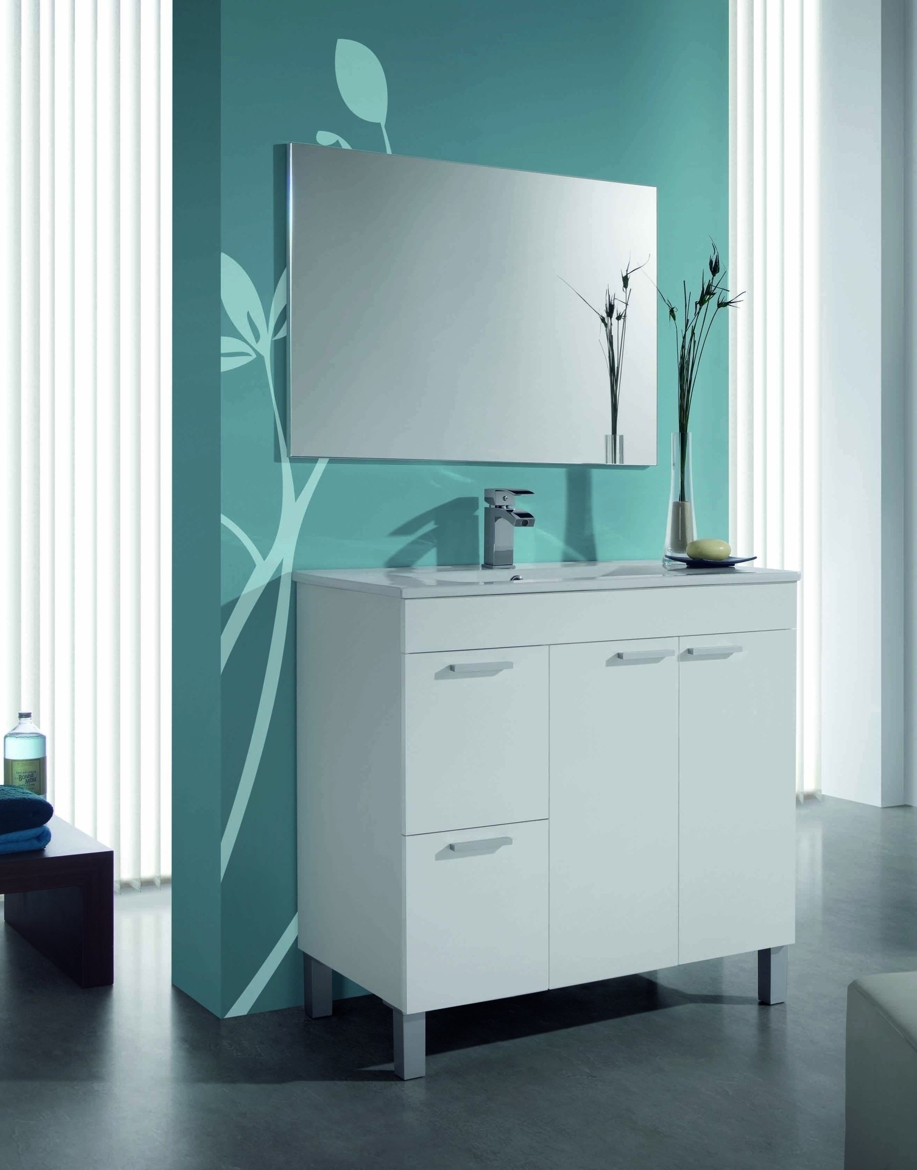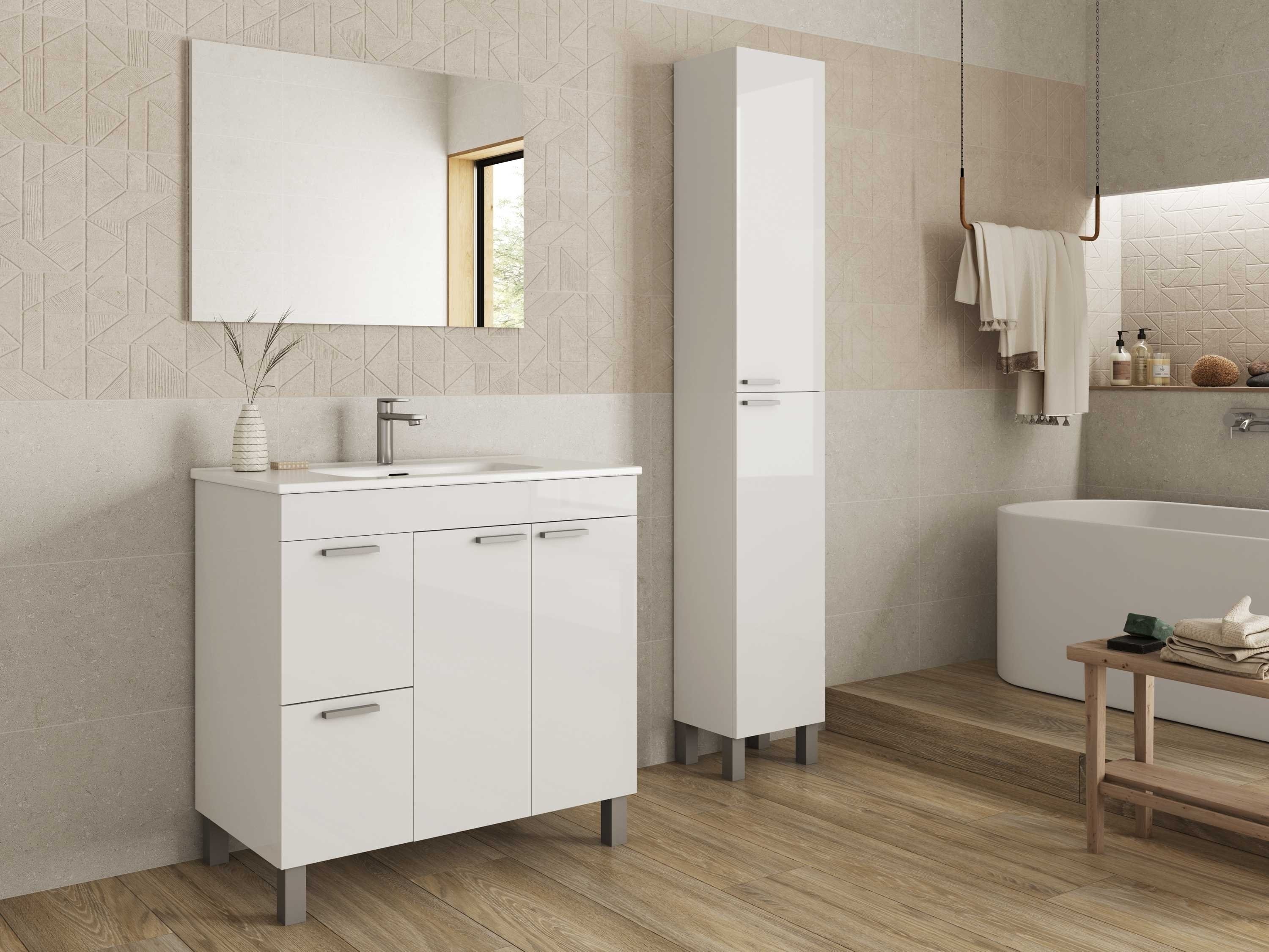 Weiß glänzende Fronten, Aluminium-Vierkantfüße und graue Griffe fügen sich stilvoll in moderne Bäder ein.