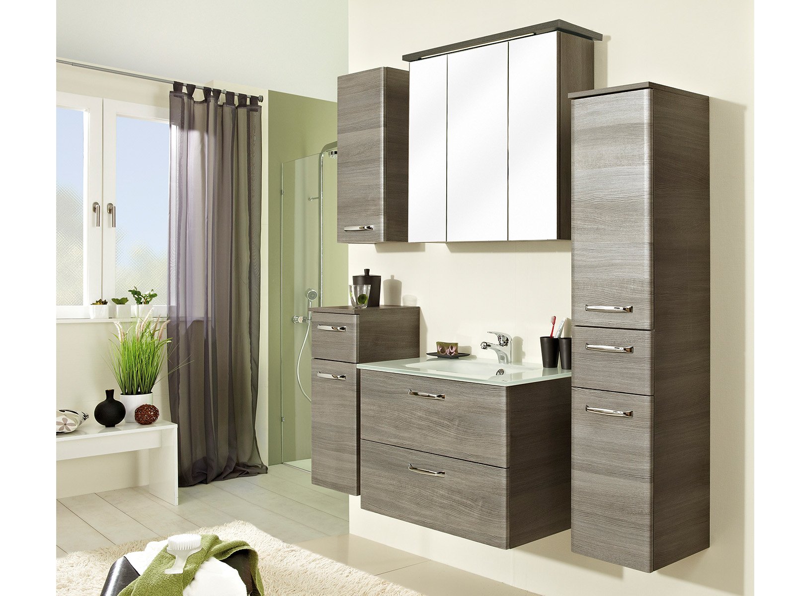 Die Produktabmessungen sind so gewählt, dass das Set auch in vielen Standardbädern sinnvoll Platz findet: Hängeschrank, Unterschrank, Midischrank, Waschtisch mit Waschbecken und Spiegelschrank sind jeweils kompakt geschnitten und bieten dennoch reichlich Stauraum. Mehrere Drehtüren, Schubkästen, Auszüge und zahlreiche Glas- bzw. Einlegeböden sorgen für Übersicht und Ordnung im Alltag.