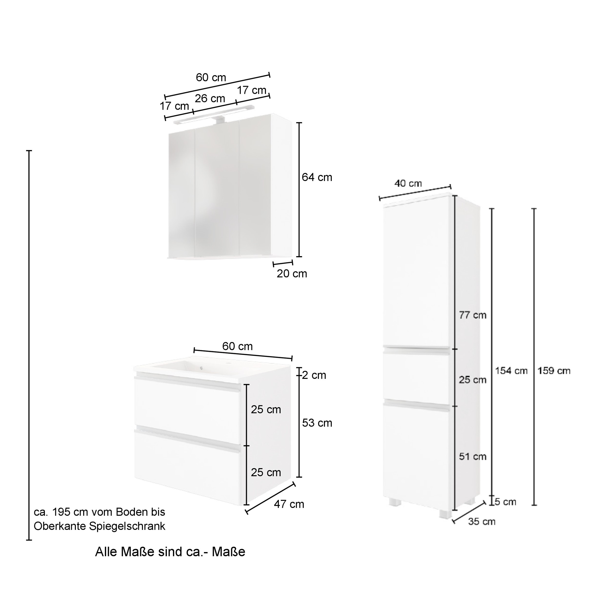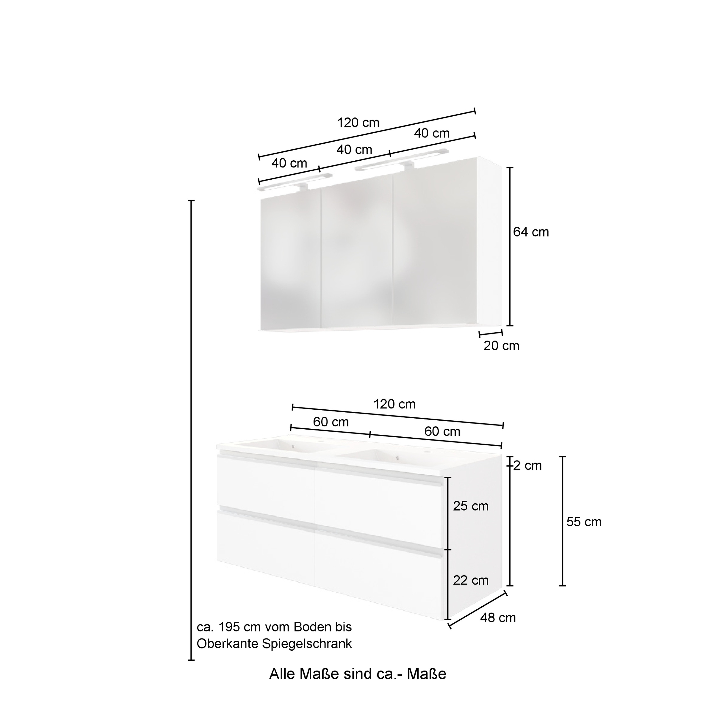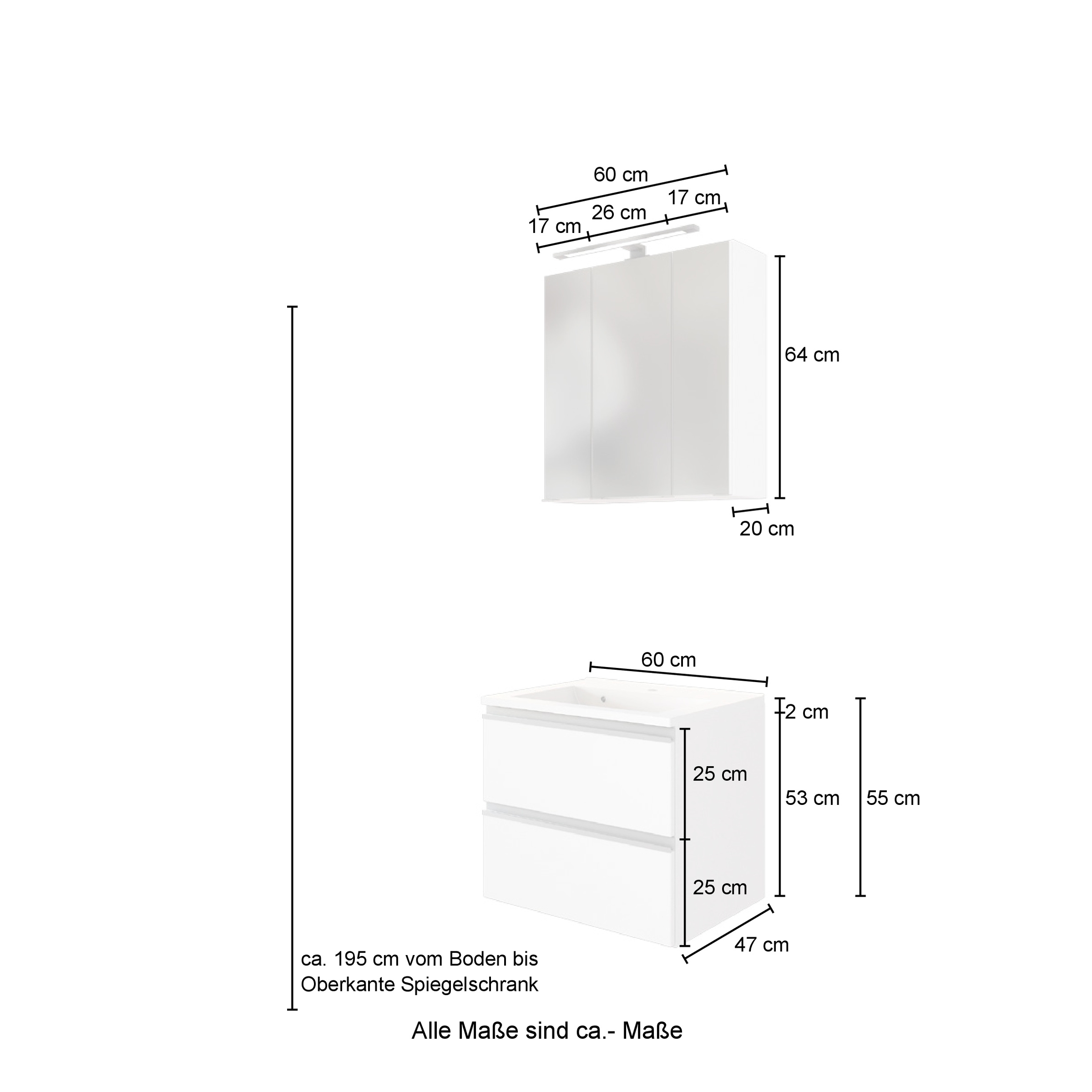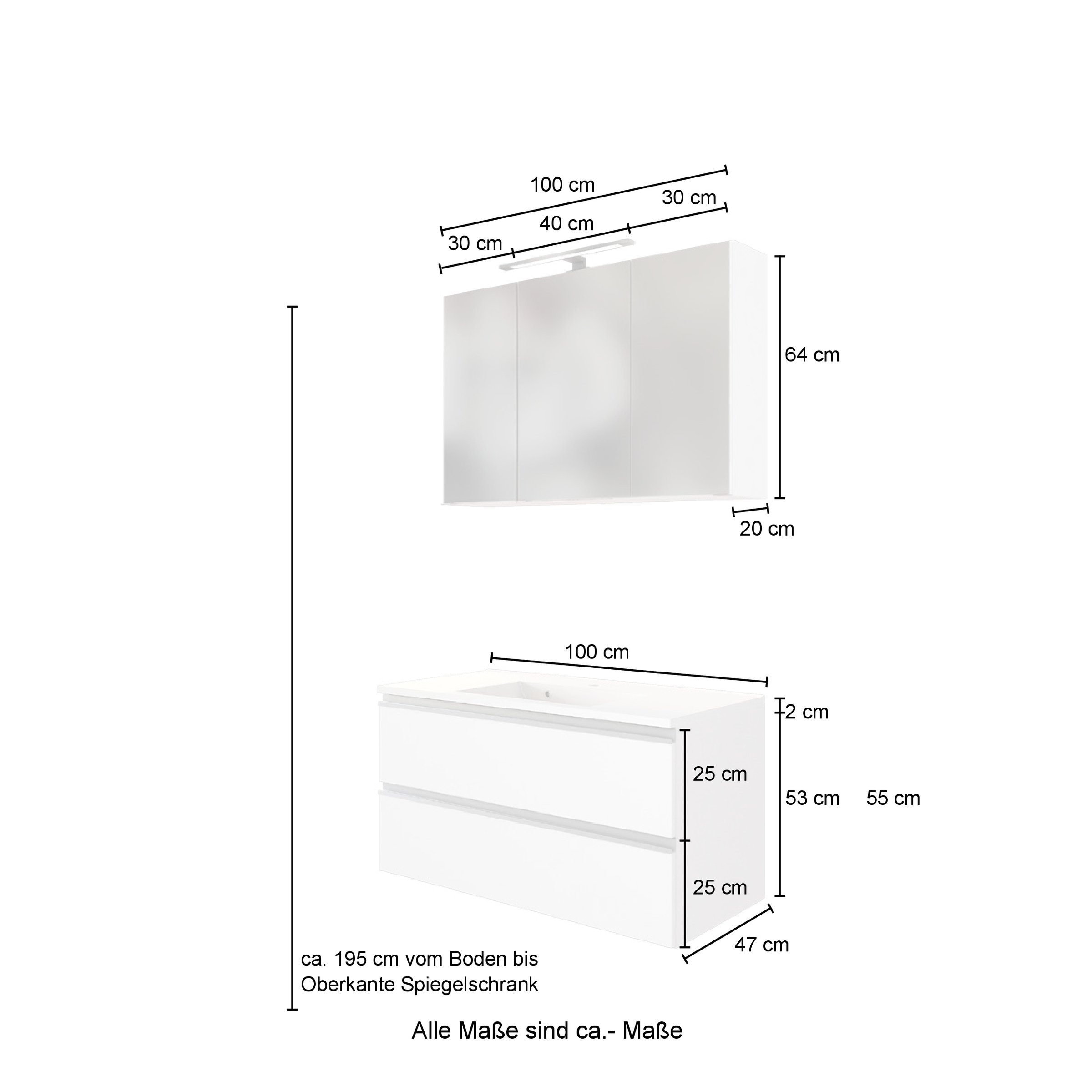 Das Set besteht aus einem Waschtisch mit Mineralgussbecken und einem Spiegelschrank mit integrierter LED-Aufbauleuchte in neutralweißem Licht (4000 Kelvin). Korpus und Fronten sind aus pflegeleichten, folierten Materialien gefertigt und damit für den Einsatz im Badezimmeralltag gut geeignet.