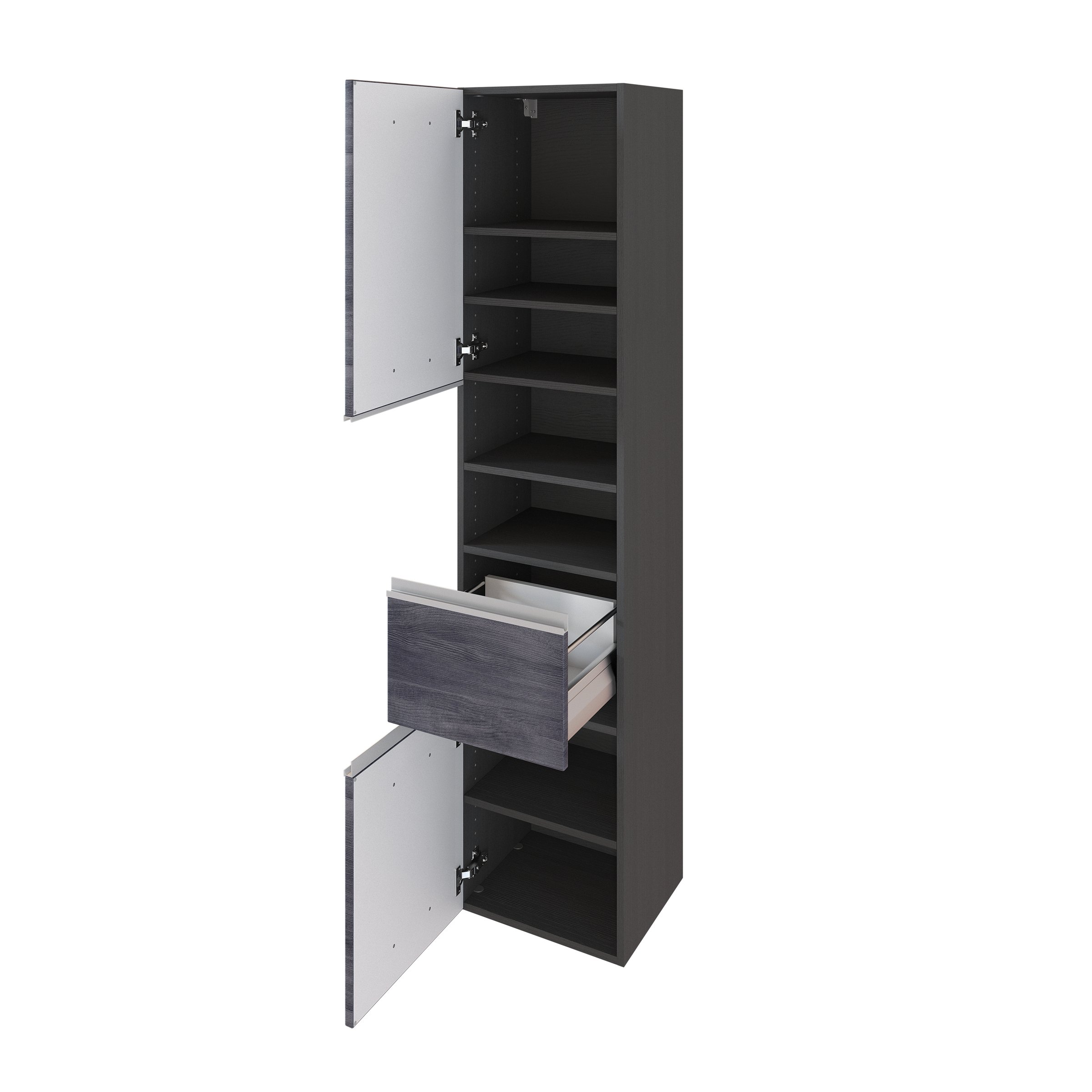 Besonders komfortabel sind die Softclose-Auszüge und die gedämpften Scharniere, die ein leises und schonendes Schließen von Türen und Schubladen ermöglichen – ideal für die tägliche Nutzung im Familienbad. Die Kombination aus Graphit und Eiche Rauchsilber Nachbildung setzt dabei einen modernen Akzent.
