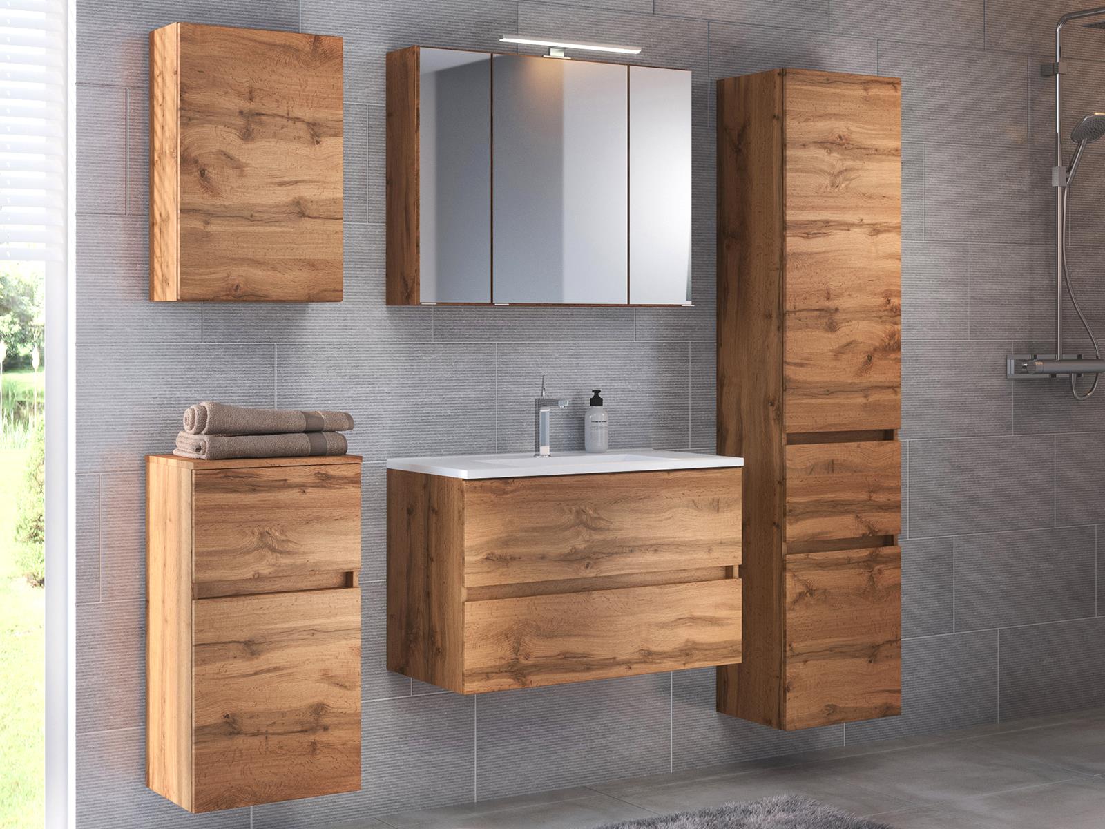 [metaDescription] => Modernes Badezimmer in Wotan Eiche Nachbildung, Korpus aus melaminharzbeschichteter Spanplatte, Front aus MDF foliert, bestehend aus 1 Midischrank, 1 Spiege