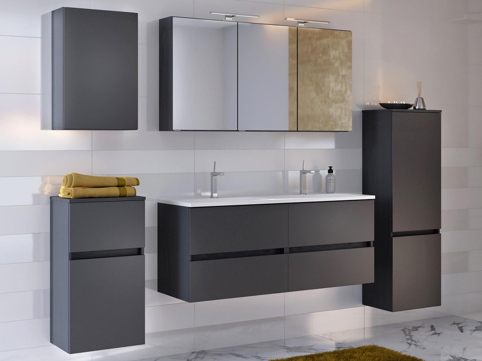 Hängeschrank, Unterschrank, Spiegelschrank, Waschbeckenunterschrank und Hochschrank bieten reichlich Stauraum für alle Badutensilien.