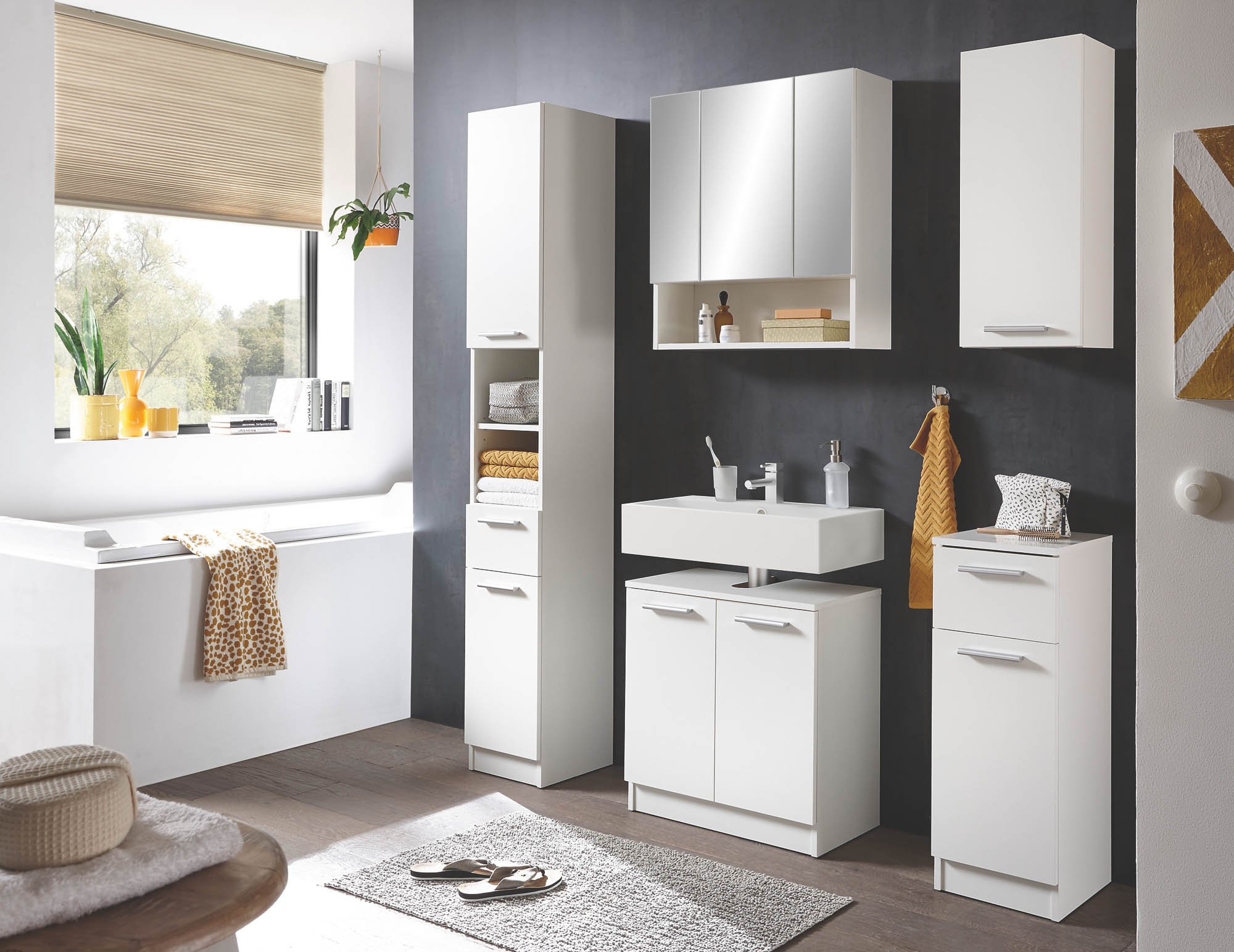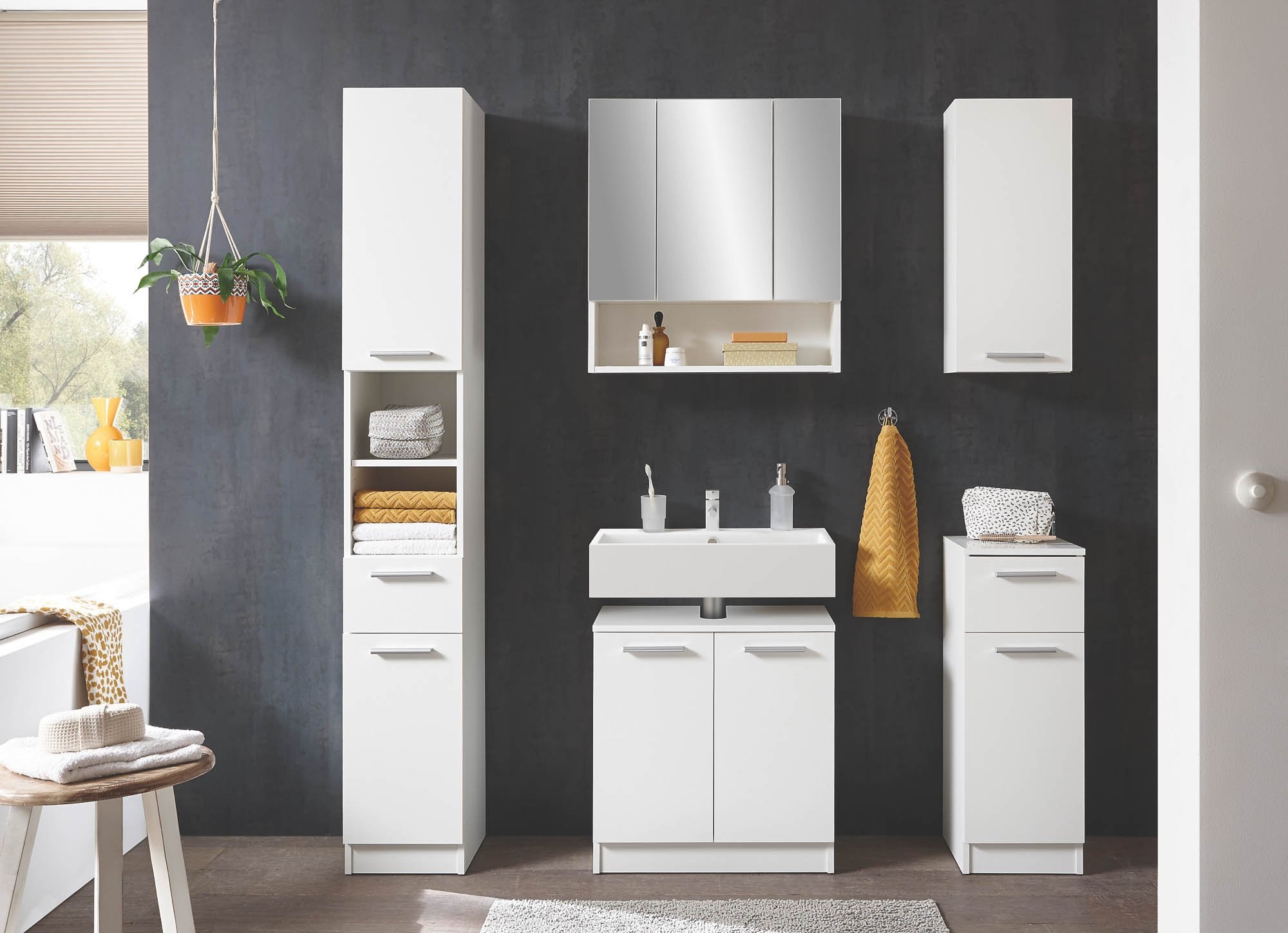 Hochschrank, Waschbeckenunterschrank, Spiegelschrank, Kommode und Hängeschrank bieten ein stimmiges Gesamtbild im Badezimmer.