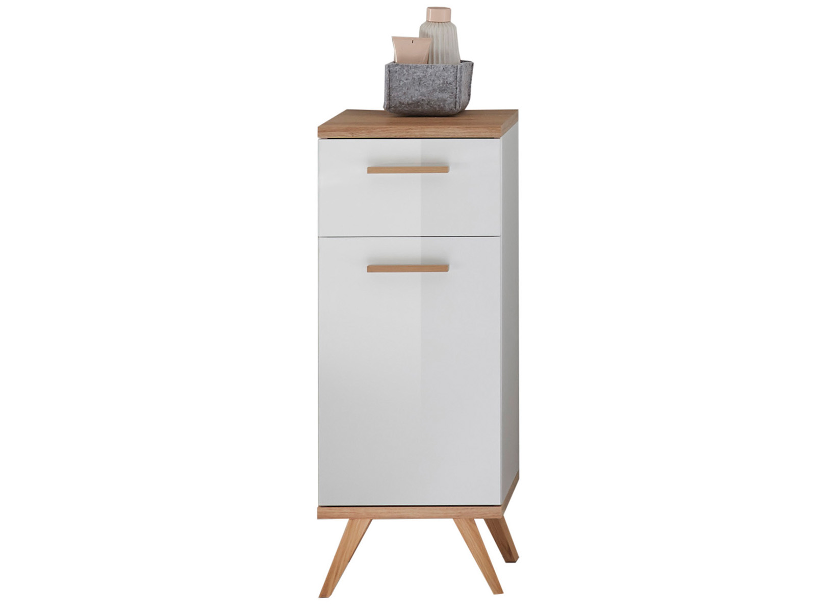 [metaDescription] => Badezimmer aus Spanplatte melaminharzbeschichtet, Korpus in weiß-glänzend und Front in weiß-Hochglanz, Absetzungen/Füße/Griffe aus Massivholz in Eiche Rivie