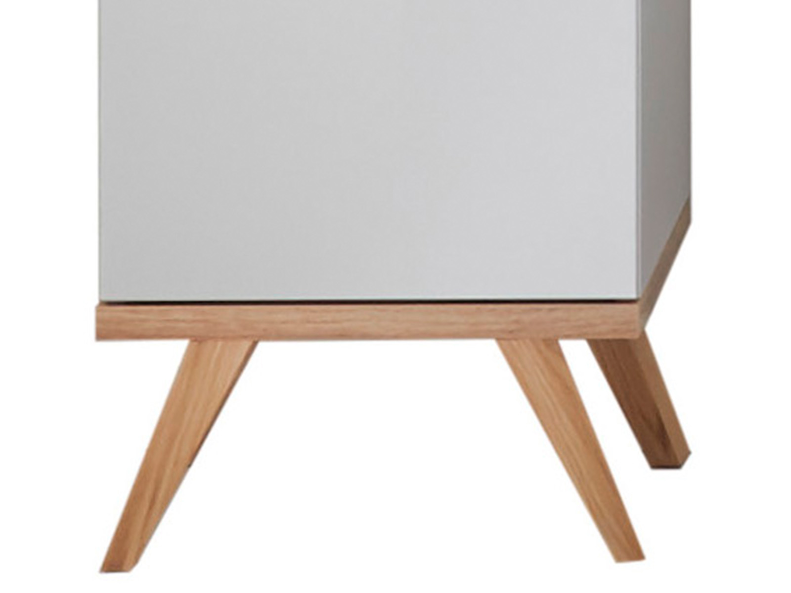 Glänzende weiße Fronten treffen auf Absetzungen, Füße und Griffe in Eiche Riviera Nachbildung für ein modernes Erscheinungsbild.