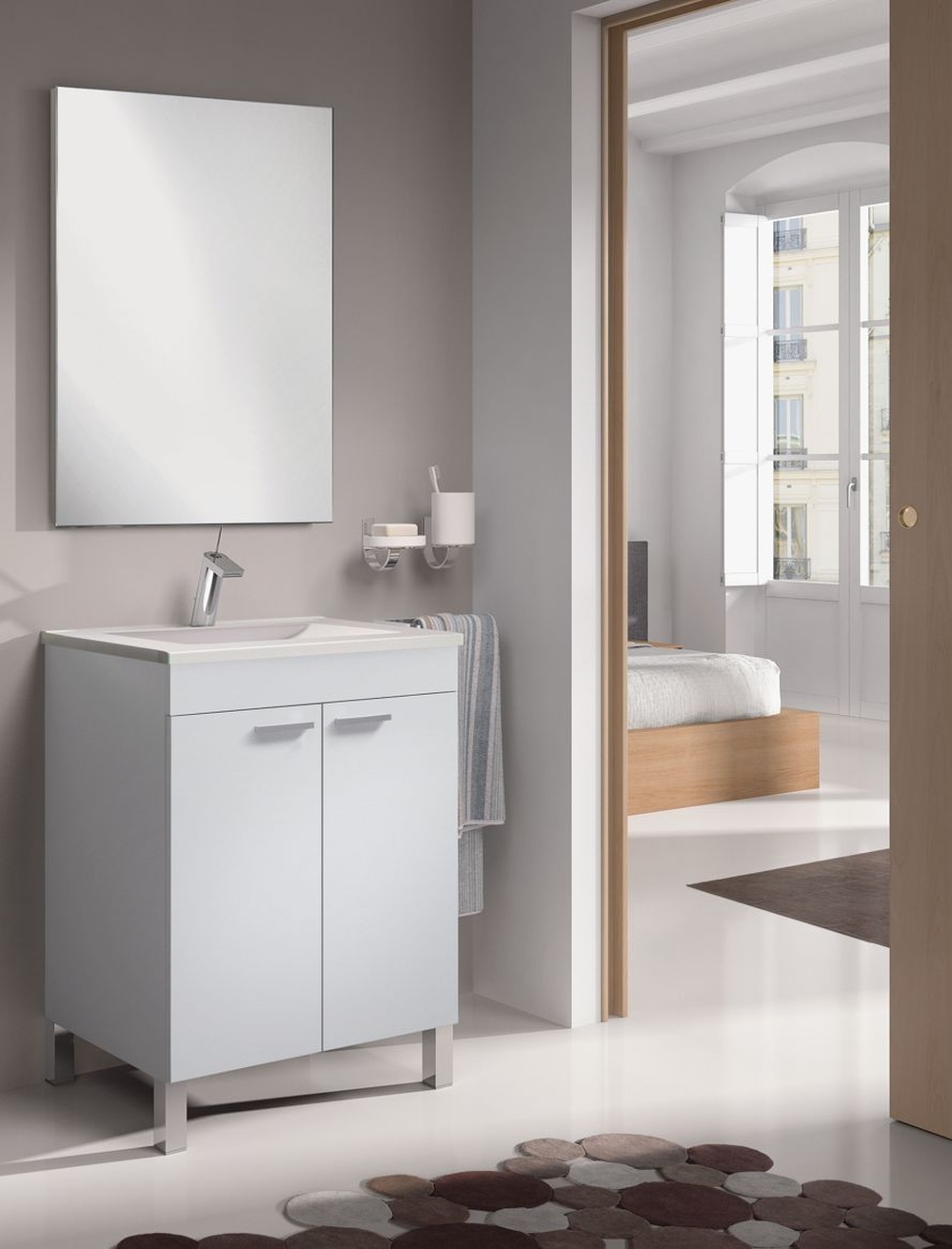 Ein passend dimensionierter Spiegel (ca. 57,5 x 80 x 1,8 cm) rundet das Set optisch ab und verleiht Ihrem Bad eine freundliche, moderne Atmosphäre. Gefertigt aus hochwertigen Materialien und in Spanien hergestellt, vereint das Badezimmer-Set LC1 Design, Funktionalität und langlebige Qualität.