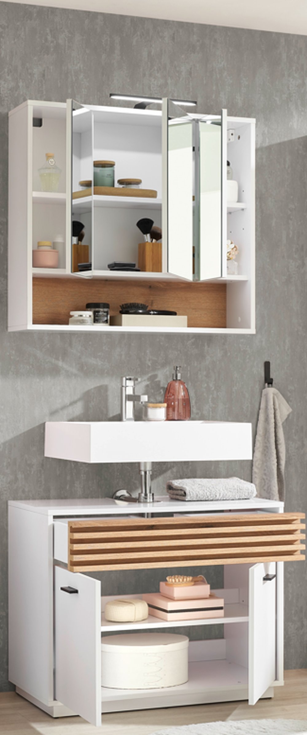 Das Set besteht aus einem Waschbeckenunterschrank mit praktischem Siphonausschnitt (9 x 25 cm) sowie einem Spiegelschrank mit integrierter LED-Beleuchtung (516 lm, 4200 K). Das neutralweiße Licht mit einer Lebensdauer von bis zu 30.000 Stunden sorgt für eine angenehme Ausleuchtung – perfekt zum Schminken, Rasieren oder Frisieren im Alltag.