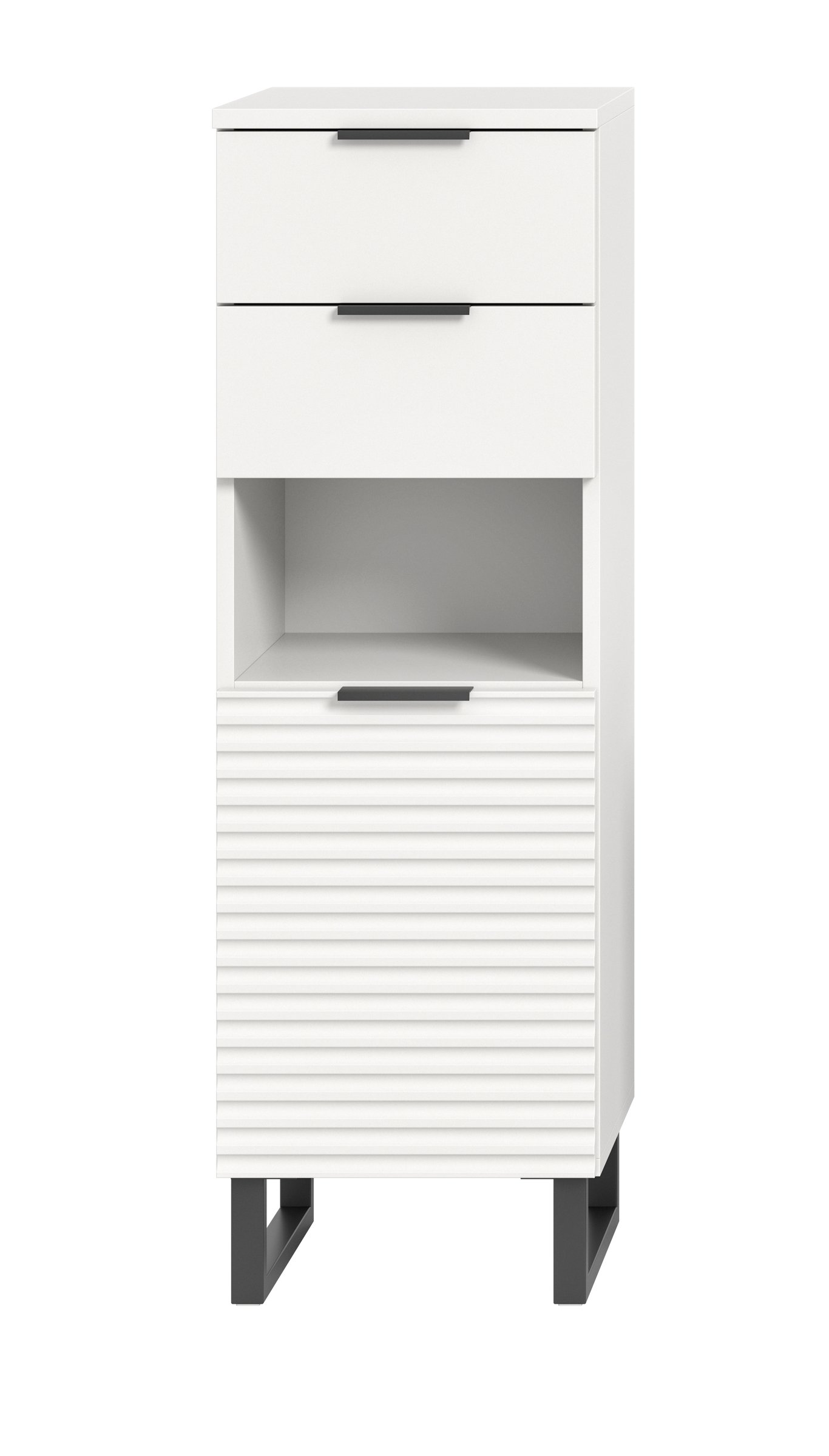Optisch überzeugt Riff mit einer modernen, weißen Nachbildung und tiefgezogenen Fronten in wertiger Rillenoptik. Die Innenflächen und Einlegeböden in Weiß unterstreichen den einheitlichen, harmonischen Gesamteindruck. Einen spannenden Akzent setzen die schwarzen Kufenfüße am Hochschrank, die das geradlinige Design stimmig ergänzen.