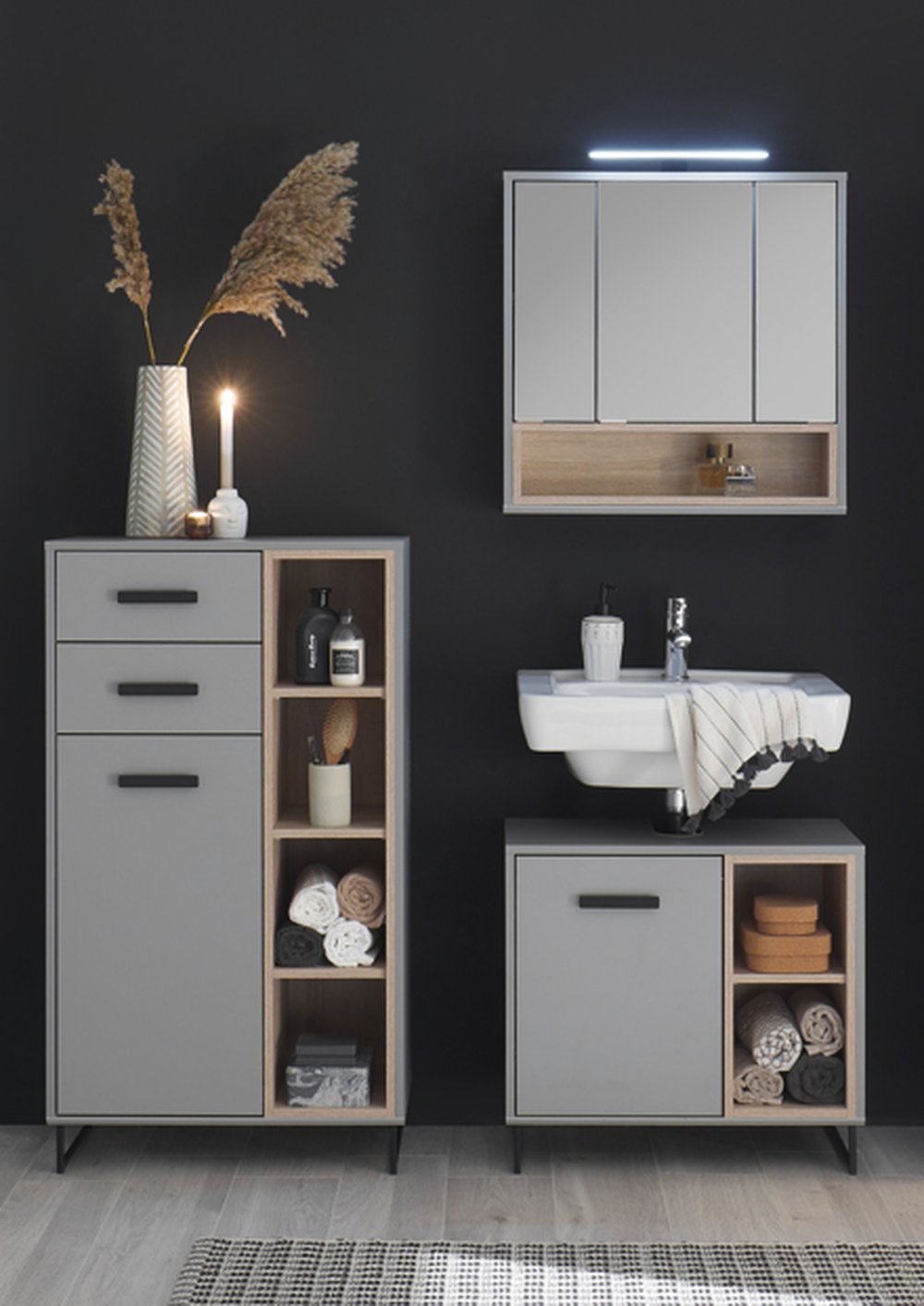Das Badezimmer-Set Tunis bietet Ihnen eine durchdachte Komplettlösung für ein modernes, ordentliches Bad. Mit einer Gesamtgröße von 150 cm Breite, 185 cm Höhe und 38 cm Tiefe fügt sich das 3-teilige Set ideal in kleine wie auch mittelgroße Bäder ein. Die harmonische Farbgestaltung in Grau matt mit Absetzungen in Sonoma Eiche Dekor schafft einen stilvollen, zeitgemäßen Look, der sowohl zu hellen als auch dunkleren Fliesen- und Wandfarben passt.