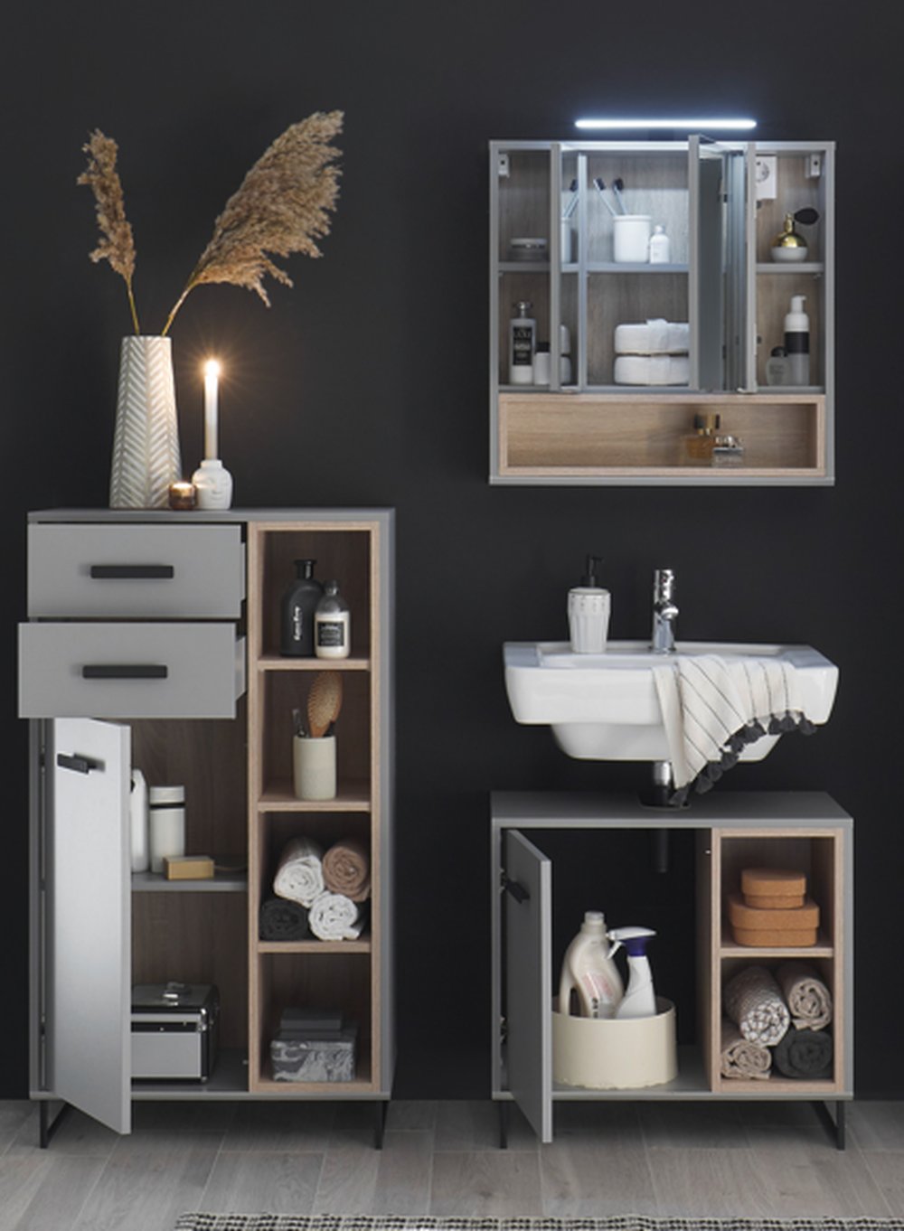 Zum Set gehören ein Spiegelschrank (B/H/T ca. 65x65x16 cm), ein Waschbeckenunterschrank (B/H/T ca. 65x61x38 cm) und ein Highboard (B/H/T ca. 65x116x38 cm). Der Spiegelschrank ist mit einer neutralweißen LED-Beleuchtung ausgestattet, die mit 306 Lumen und 4200 Kelvin eine klare, natürliche Ausleuchtung für alltägliche Pflegeroutinen bietet. Die Lebensdauer des Leuchtmittels ist mit bis zu 30.000 Stunden ausgelegt, sodass Sie lange Freude an der Beleuchtung haben.