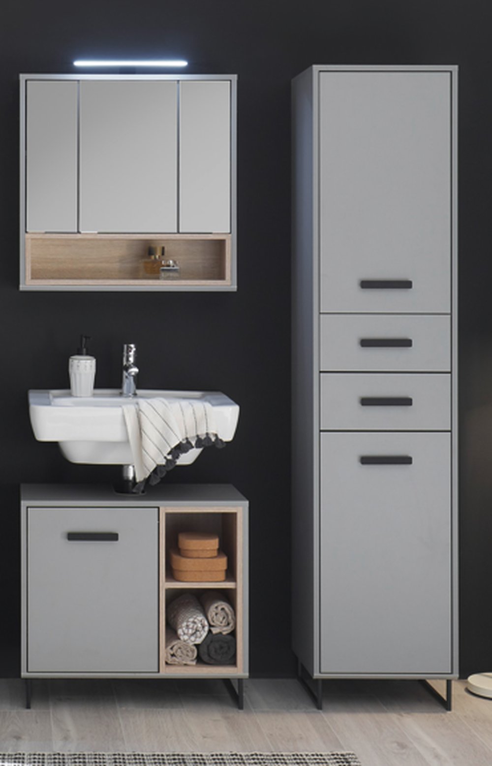 Gefertigt aus robustem Holzwerkstoff mit kratzfester, feuchtigkeitsabweisender Melaminbeschichtung ist das Set besonders pflegeleicht und langlebig. Der Farbmix aus Grau matt mit Absetzungen in Sonoma Eiche Dekor, schwarzen Griffstangen aus Kunststoff und Metallfüßen im schwarzen U-Profil unterstreicht den modernen, wohnlichen Look Ihres Badezimmers.