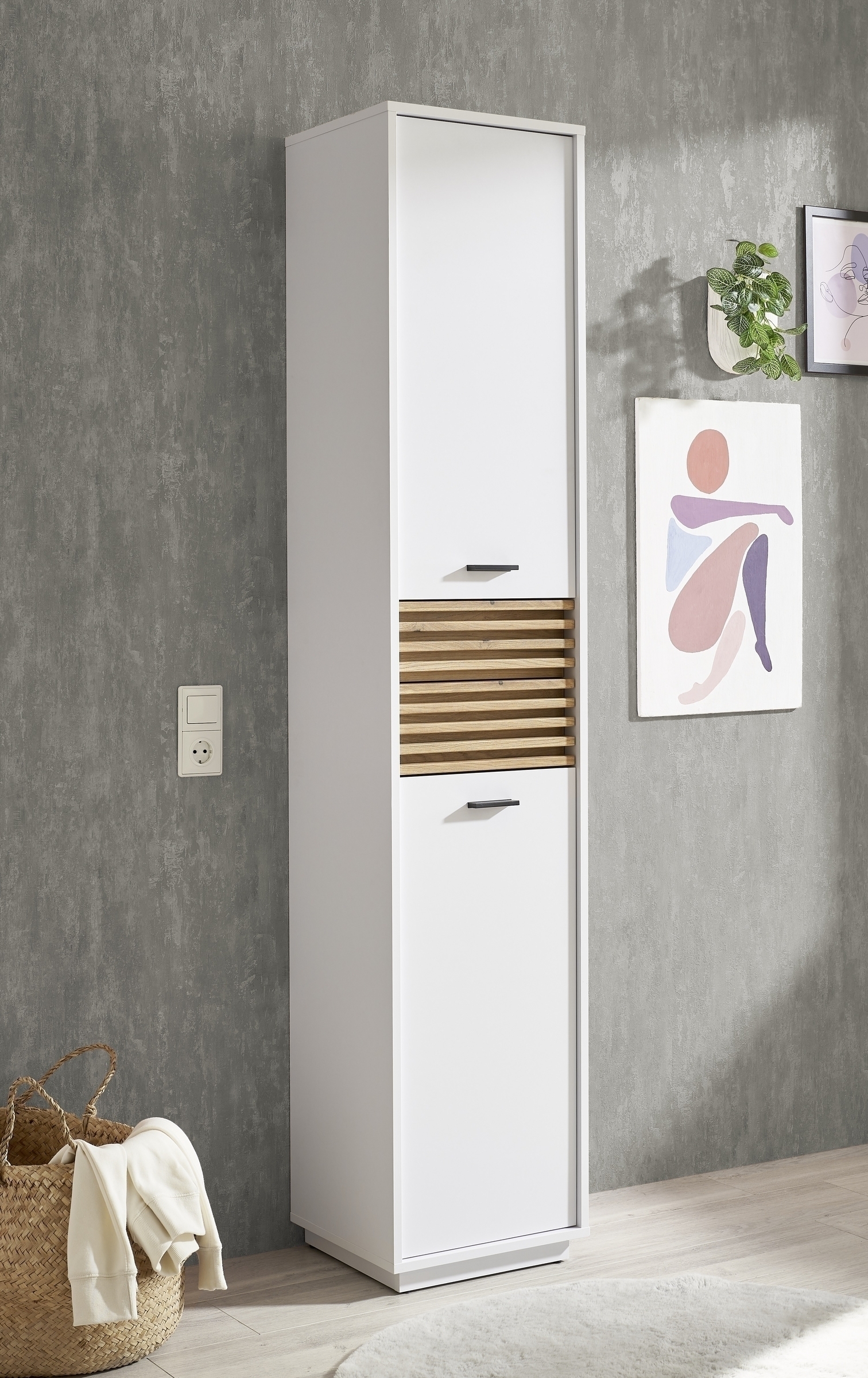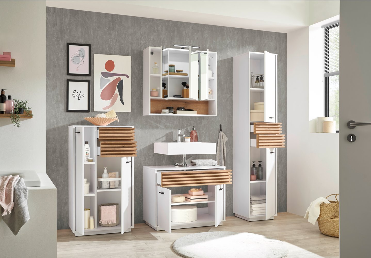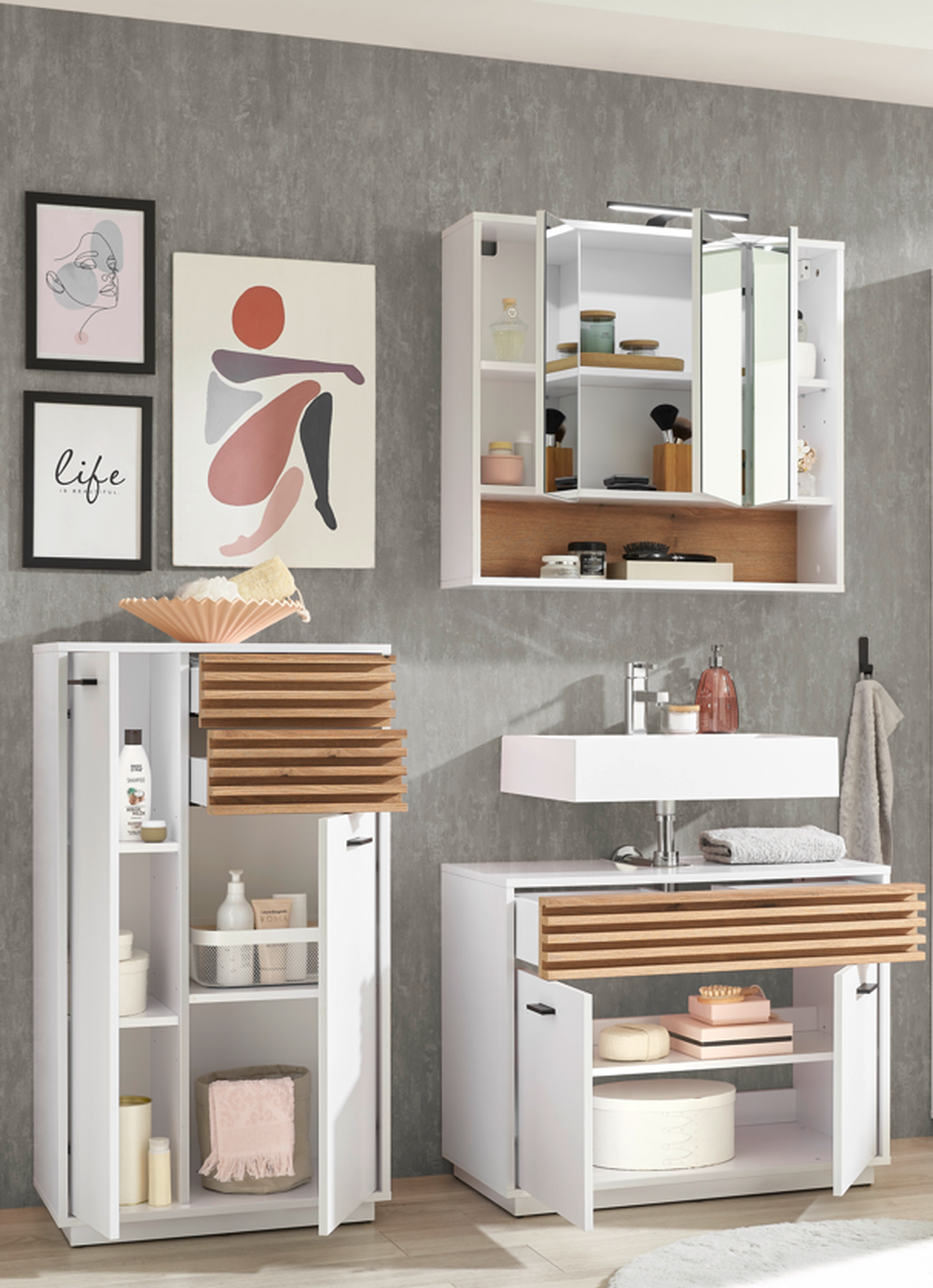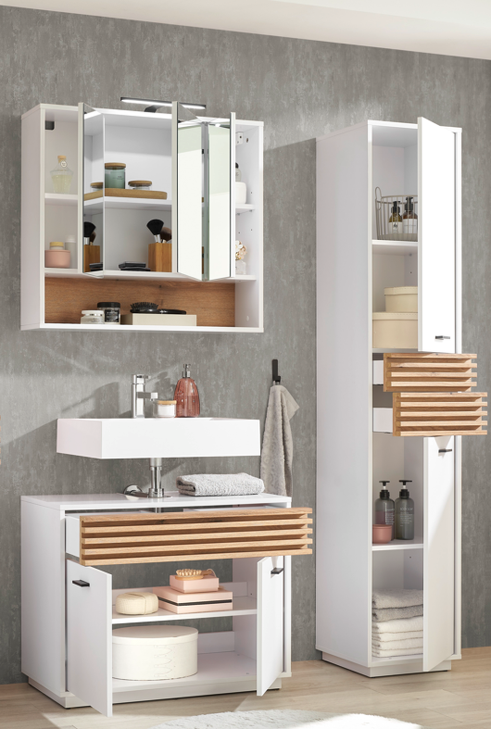 Die edle Farbkombination aus Weiß und Evoke Eiche Dekor sorgt für eine zeitlose, warme Optik, die sich mühelos in verschiedene Badstile einfügt. Dank robuster Spanplatte mit pflegeleichter Melaminbeschichtung ist der Spiegelschrank widerstandsfähig gegenüber Feuchtigkeit und Kratzern – ideal für den täglichen Einsatz im Badezimmer.