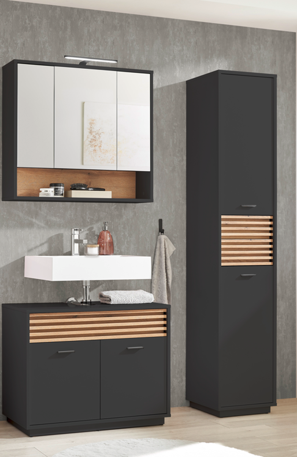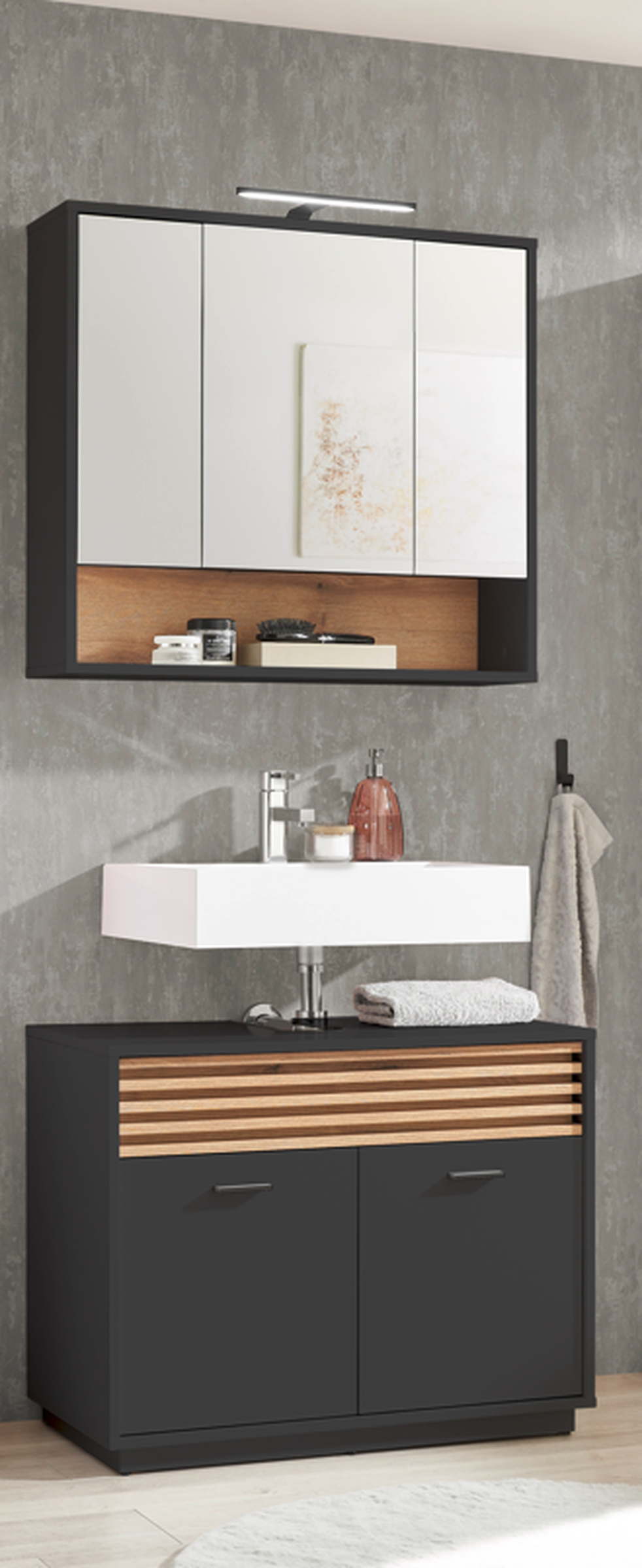 [BulletPoints] => Moderner Waschbeckenunterschrank in B/H/T: 80/64/40 cm – ideal für Ihr Badezimmer. Kompakte Maße und stilvolles Design in Weiß und Evoke Eiche tiefzieh kombiniert.;Zwei Drehtüren mit schwarz matt lackierten Stangengriffen und ein Einlegeboden bieten praktischen Stauraum für Handtücher, Reinigungsmittel und Badaccessoires.;Schublade mit Unterflurauszug und zwei Aufteilungen sorgt für Übersichtlichkeit – ideal zur Aufbewahrung kleiner Badartikel. Edles Design trifft auf clevere Funktionalität.;Robuste Spanplatte mit melaminbeschichteter Oberfläche: pflegeleicht, feuchtigkeitsresistent und langlebig. FSC-Zertifikat steht für nachhaltige Materialwahl.;Der Badunterschrank wird zerlegt geliefert und lässt sich dank durchdachter Konstruktion und verständlicher Anleitung einfach und schnell montieren.