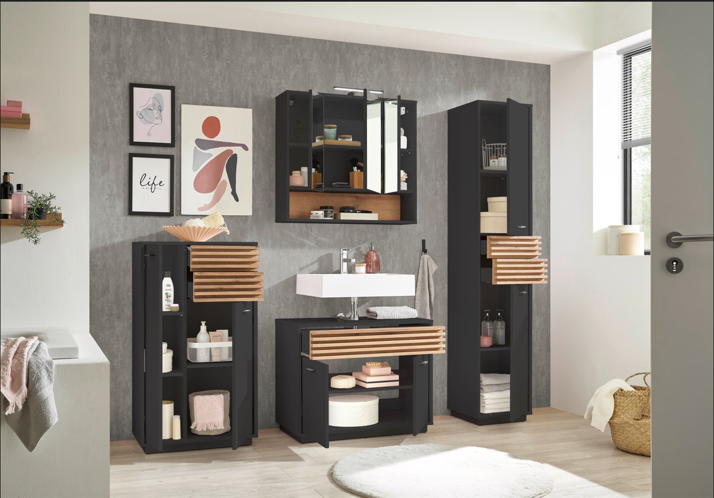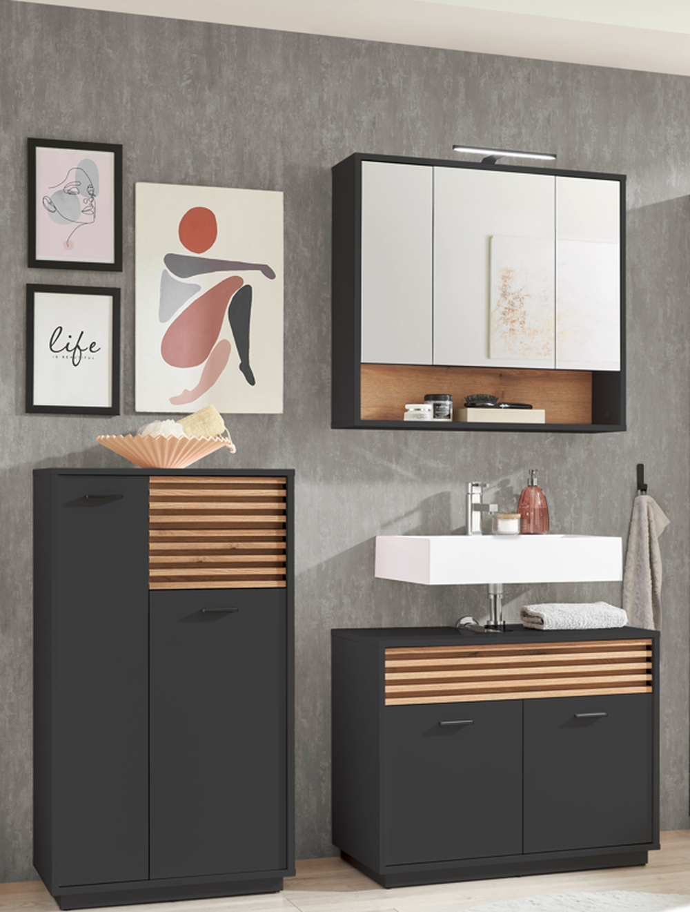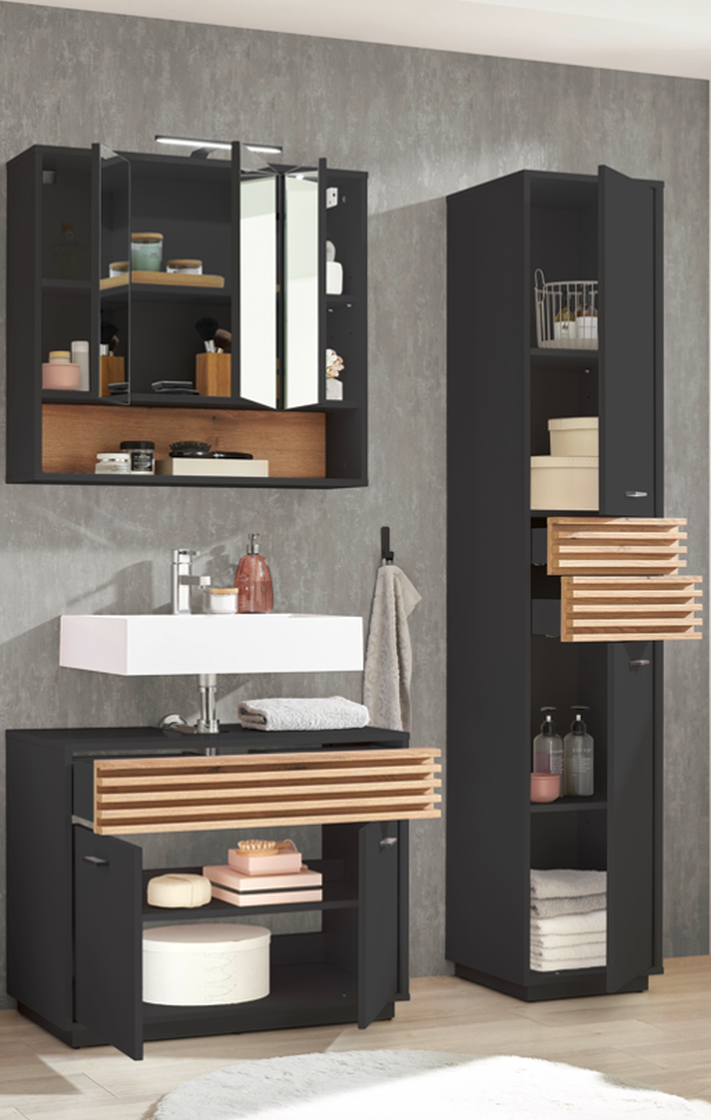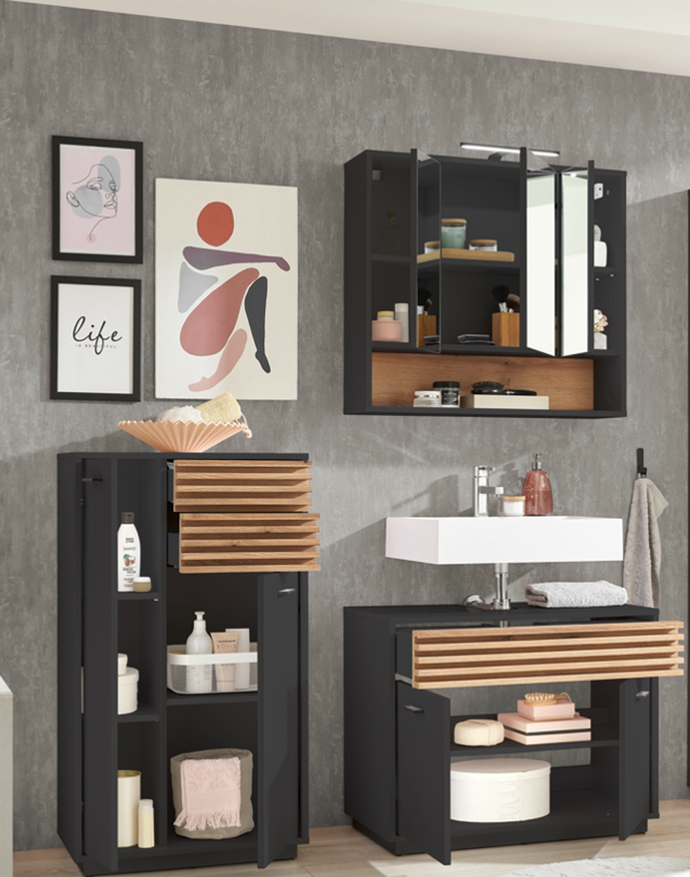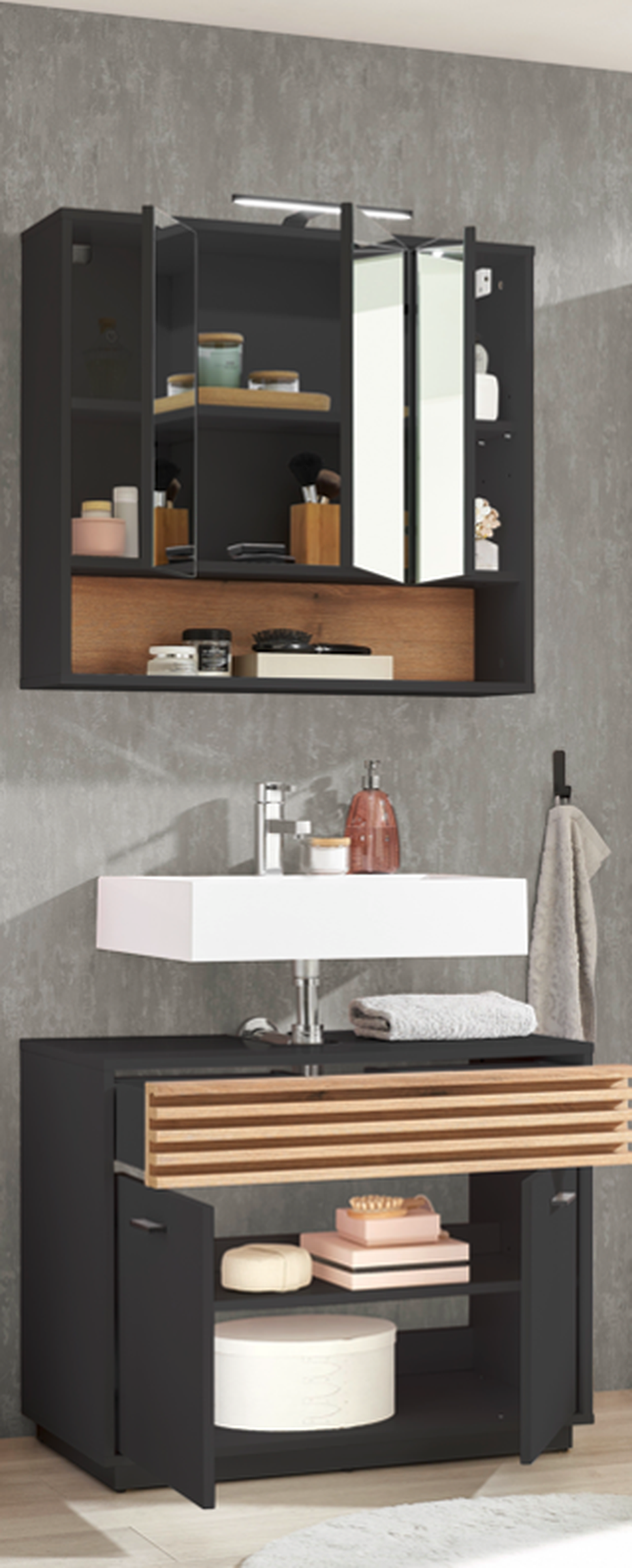 Hinter den drei Spiegeltüren mit praktischer Drehtürenmechanik verbergen sich drei Einlegeböden, die flexibel mit Pflegeprodukten, Kosmetik und Badaccessoires bestückt werden können. Jeder Einlegeboden ist bis zu 5 kg belastbar und damit auch für schwerere Flaschen oder Tiegel bestens geeignet. Das offene Fach unterhalb der Türen setzt einen modernen Akzent, bietet Platz für häufig genutzte Dinge und sorgt dafür, dass wichtige Utensilien jederzeit griffbereit sind.