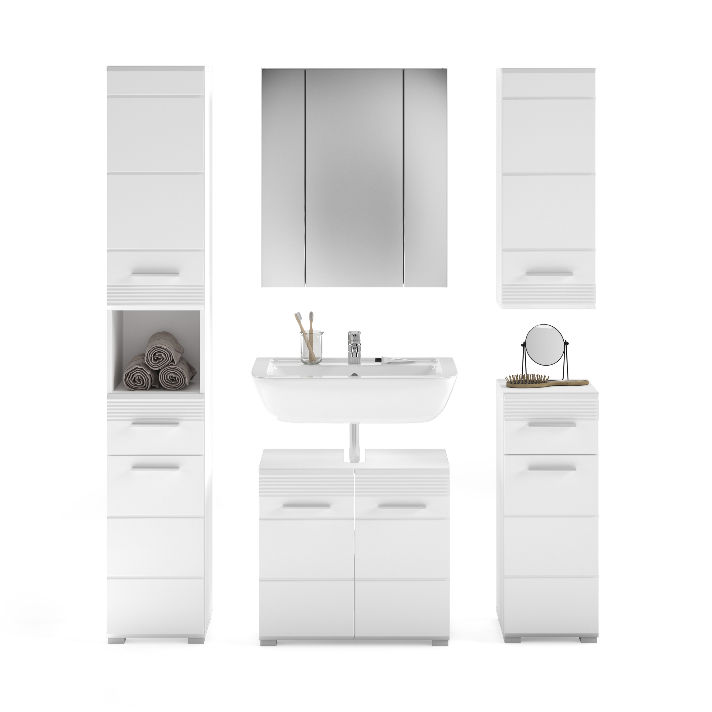 [BulletPoints] => Design/Stil: Modernes und schlankes Design mit einer Kombination aus weißer Nachbildung und weißem Hochglanz tiefzieh, das eine zeitgemäße und ästhetisch ansprechende Optik für das Badezimmer oder den Hauswirtschaftsraum bietet.;Funktionalität: Kompakter Waschbeckenunterschrank mit ausreichend Stauraum für Pflegeprodukte und andere Utensilien, kombiniert mit einer passenden Höhe, um das Waschbecken zu umrahmen und eine praktische Nutzung zu gewährleisten.;Qualität/Pflege: Hochwertige Materialien und sorgfältige Verarbeitung gewährleisten eine langlebige Nutzung, während die pflegeleichten Oberflächen eine einfache Reinigung und Pflege ermöglichen, um den schönen Zustand des Waschbeckenunterschranks zu erhalten.;Einsatzbereich: Ideal für das Badezimmer oder den Hauswirtschaftsraum, um zusätzlichen Stauraum unter dem Waschbecken zu schaffen und gleichzeitig eine ästhetische Bereicherung für den Raum zu bieten.;Nachhaltigkeit: Das Möbel besteht aus FSC®-zertifiziertem Holzwerkstoff zum Schutz der Wälder