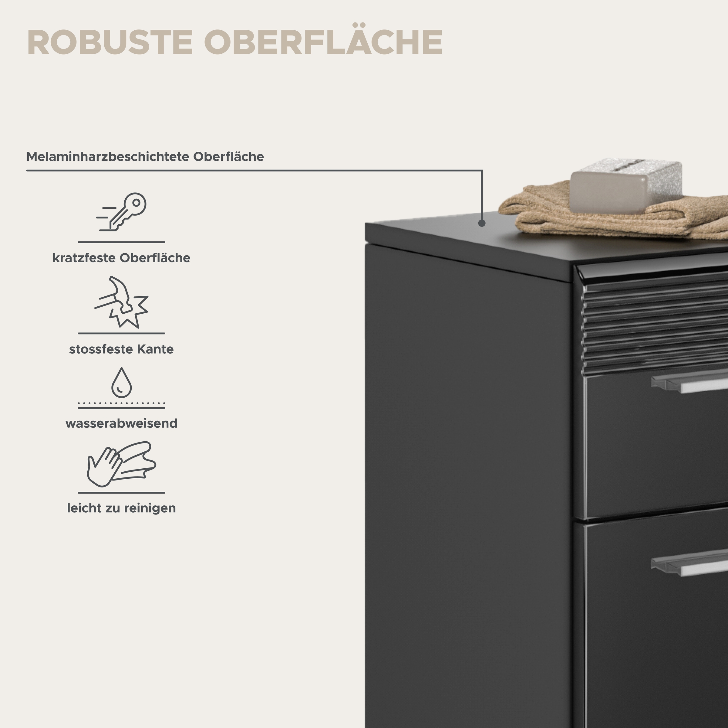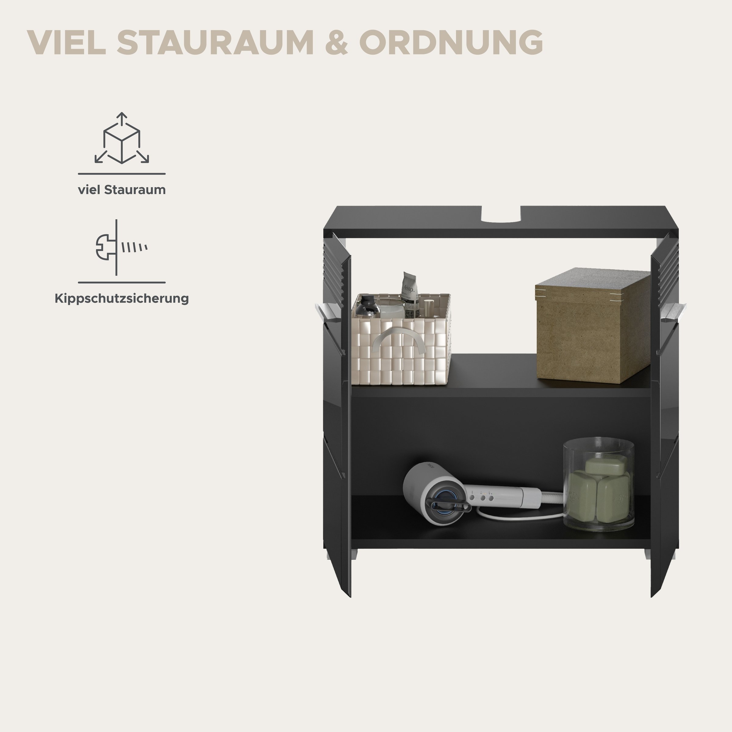 [Bullet-Point 2] => Funktionalität: Kompakter Waschbeckenunterschrank mit ausreichend Stauraum für Pflegeprodukte und andere Utensilien, kombiniert mit einer passenden Höhe, um das Waschbecken zu umrahmen und eine praktische Nutzung zu gewährleisten.