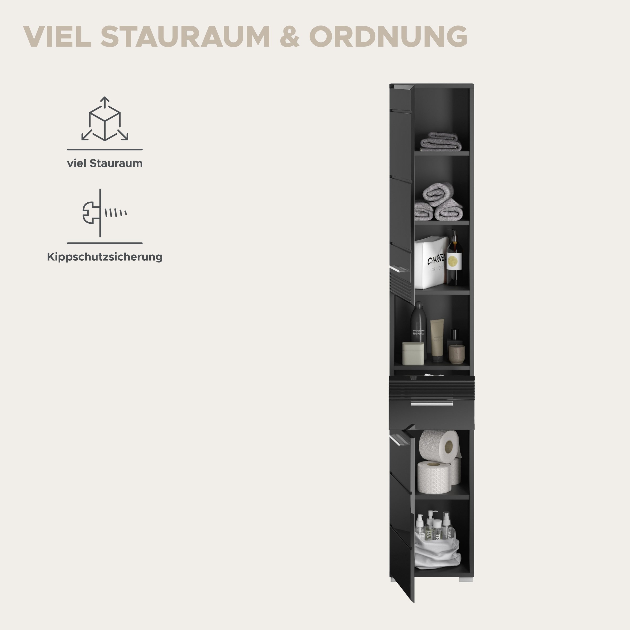 ✔Profitieren Sie von 9 Fächern und 6 Einlegeböden, um Pflegeprodukte und Utensilien übersichtlich zu verstauen.