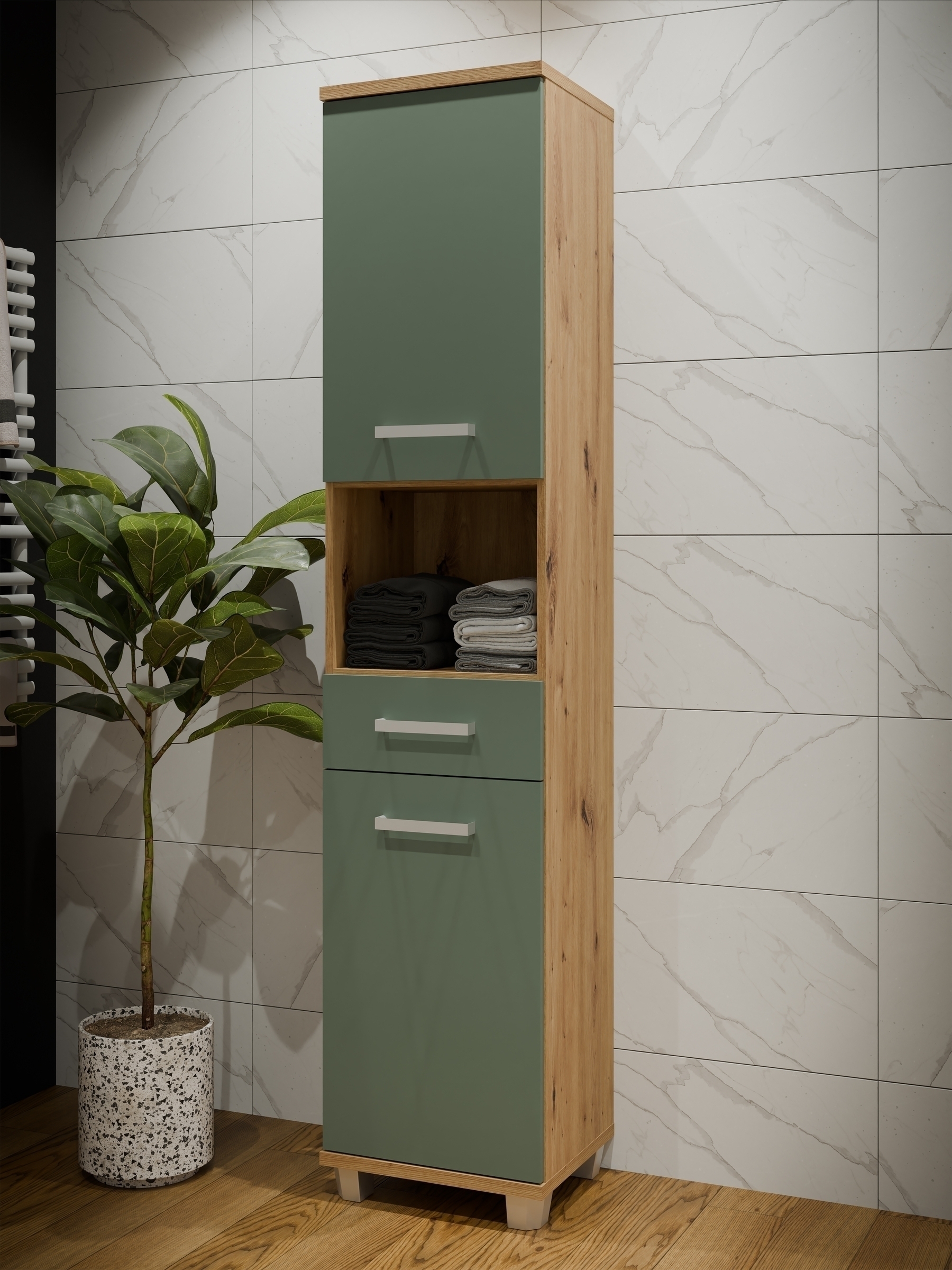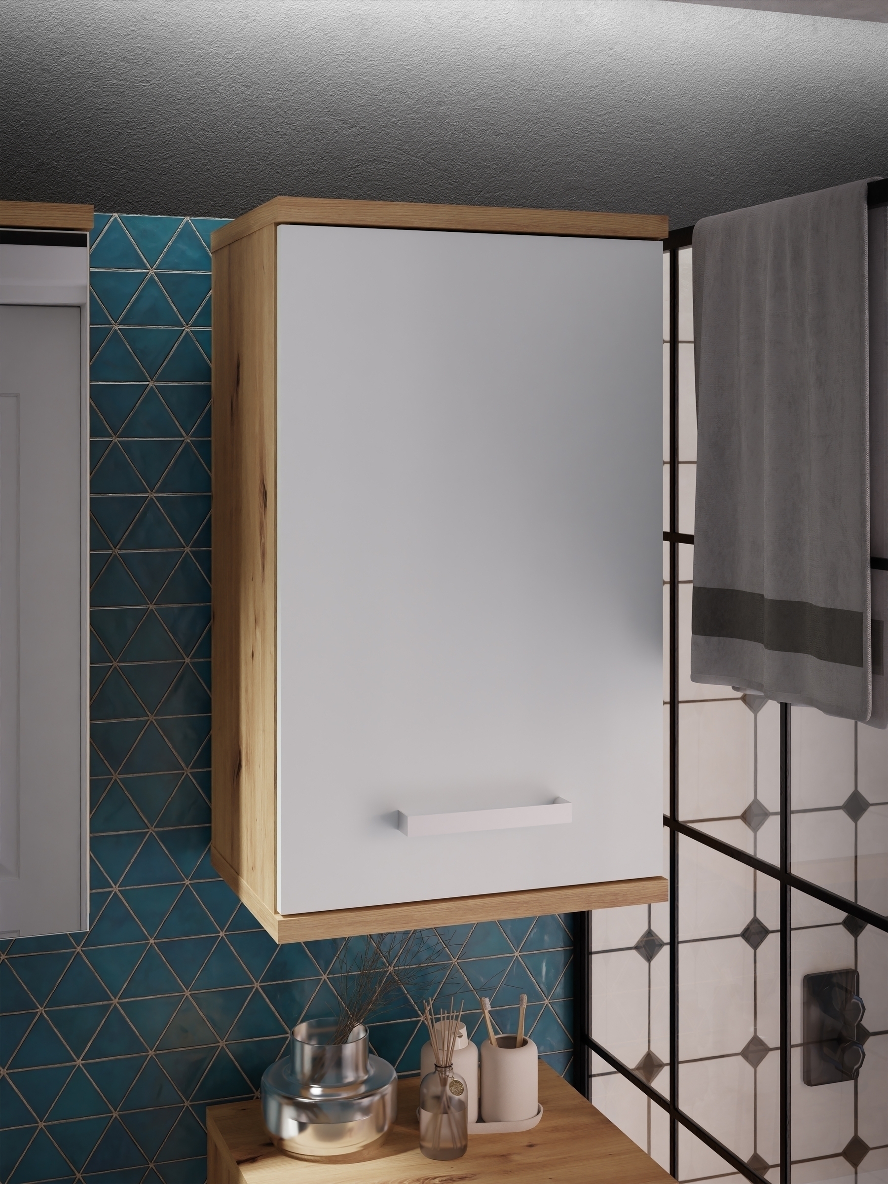 [Bullet-Point 3] => Mit 2 Türen, 1 Einlegeboden bis 15 kg und Oberboden bis 40 kg bietet VERIS ausreichend Stauraum für Badutensilien und Pflegeprodukte.