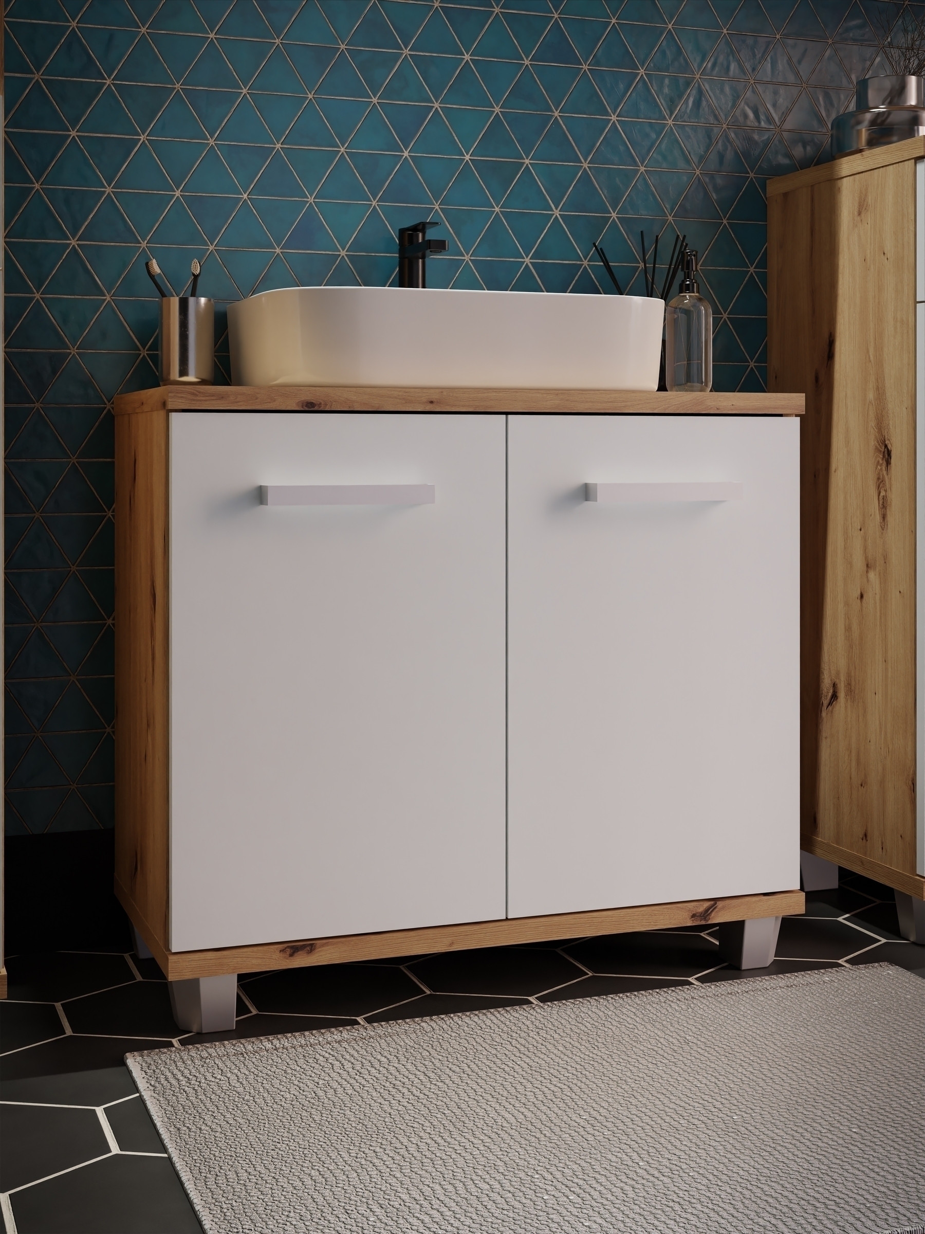 [BulletPoints] => Moderner Waschbeckenunterschrank VERIS in Sand, Maße 68,6/62/34,8 cm (B/H/T), ideal für kleine bis mittelgroße Badezimmer und platzsparende Lösungen.;Der Korpus und die Front bestehen aus robuster Spanplatte mit pflegeleichtem Folie-Finish, Rückwand aus lackierter HDF-Platte für Stabilität.;Mit 2 Türen, 1 Einlegeboden bis 15 kg und Oberboden bis 40 kg bietet VERIS ausreichend Stauraum für Badutensilien und Pflegeprodukte.;Schwarze Metallgriffe, Papierkanten und 22 mm starker Boden garantieren langlebige Qualität, modernes Design und sichere Handhabung im Badezimmer.;Der Waschbeckenunterschrank VERIS wird zerlegt geliefert, einfache Montage dank beiliegender Anleitung, perfekt für eine schnelle und unkomplizierte Einrichtung.