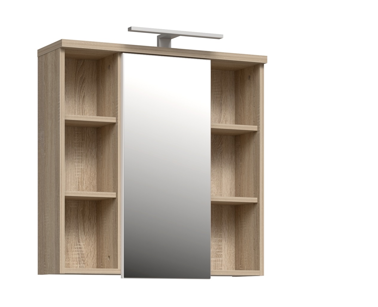 Im Inneren des Schranks erwarten Sie acht praktische Innenfächer, die für Übersicht und Ordnung sorgen. Hier finden Zahnpflege, Kosmetik, Rasierutensilien und vieles mehr ihren festen Platz. Der Oberboden aus 22 mm starker Spanplatte ist bis zu 20 kg belastbar und kann je nach Bedarf zusätzlich genutzt werden. Die integrierte LED-Beleuchtung sorgt dabei für eine gute Ausleuchtung des Spiegelbereichs und eine angenehme Atmosphäre im Badezimmer.