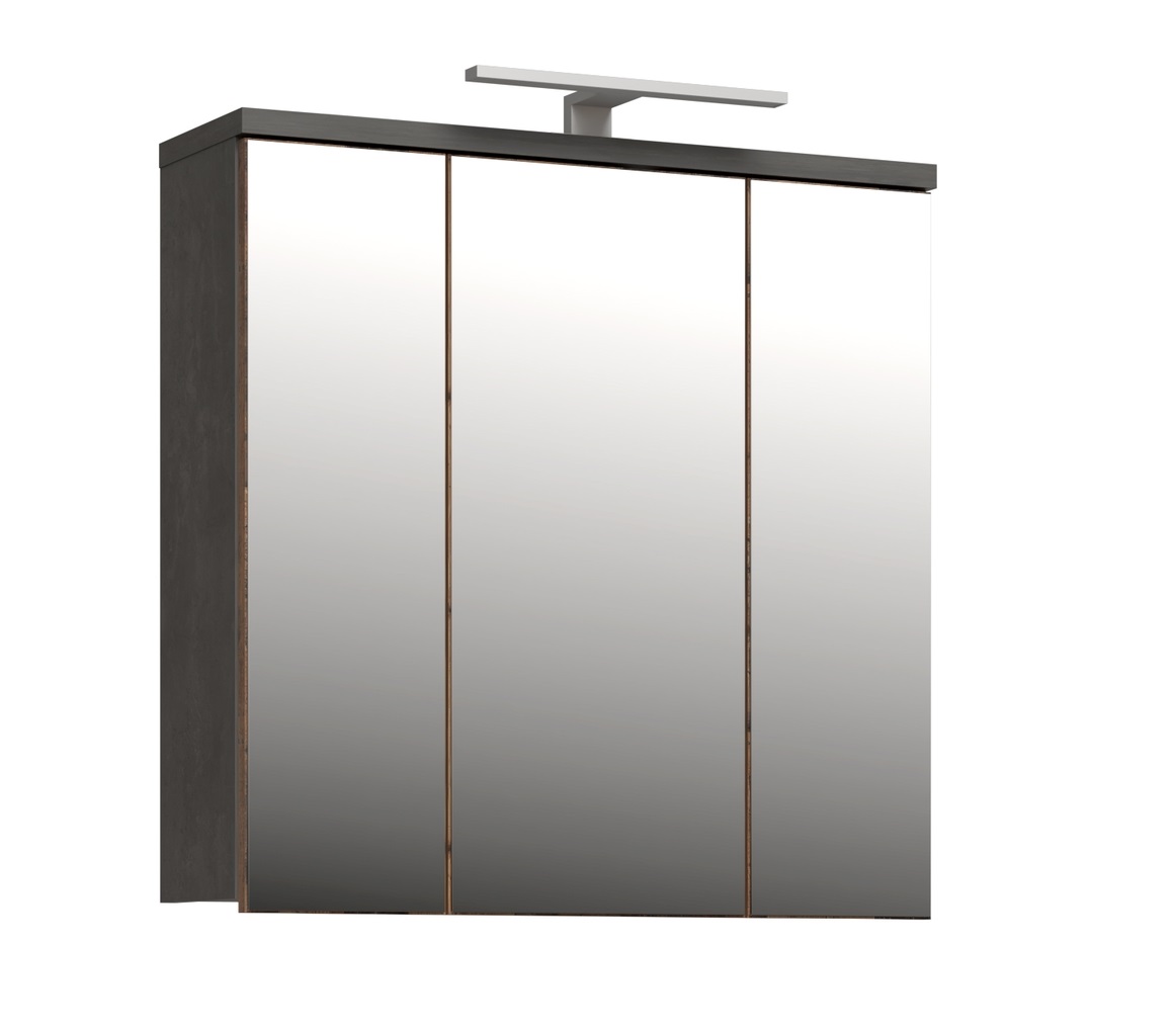 Die ansprechende Kombination aus Betonoptik Dunkelgrau und Spiegel verleiht dem Veris Spiegelschrank einen zeitgemäßen, leicht industriellen Look. Drei Spiegeltüren und die integrierte LED-Beleuchtung sorgen für eine gute Ausleuchtung vor dem Waschbecken – ideal zum Schminken, Rasieren oder für die tägliche Gesichtspflege.