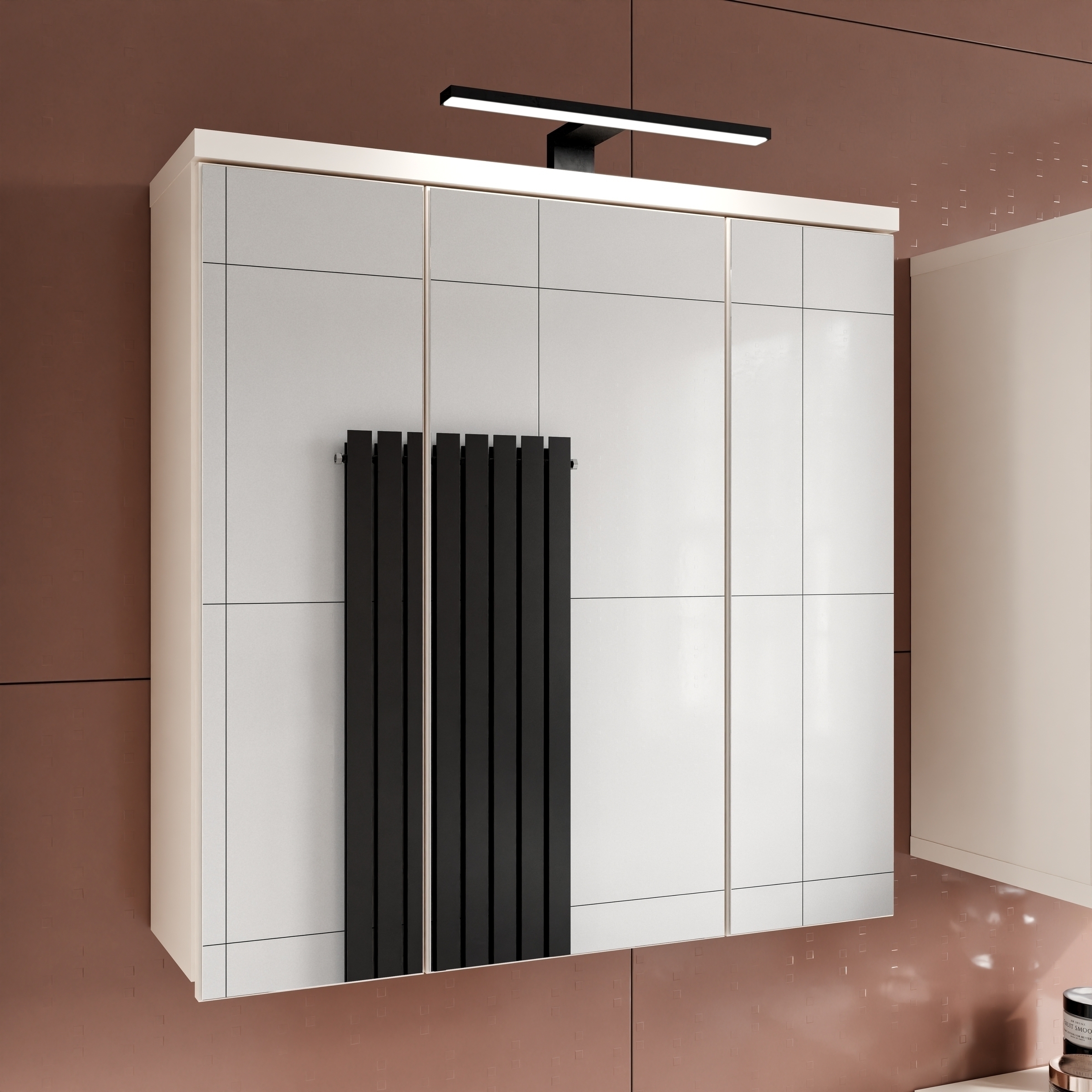 Acht praktische Innenfächer hinter drei Spiegeltüren helfen Ihnen, Pflegeprodukte übersichtlich und griffbereit zu verstauen.