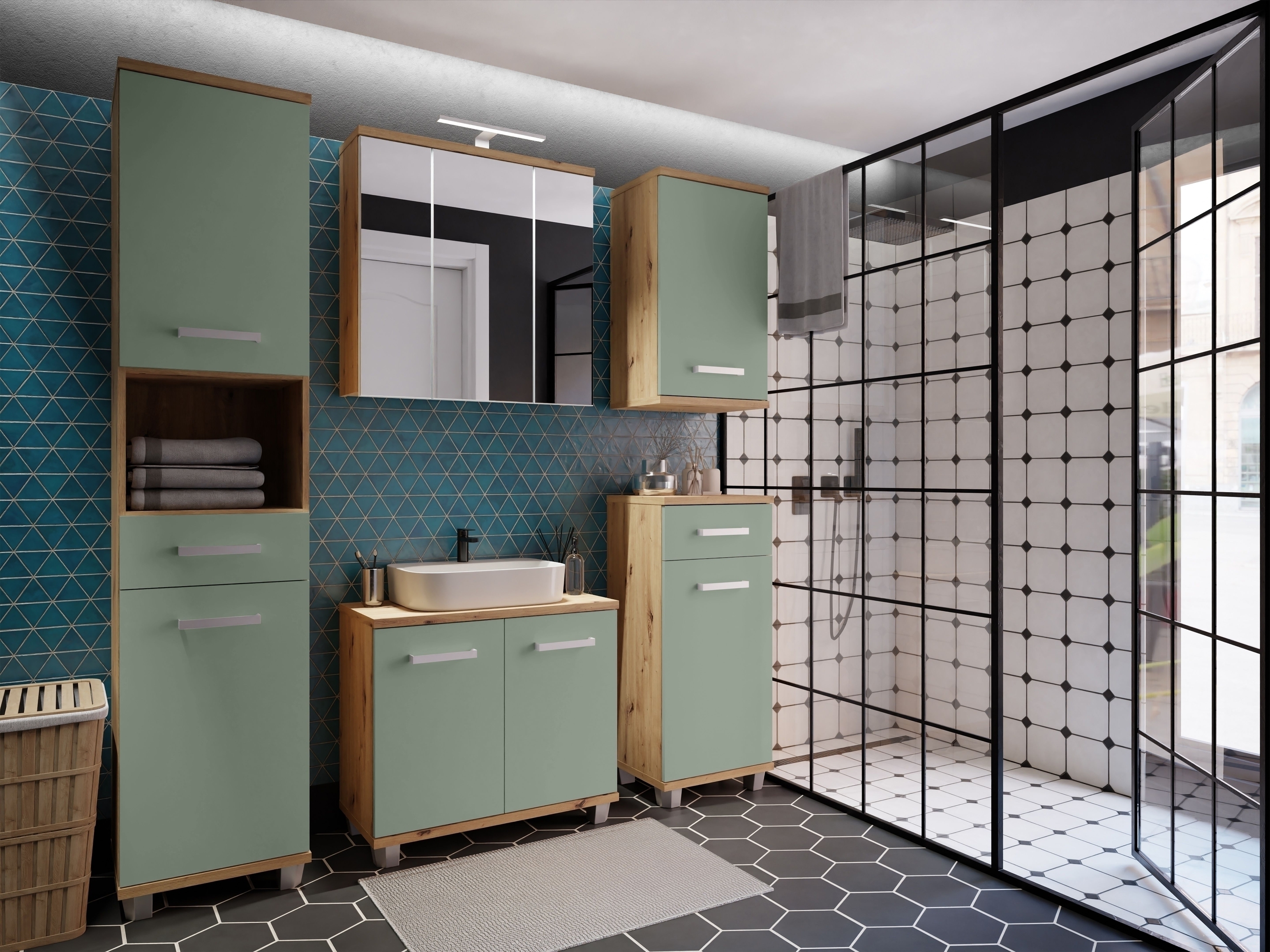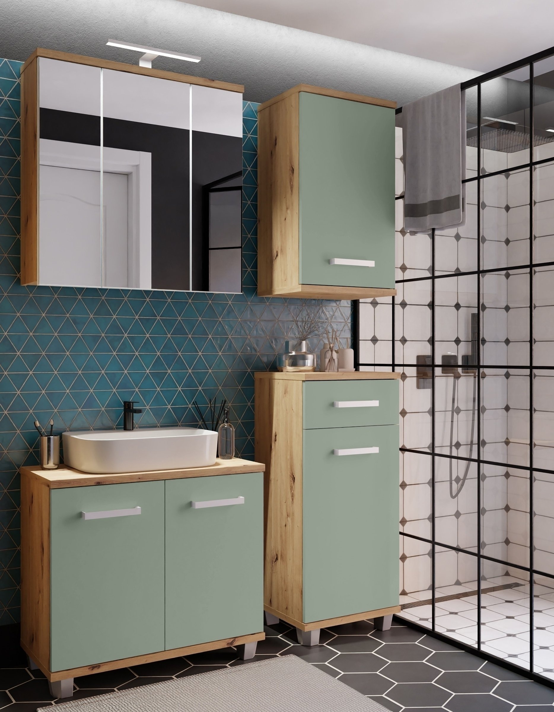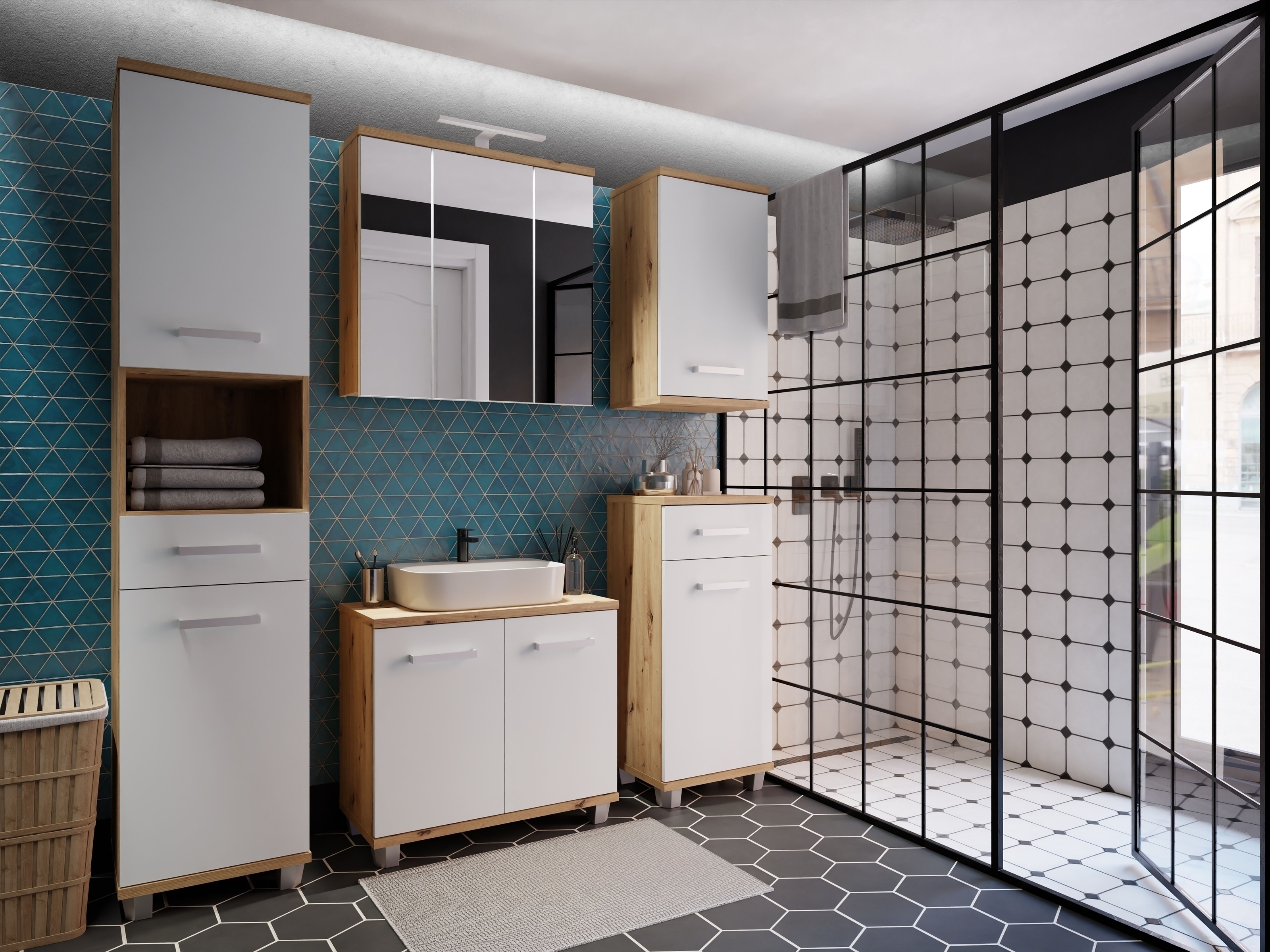 ✔Die Kombination aus Artisan Eiche und Secret Grey bringt einen modernen, warmen Look in Ihr Badezimmer.