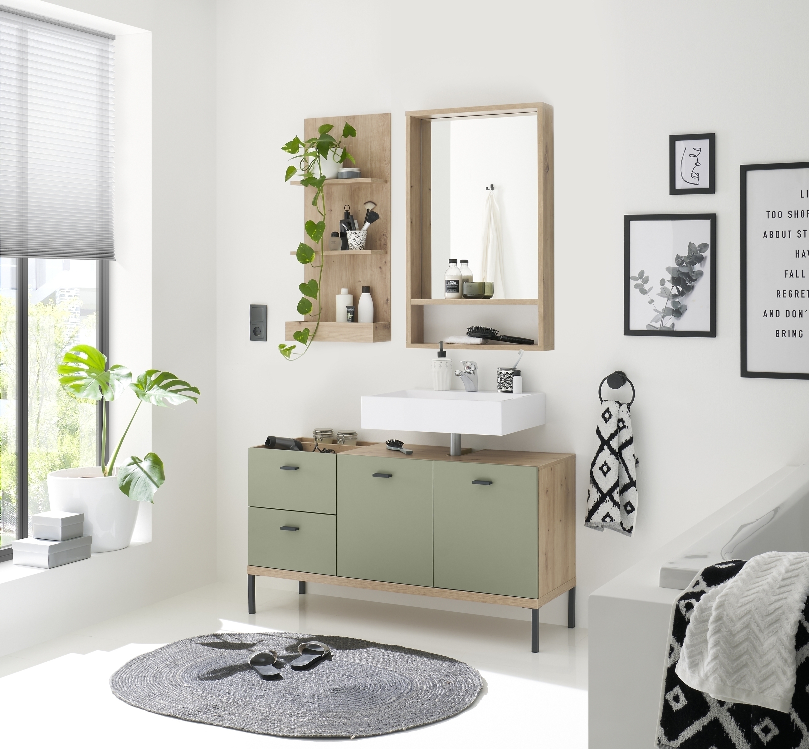 [Bullet-Point 4] => Durchdachtes Stauraumkonzept mit 2 Schubladen, 1 Tür mit Dämpfung und praktischen Ablagefächern – ideal zur geordneten Aufbewahrung von Badutensilien.