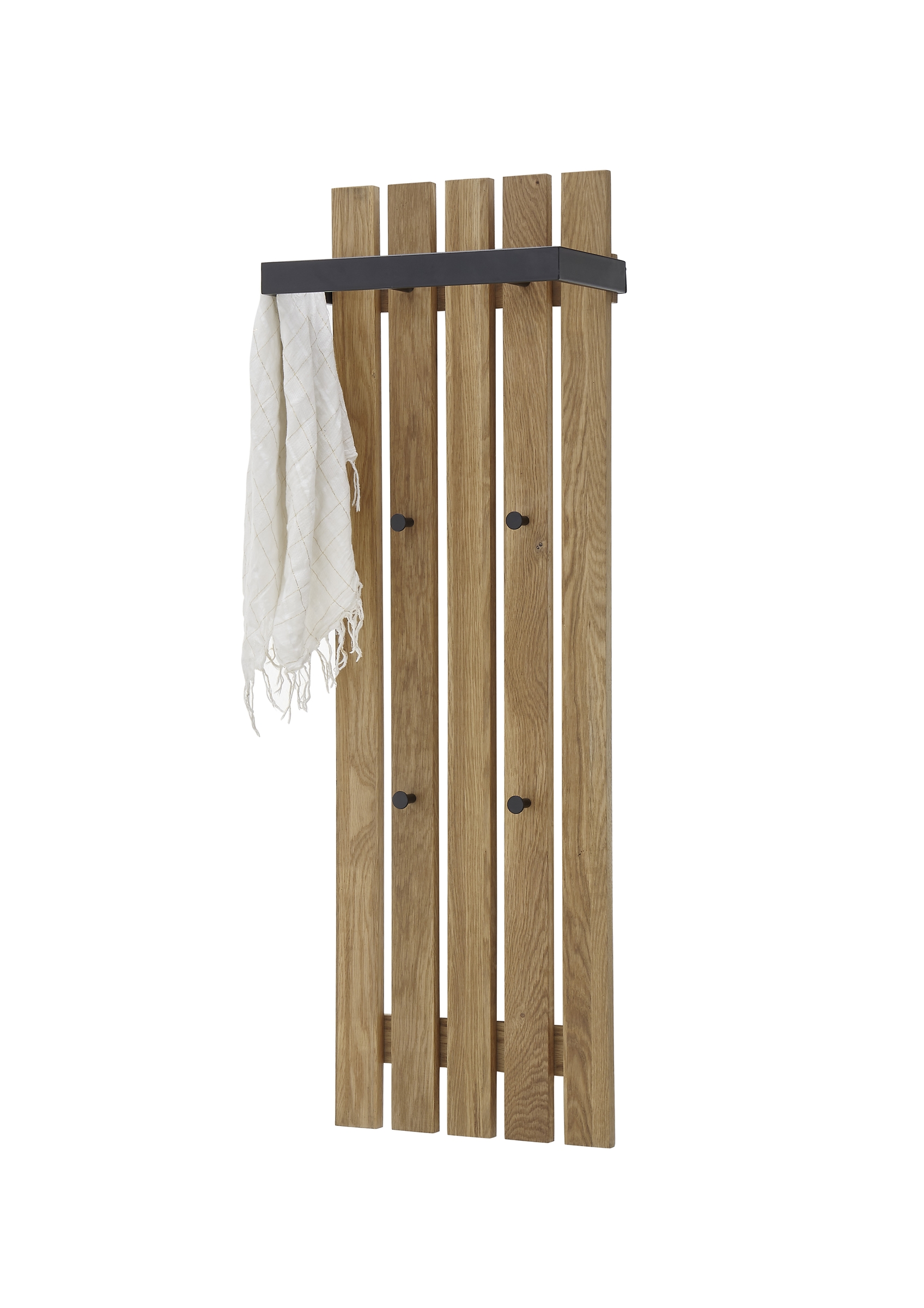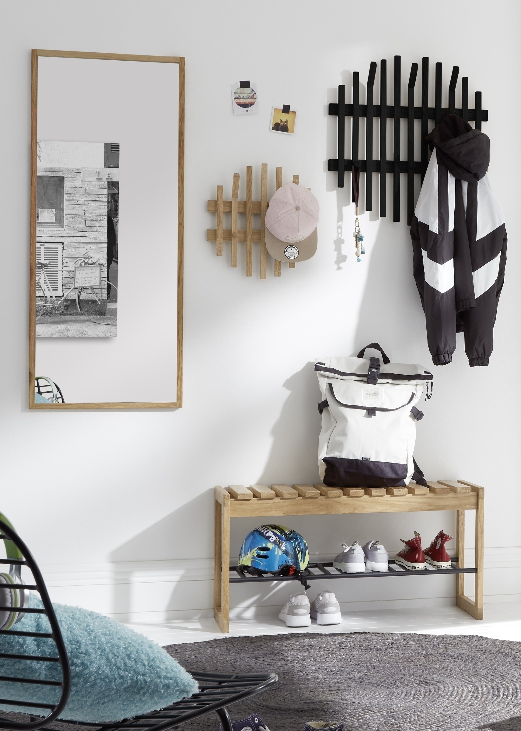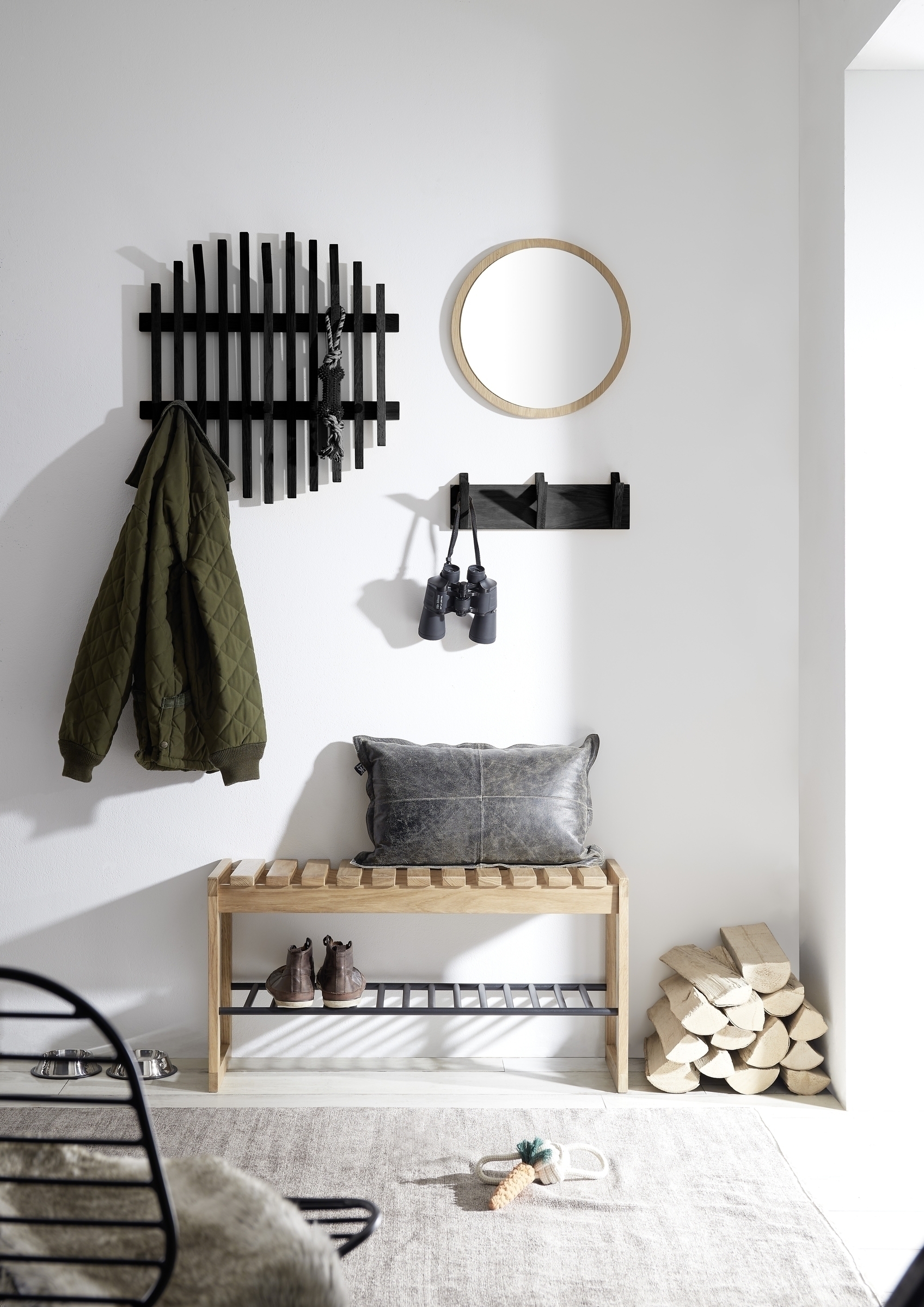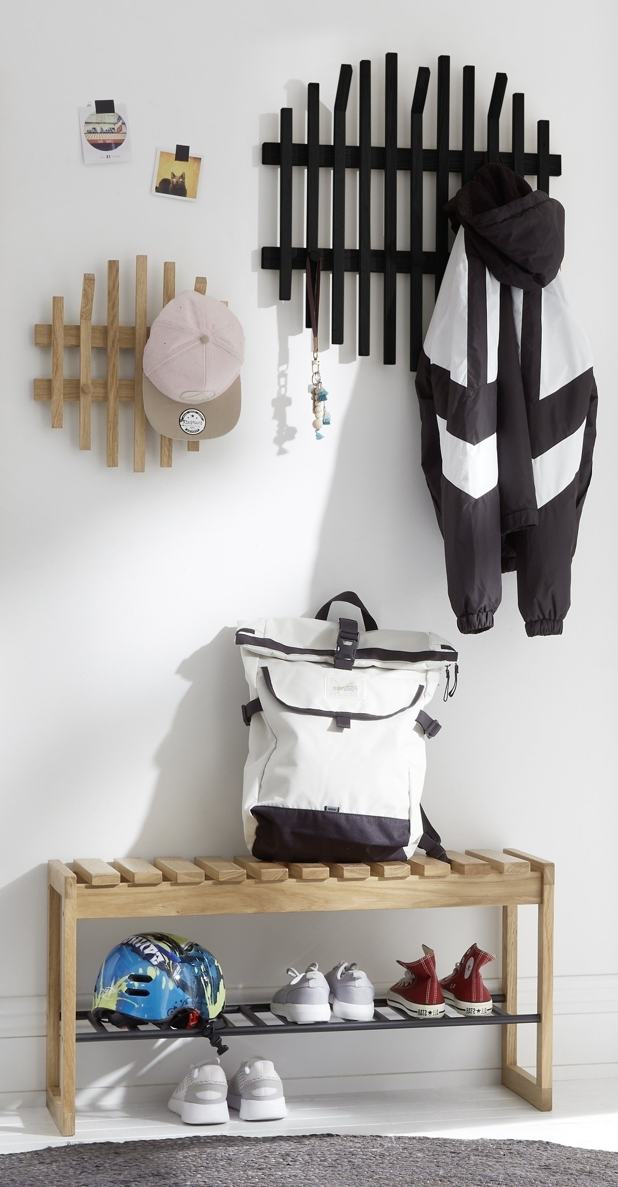 Fünf 60 mm breite, ungepolsterte Leisten bilden eine komfortable Sitzfläche, während darunter eine zusätzliche Ablage mit drei Leisten Stauraum für kleine Gegenstände wie Körbe, Schuhe oder Wohnaccessoires schafft. So verbinden Sie dekorative Optik mit funktionalem Mehrwert auf kleinem Raum.