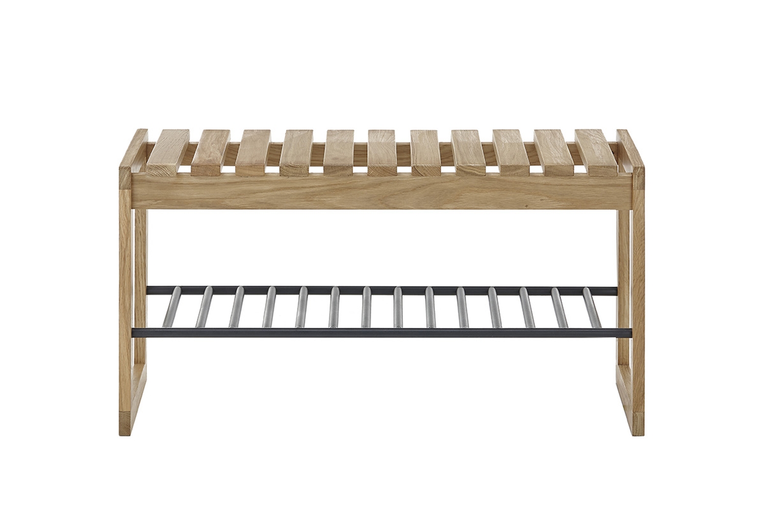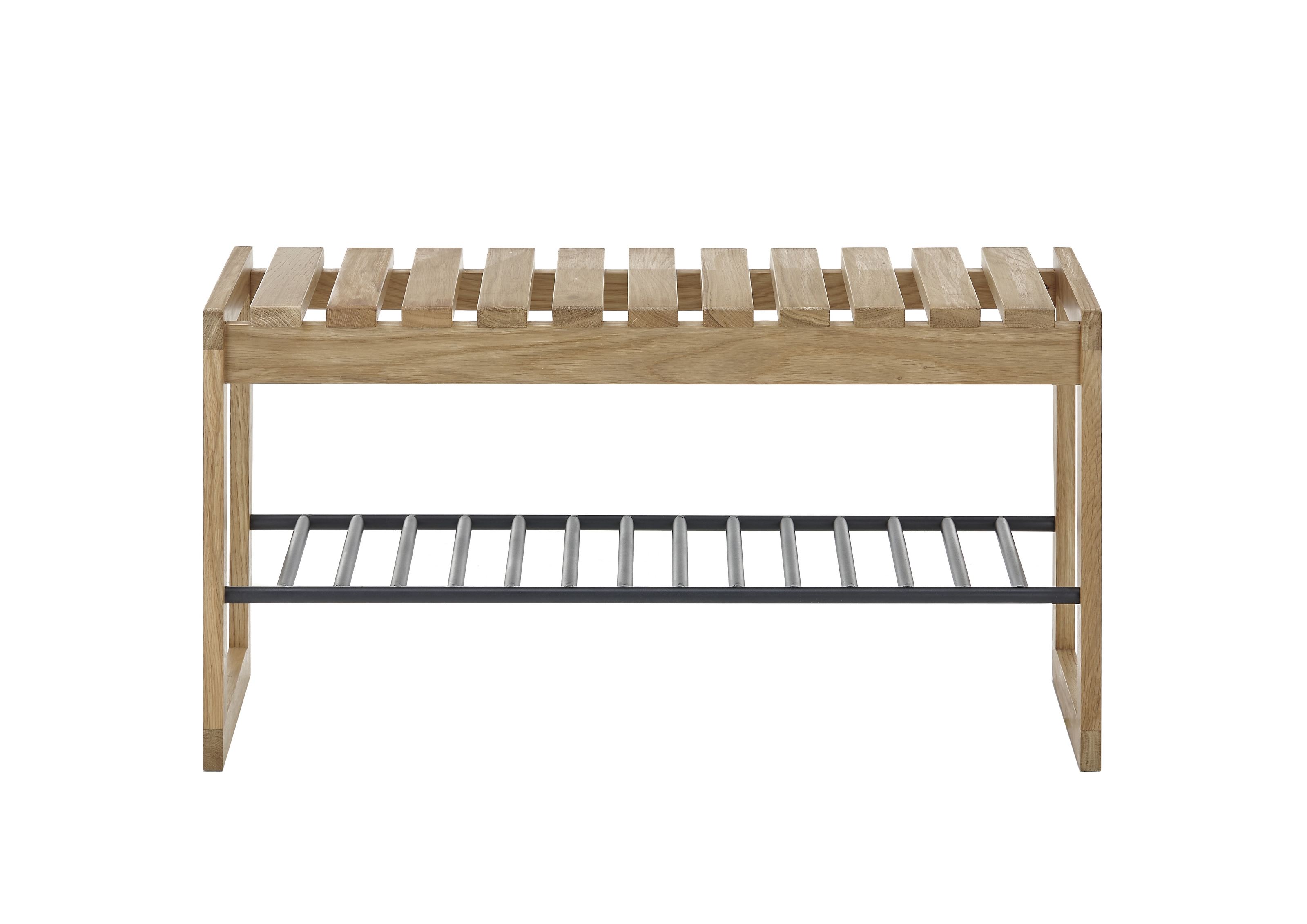 Die Sitzfläche besteht aus fünf jeweils 60 mm breiten Leisten, die eine stabile und bequeme Sitzposition ermöglichen und zugleich für eine klare, moderne Linienführung sorgen. Unterhalb der Sitzfläche bietet eine zusätzliche Ablage mit drei Leisten praktischen Stauraum, etwa für Schuhe, Aufbewahrungsboxen oder dekorative Körbe. So nutzen Sie auch kleine Flächen effektiv und halten den Raum optisch aufgeräumt.