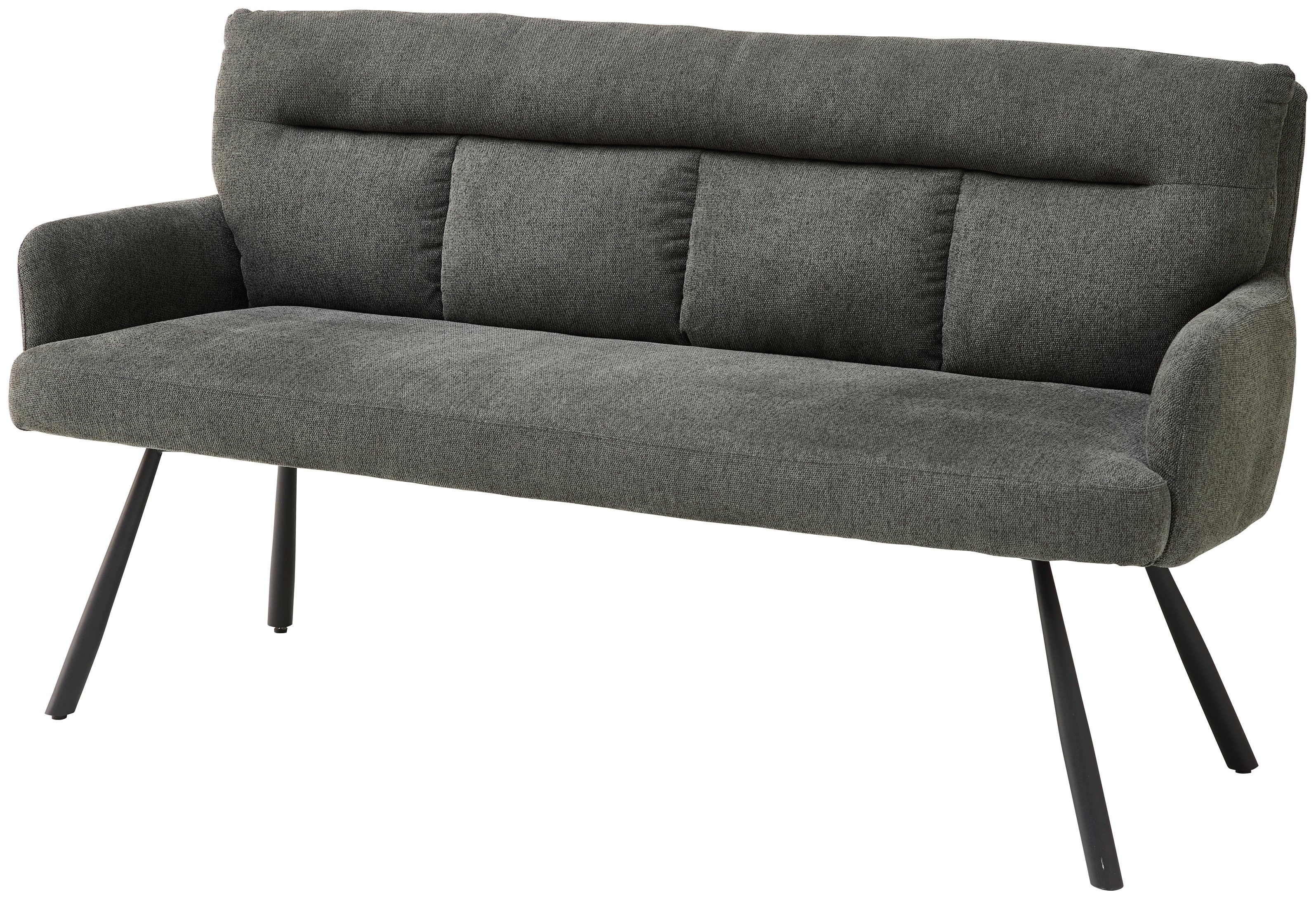Der grau melierte Chenillestoff bietet eine weiche, gemütliche Haptik und ist zugleich robust und pflegeleicht, während das schwarze Metallgestell mit vier Beinen für zuverlässige Stabilität sorgt. So entsteht eine moderne Kombination aus Komfort und klarer Linienführung – ideal für den täglichen Gebrauch vom Frühstück bis zum abendlichen Drink.