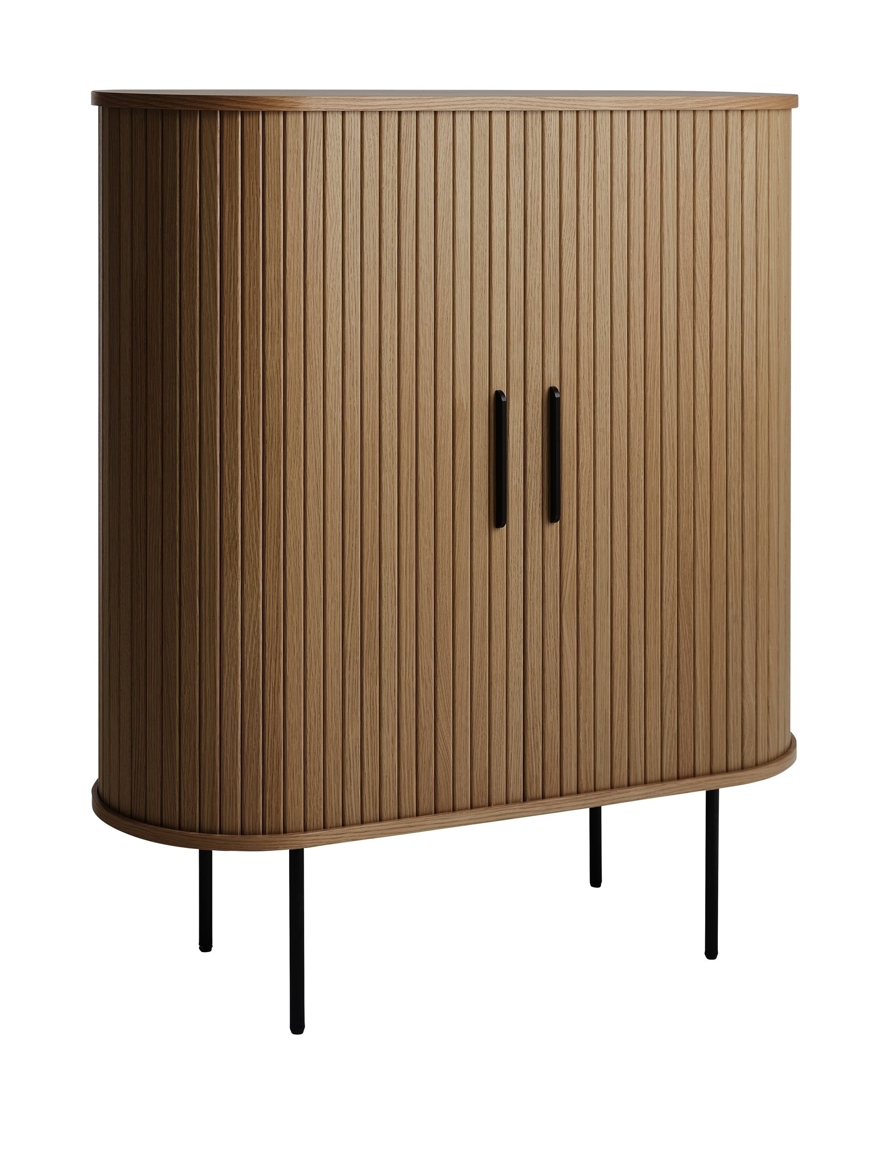 Die Kombination aus MDF mit Eichenfurnier in Eiche schwarz, schwarzen Stoffelementen und robusten Metallfüßen verleiht NOLA eine moderne, wohnliche Ausstrahlung. Der stabile Oberboden mit einer Belastbarkeit von bis zu 40 kg eignet sich hervorragend als Präsentationsfläche für Dekoration oder größere Flaschen und rundet das hochwertige Erscheinungsbild ab.