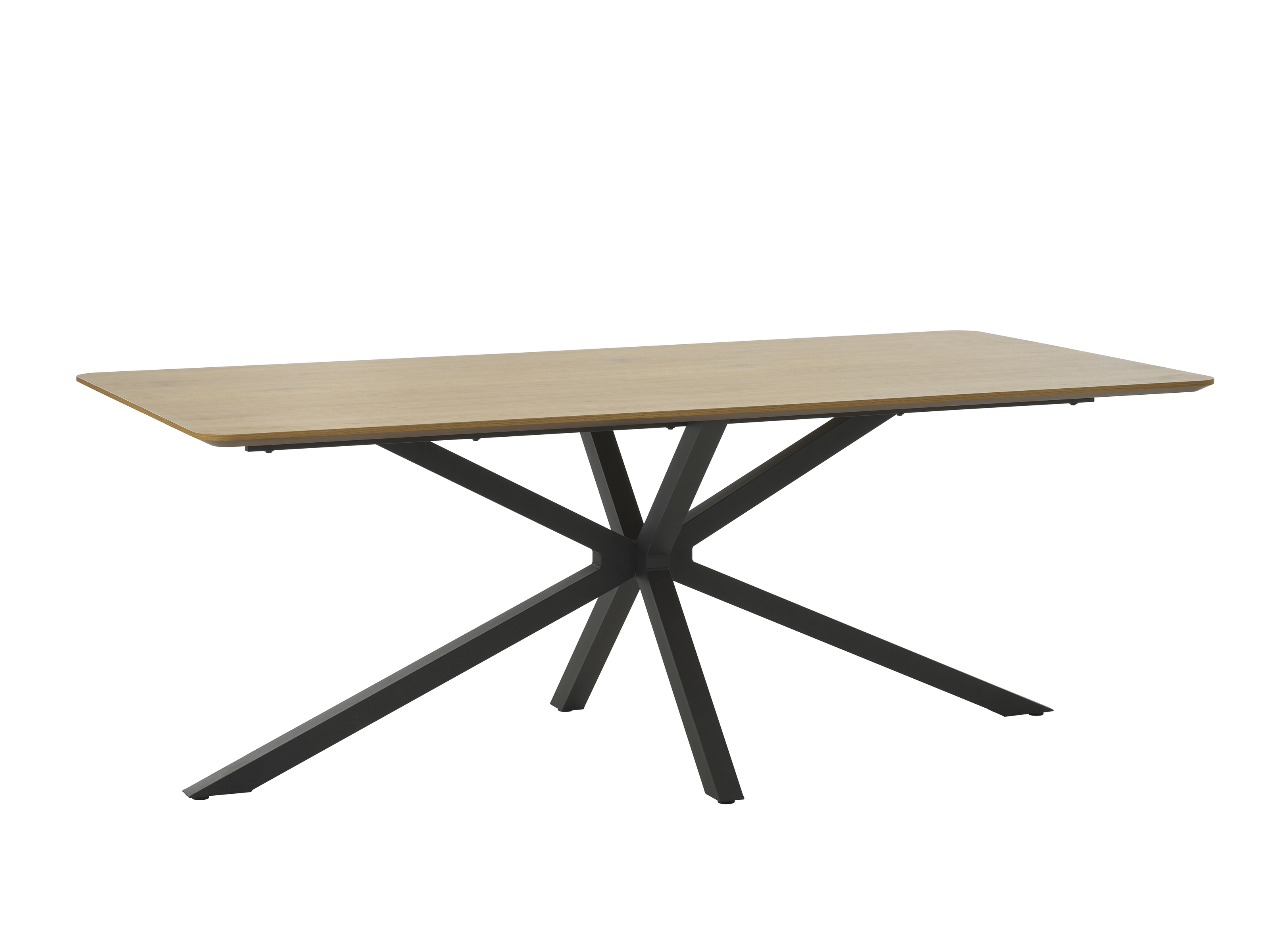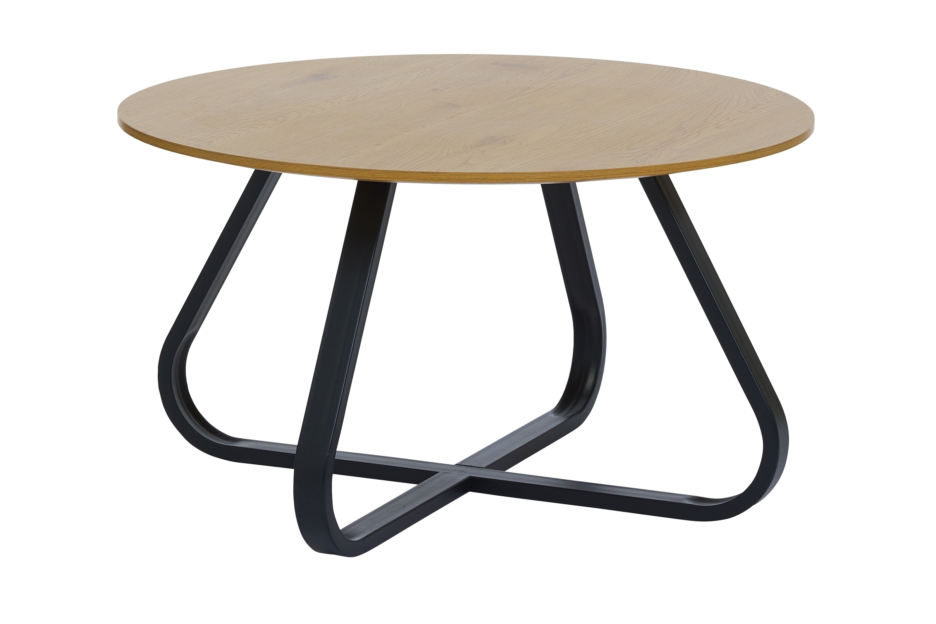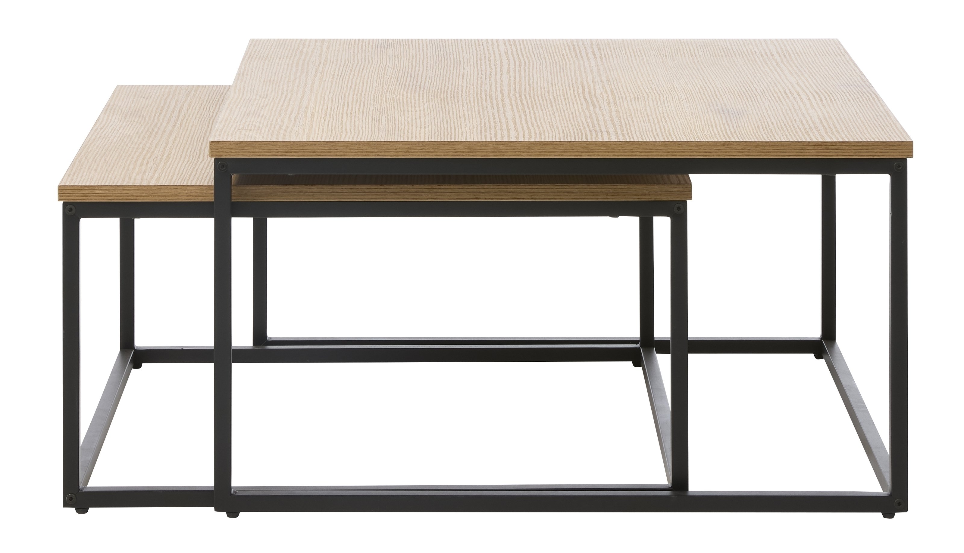 Die Tischplatte besteht aus einer melaminbeschichteten Eiche-Spanplatte, die die warme Ausstrahlung einer natürlichen Holzoptik mit einer robusten und pflegeleichten Oberfläche kombiniert. Getränke, Snacks oder dekorative Accessoires finden hier mühelos Platz. Das schwarze Gestell aus Metall setzt einen markanten Kontrast zur Holzoptik und verleiht dem Tisch seinen urbanen, industriellen Charakter.