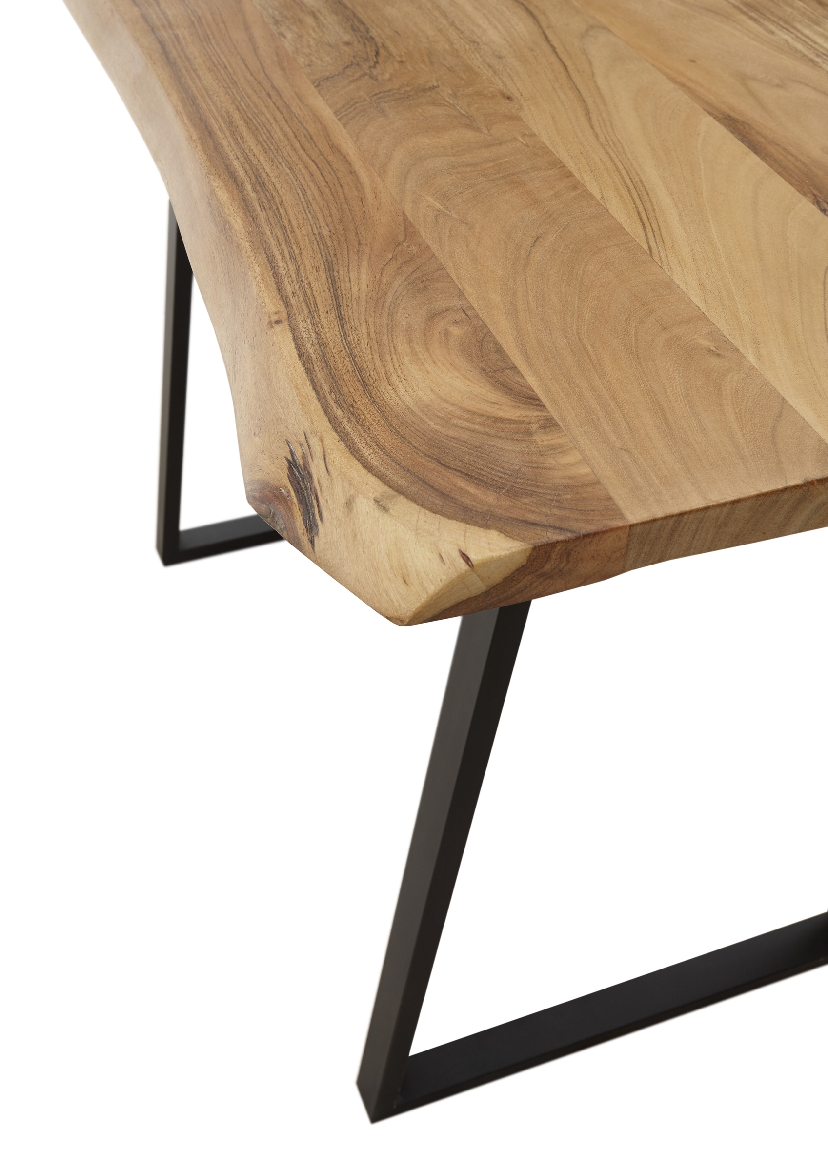 Die Tischplatte aus massiver Akazie und das Metallgestell in Schwarz sorgen für wertige Optik und eine solide Basis.