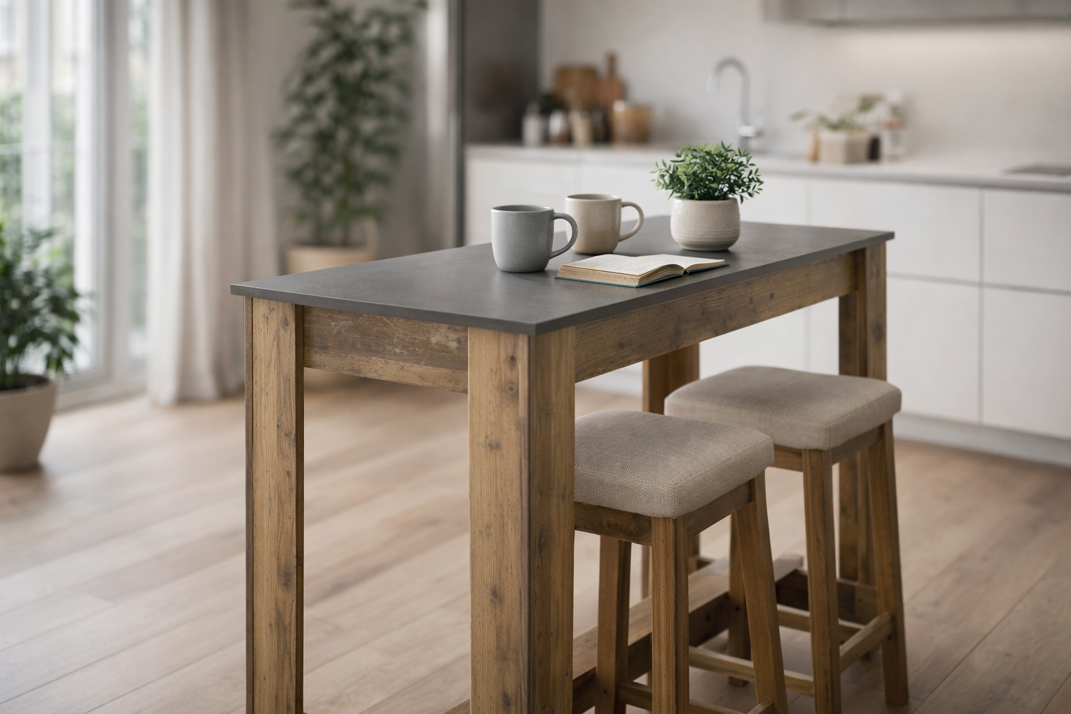 [Bullet-Point 1] => Der Bartisch hat die Maße 115 cm B x 103 cm H x 50 cm T und eignet sich perfekt für kleinere Räume wie Küchen, Esszimmer oder offene Wohnbereiche.