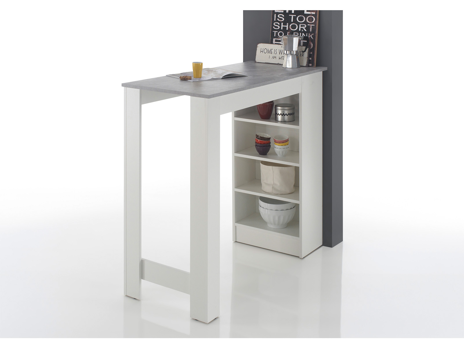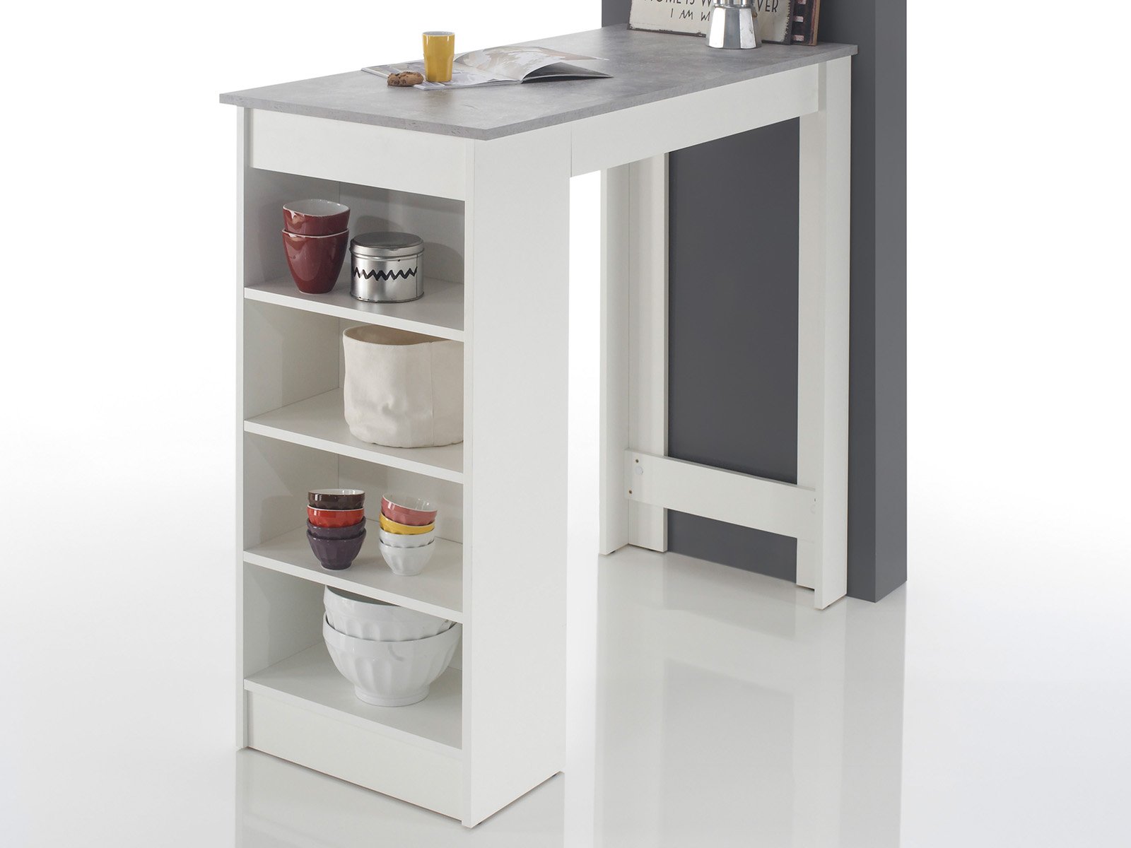 Gefertigt wird der Bartisch aus Spanplatte, wodurch er vergleichsweise leicht, aber dennoch robust im Alltag ist. Die Tischplatte in moderner Beton Nachbildung und das weiße Gestell sorgen für einen zeitgemäßen Look, der vielen Einrichtungsstilen gerecht wird und dem Raum eine helle, freundliche Atmosphäre verleiht.