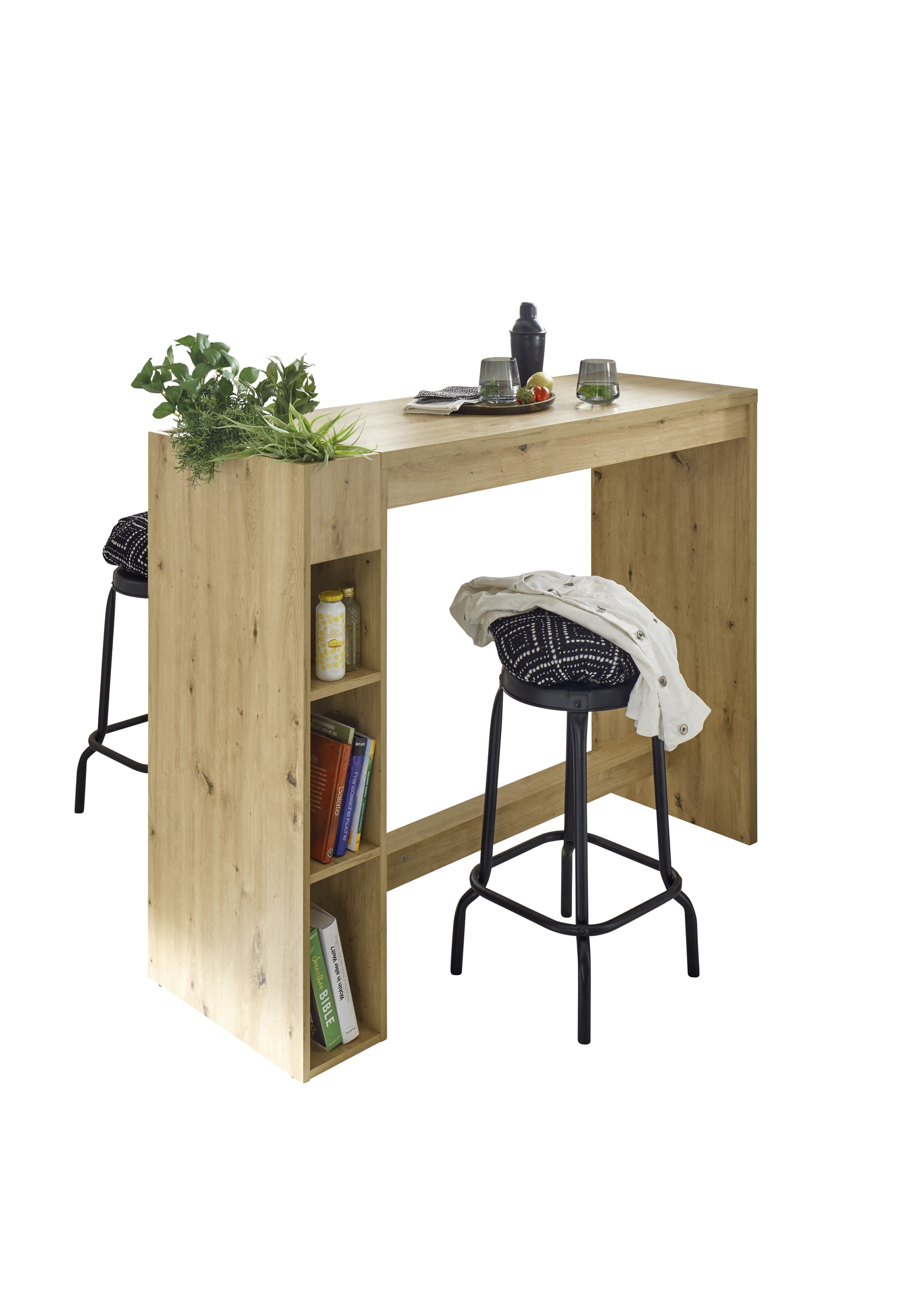 Ein besonderes Plus sind die drei offenen Fächer an der Seite des Bartisches. Hier finden Gläser, Flaschen, Geschirr oder kleine Küchenhelfer ihren festen Platz, sodass die Tischplatte ordentlich und aufgeräumt bleibt. Gerade in kleineren Wohnungen oder offenen Wohnküchen sorgt diese Lösung für zusätzlichen Stauraum und mehr Struktur.