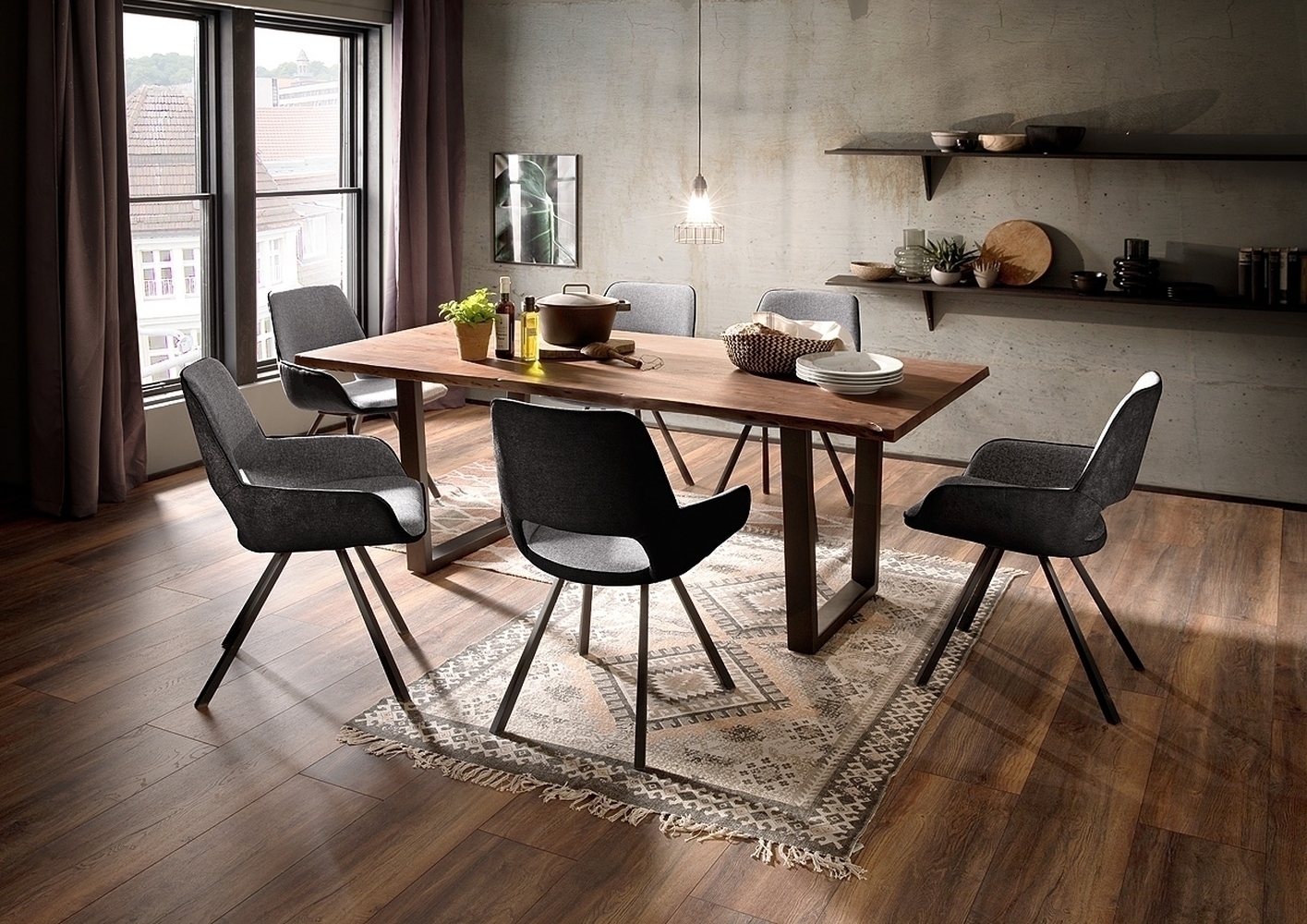 Mit seinem natürlich-modernen Wohnstil fügt sich der Baumkantentisch „Calabria“ mühelos in viele Einrichtungskonzepte ein und wird zum zentralen Treffpunkt im Esszimmer oder offenen Wohn-Ess-Bereich.
