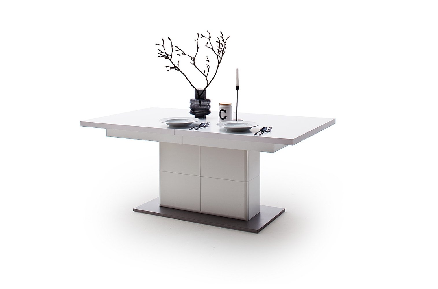 [BulletPoints] => Moderner Esstisch mit Synchronauszug und 2 innenliegenden Einlegeplatten;Tischsäule in MDF und FPY weiß matt melamin Nachbildung;Tischplatte in FPY weiß matt Melamin Nachbildung;Bodenplatte in Grau Melamin Nachbildung;Breite 180 (280) cm, Höhe 77 cm, Tiefe 100 cm