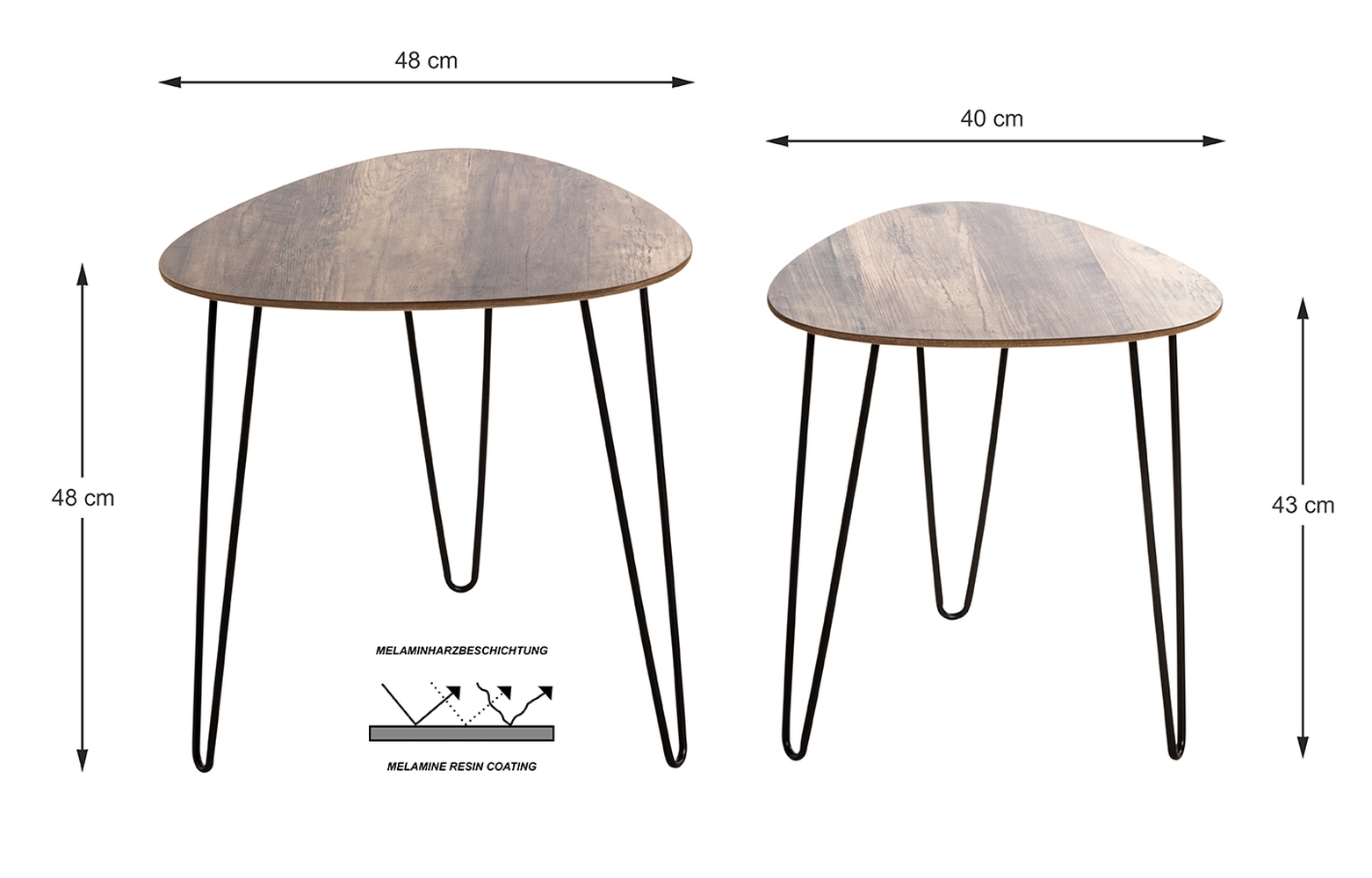 Die Ablagen bestehen aus melaminharzbeschichtetem MDF und sind damit wasserabweisend, kratzfest und UV-beständig. Diese Eigenschaften machen die Oberflächen besonders pflegeleicht und robust im Alltag. Leichte Verschmutzungen lassen sich einfach abwischen, sodass die Beistelltische lange ihre ansprechende Optik behalten.