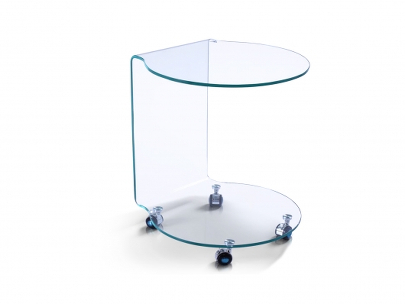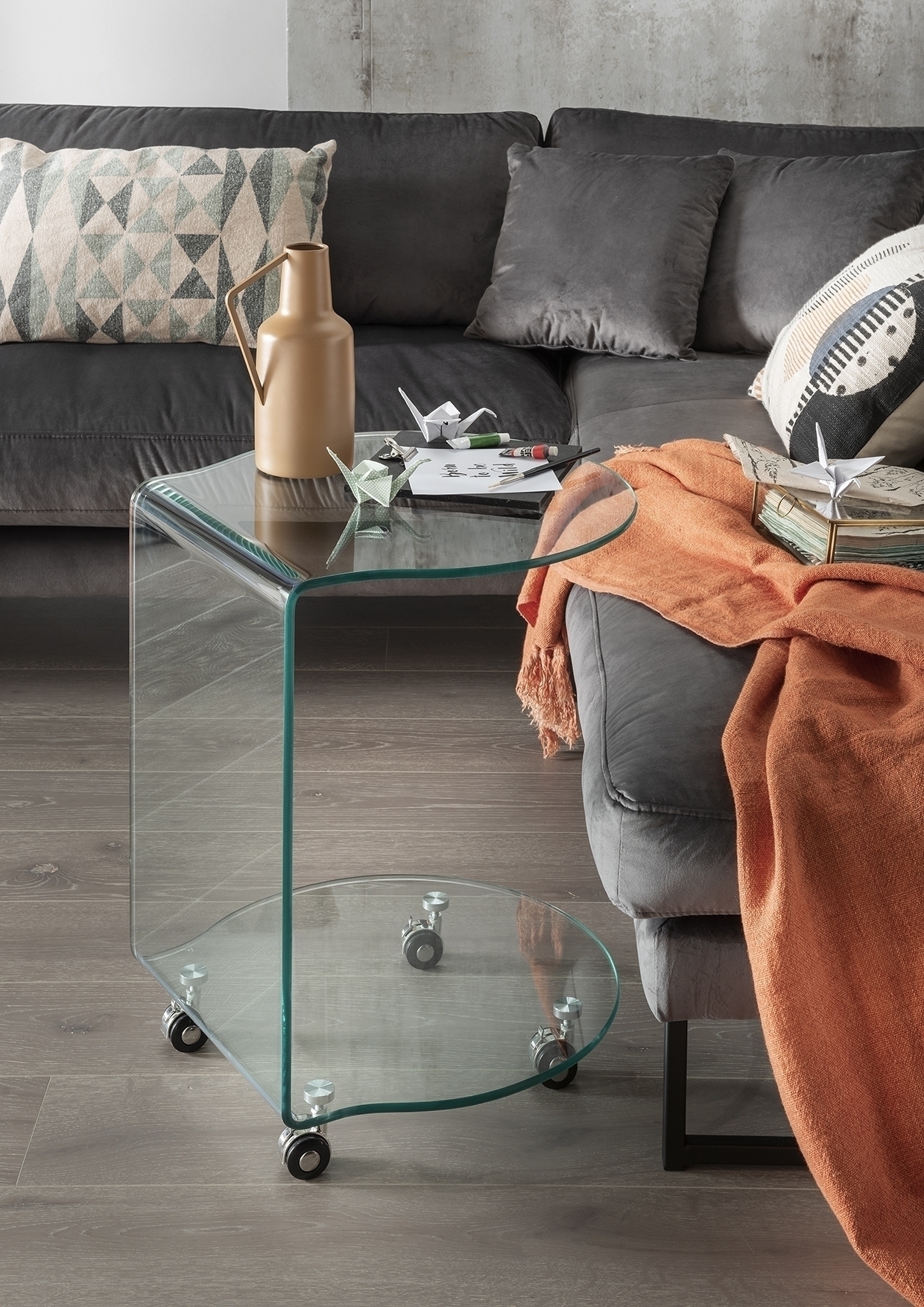 Ein besonderes Designelement ist das formgebogene Glas, das dem Möbelstück eine geschwungene, elegante Silhouette verleiht und es deutlich von herkömmlichen Beistelltischen abhebt. Die klare Glasoptik macht den Tisch vielseitig kombinierbar mit unterschiedlichen Einrichtungsstilen.